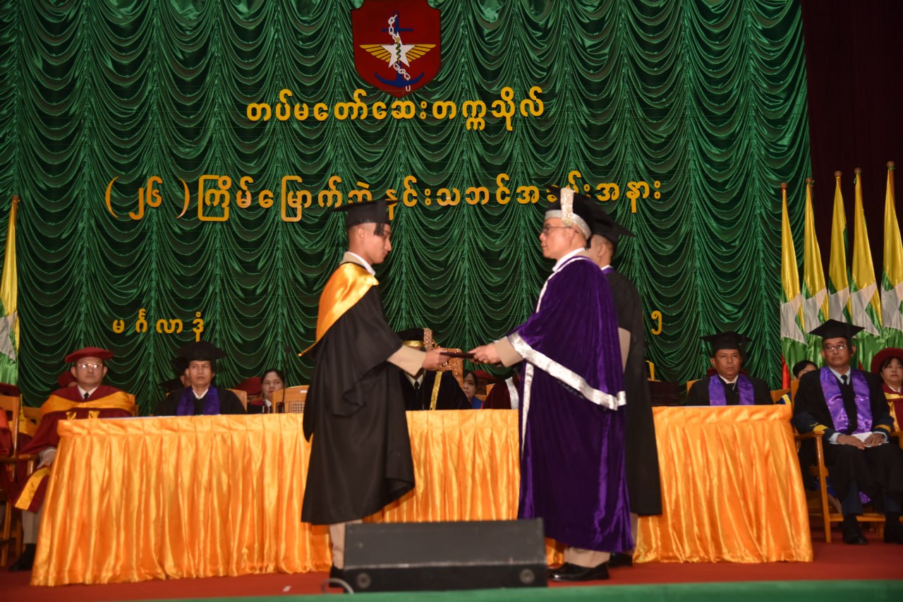 တပ်မတော်ဆေးတက္ကသိုလ်၏(၂၆)ကြိမ်မြောက် ဘွဲ့နှင်းသဘင်အခမ်းအနားကို ယနေ့နေ့လယ် ပိုင်းတွင် ရန်ကုန်တိုင်းဒေသကြီး၊ မင်္ဂလာဒုံမြို့နယ်ရှိ တပ်မတော်ဆေးတက္ကသိုလ် ဘွဲ့နှင်းသဘင်ခန်းမ၌ ကျင်းပရာ တပ်မတော်ဆေးတက္ကသိုလ်ကျောင်းအုပ်ကြီး ဗိုလ်မှူးချုပ် စိုးညွန့်၊ တပ်မတော်ဆေးတက္ကသိုလ် ပါမောက္ခချုပ် ဗိုလ်မှူးချုပ်ခင်အောင်ထွန်းနှင့် တပ်မတော်ဆေးတက္ကသိုလ်မှ ပညာရေးအဖွဲ့ဝင်များ စုံညီစွာတက်ရောက်ကြသည်။