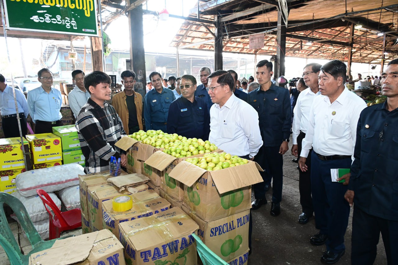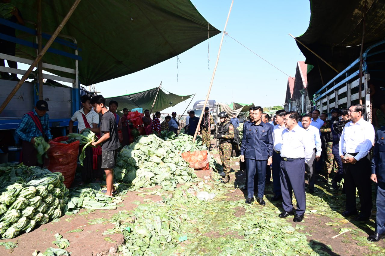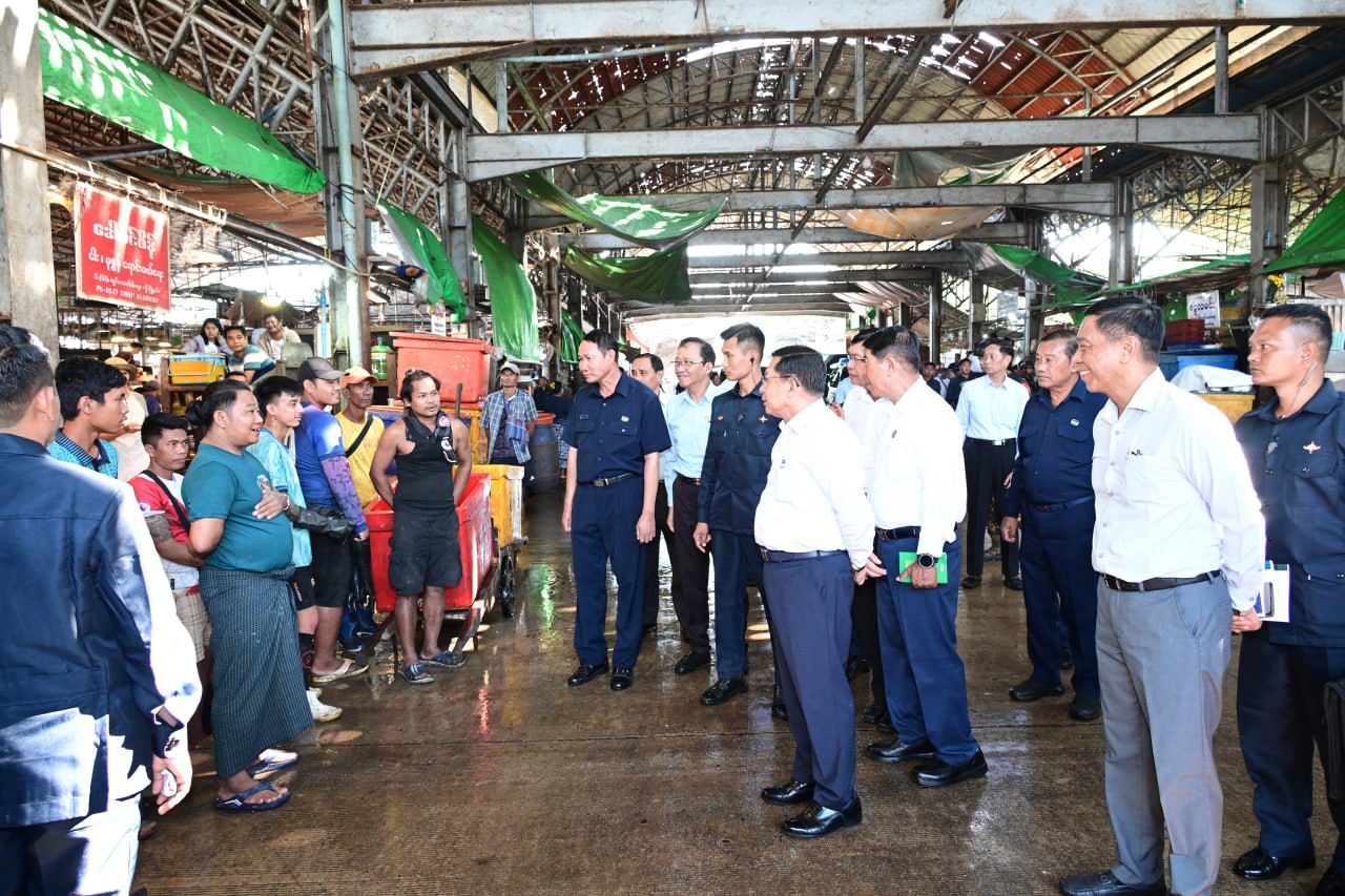 ထို့နောက် နိုင်ငံတော်ယာယီသမ္မတ နိုင်ငံတော်လုံခြုံရေးနှင့် အေးချမ်းသာယာရေး ကော်မရှင်ဥက္ကဋ္ဌ သည် အဖွဲ့ဝင်များလိုက်ပါ၍ လှိုင်မြို့နယ်ရှိ သီရိမင်္ဂလာဈေးနှင့် ရွှေပိတောက်ငါးဈေး တို့သို့ သွားရောက်ကြည့်ရှုစစ်ဆေးသည်။