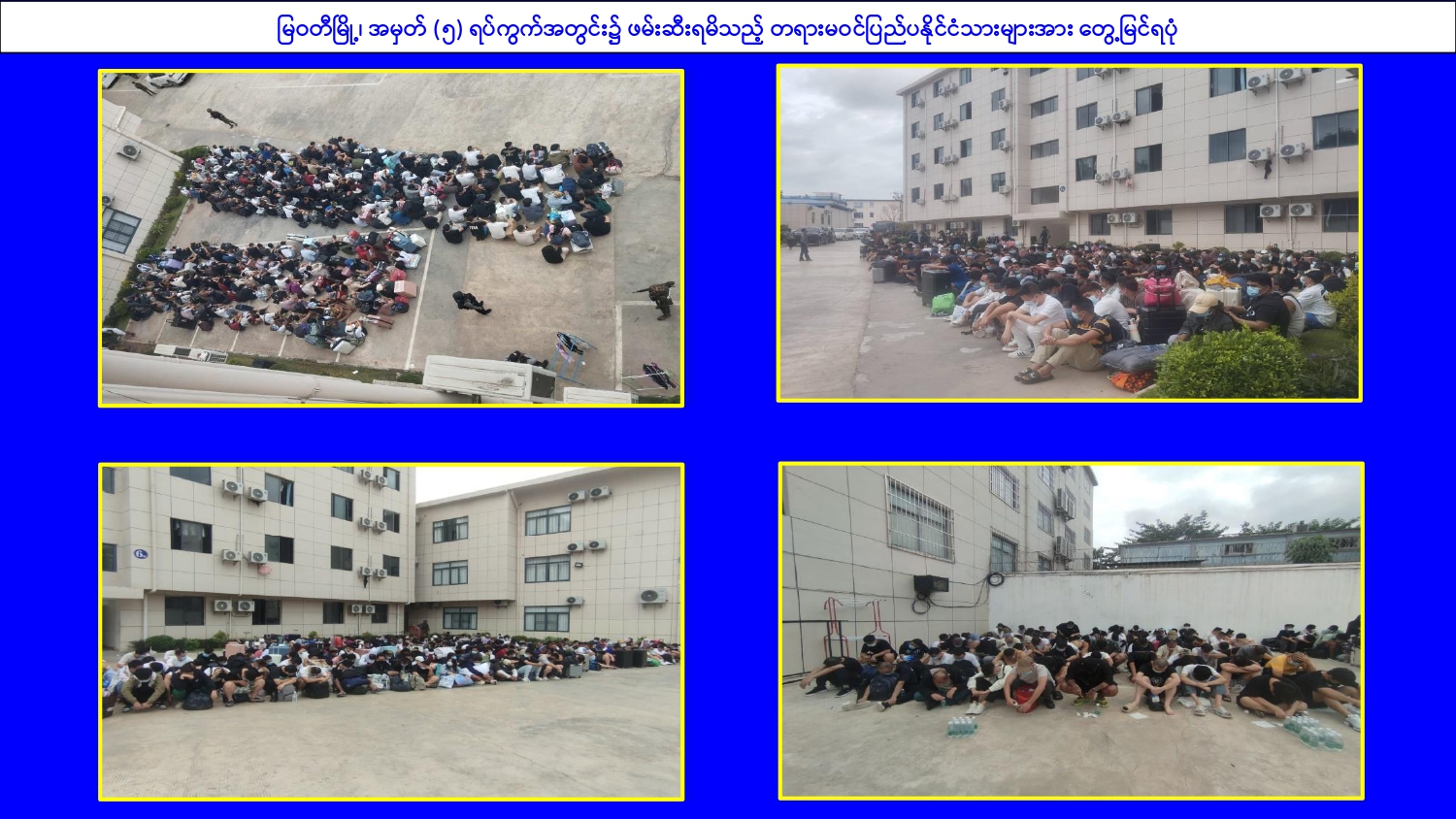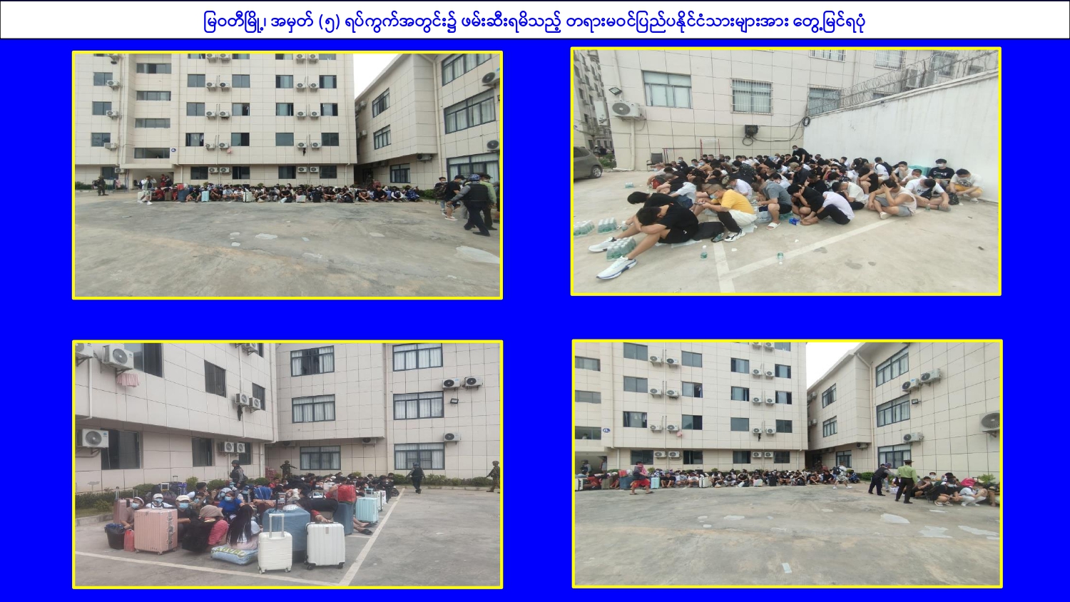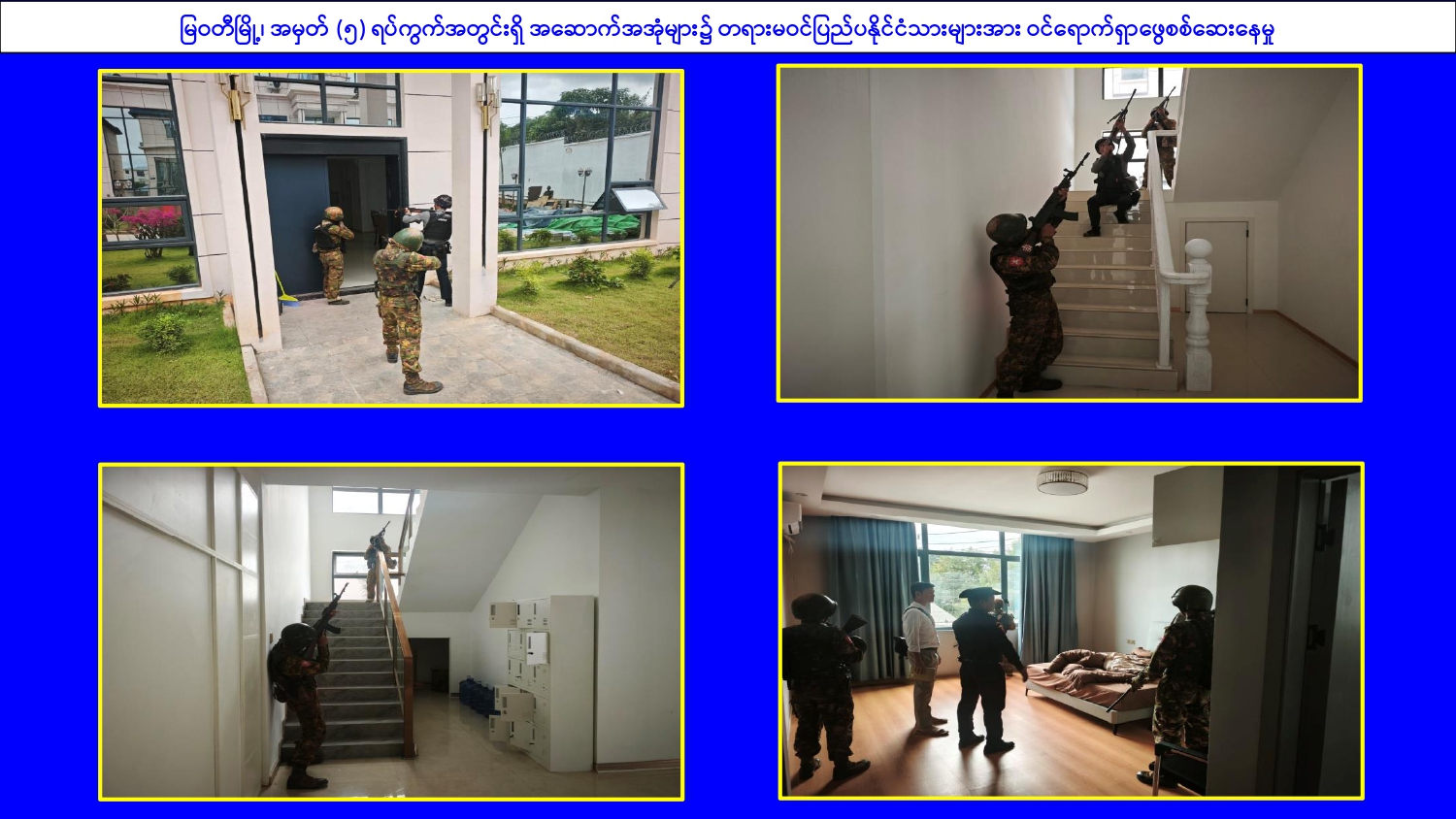 ထို့ပြင် ကရင်ပြည်နယ်၊ မြဝတီမြို့နှင့် ပတ်ဝန်းကျင်ဒေသတစ်ဝိုက်ရှိ အဆောက် အအုံများ၌ တရားမဝင်ပြည်ပနိုင်ငံသားများ ဝင်ရောက်နေထိုင်ခြင်းနှင့် အွန်လိုင်းလိမ်လည် လောင်းကစားမှုများ လုပ်ကိုင်ဆောင်ရွက်ခြင်း မရှိစေရေးအတွက် လုံခြုံရေးတပ်ဖွဲ့ဝင်များ၊ အုပ်ချုပ်ရေးအဖွဲ့အစည်းများနှင့် ဒေသတွင်းတာဝန်ရှိသူများအပါအဝင် အဖွဲ့စုံပါဝင်သည့် ပူးပေါင်းအဖွဲ့ဖြင့် ဒီဇင်ဘာ ၈ ရက်မှ စတင်၍ ရှာဖွေရှင်းလင်းဆောင်ရွက်ခဲ့ရာ ယနေ့တွင် လည်း မြဝတီမြို့၊ အမှတ်(၅) ရပ်ကွက်အတွင်းရှိ အဆောက်အအုံ ၁၅ လုံးကို ထပ်မံစစ် ဆေးနိုင်ခဲ့ပြီး အဆိုပါအဆောက်အအုံများ အနက်မှ ၄ ထပ်အဆောက်အအုံတစ်လုံးနှင့် ၆ ထပ်အဆောက်အအုံ တစ်လုံးတို့အတွင်း၌ အွန်လိုင်းလိမ်လည်လောင်းကစားမှုပြုလုပ်ရာ တွင် အသုံးပြုသည့် ကွန်ပျူတာ ၅၅၀ လုံးနှင့်အတူ တရုတ်နိုင်ငံသား ၂၂၅ ဦး၊ ဗီယက်နမ်နိုင်ငံသား ၈၃ ဦး၊ မလေးရှားနိုင်ငံသား ၉ ဦး၊ ကင်ညာနိုင်ငံသား ၃၉ ဦး၊ အီသီယိုးပီးယားနိုင်ငံသား ၁၁ ဦး၊ အင်ဒိုနီးရှားနိုင်ငံသား ၁၂ ဦး၊ ယူဂန်ဒါနိုင်ငံသား ၂၀ ဦး၊ နီပေါနိုင်ငံသား ၁၇ ဦး၊ အိန္ဒိယနိုင်ငံသား ၄ ဦး၊ ဖိလစ်ပိုင် နိုင်ငံသား ၇၇ ဦး၊ ဆီးရီးယားလီယွန်နိုင်ငံသား ၃ ဦး၊ ထိုင်းနိုင်ငံသား ၁၀ ဦး၊ တရုတ်(တိုင် ပေ)နိုင်ငံသား ၂ ဦး၊ မာဒါဂတ်စတာနိုင်ငံသား ၁ ဦး၊ တိုဂိုနိုင်ငံသား ၁ ဦး၊ အီကွေတိုးရီးယားဂီနီနိုင်ငံသား ၂ ဦး၊ စုစုပေါင်း တရားမဝင်နိုင်ငံခြားသား ၅၁၆ ဦးတို့အား ဖော်ထုတ်ဖမ်းဆီးရမိ ခဲ့ကြောင်း သိရှိရသည်။