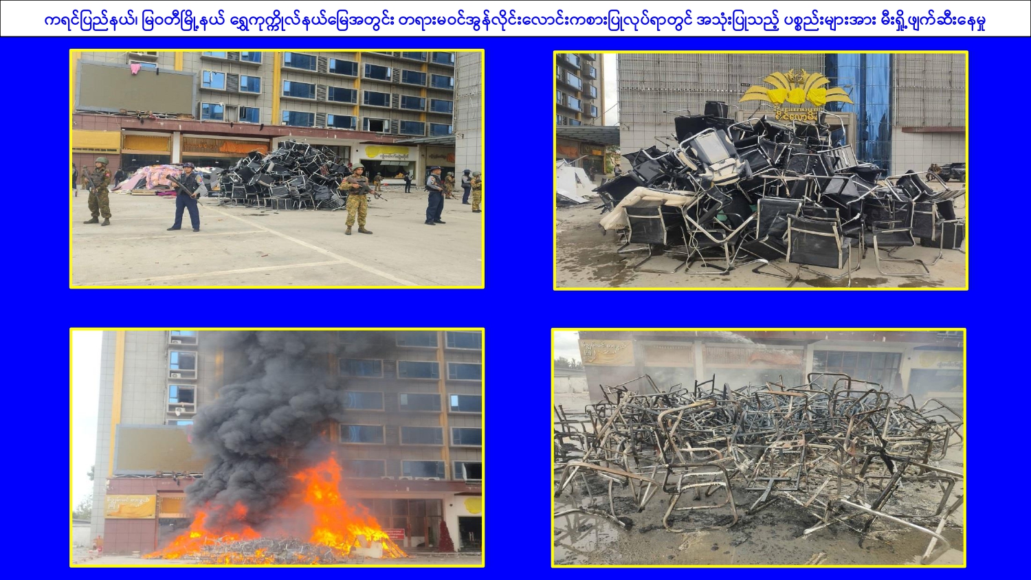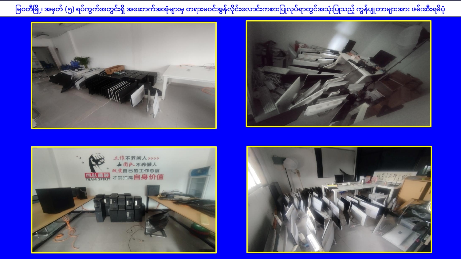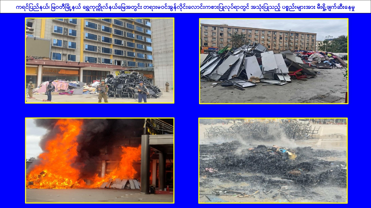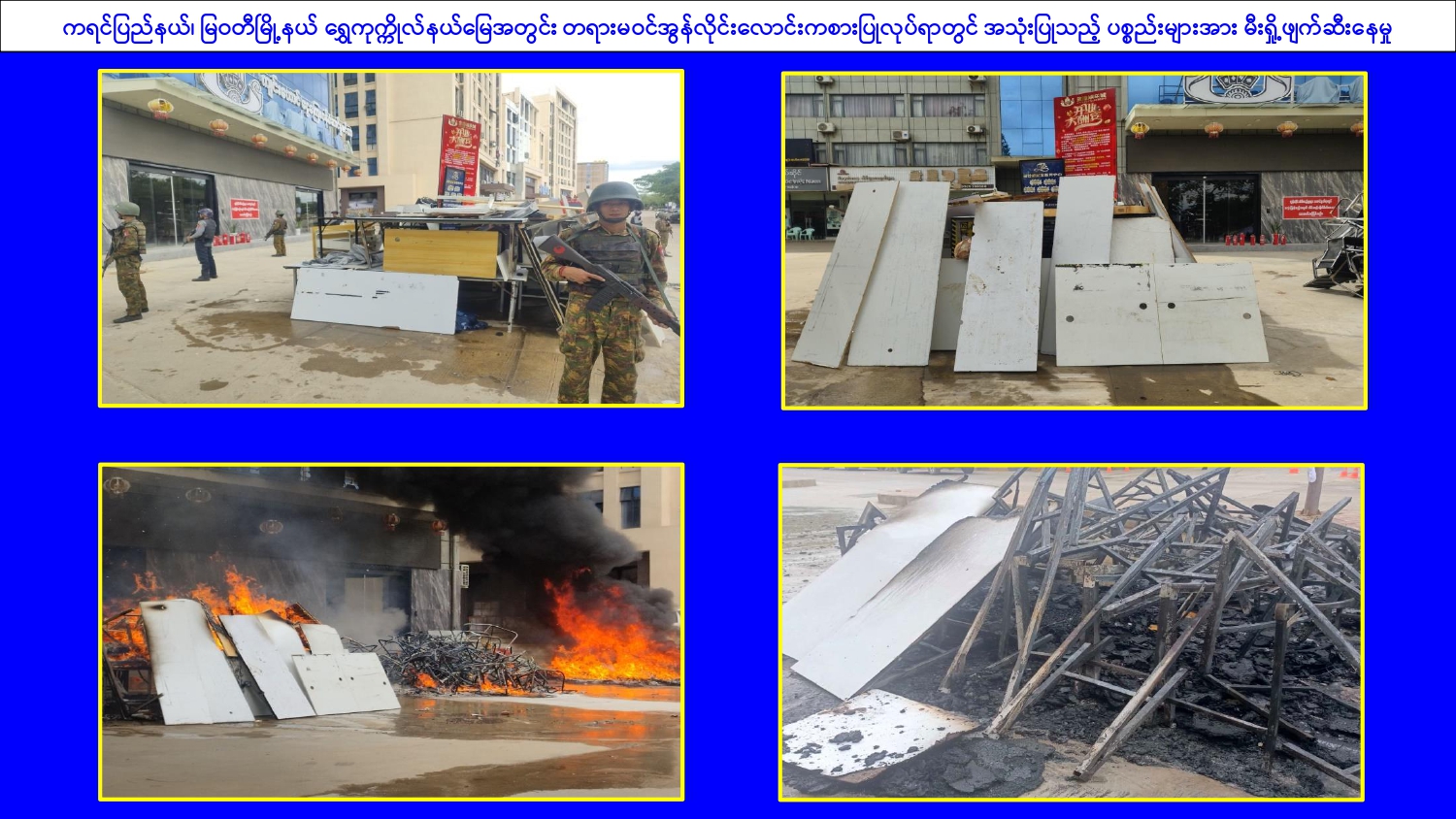 ၎င်းအပြင် မြဝတီမြို့နယ်အတွင်းရှိ KK Park နယ်မြေနှင့် ရွှေကုက္ကိုလ်နယ်မြေတို့၌ အွန်လိုင်းလိမ်လည်လောင်းကစားမှုကျူးလွန်ရာတွင် အသုံးပြုသည့်ပစ္စည်းများအား ထပ်မံ ၍ အသုံးပြုနိုင်ခြင်းမရှိစေရန်အတွက်ယနေ့တွင်လည်း စနစ်တကျ မီးရှို့ဖျက်ဆီးခဲ့ကြောင်း သိရှိရသည်။