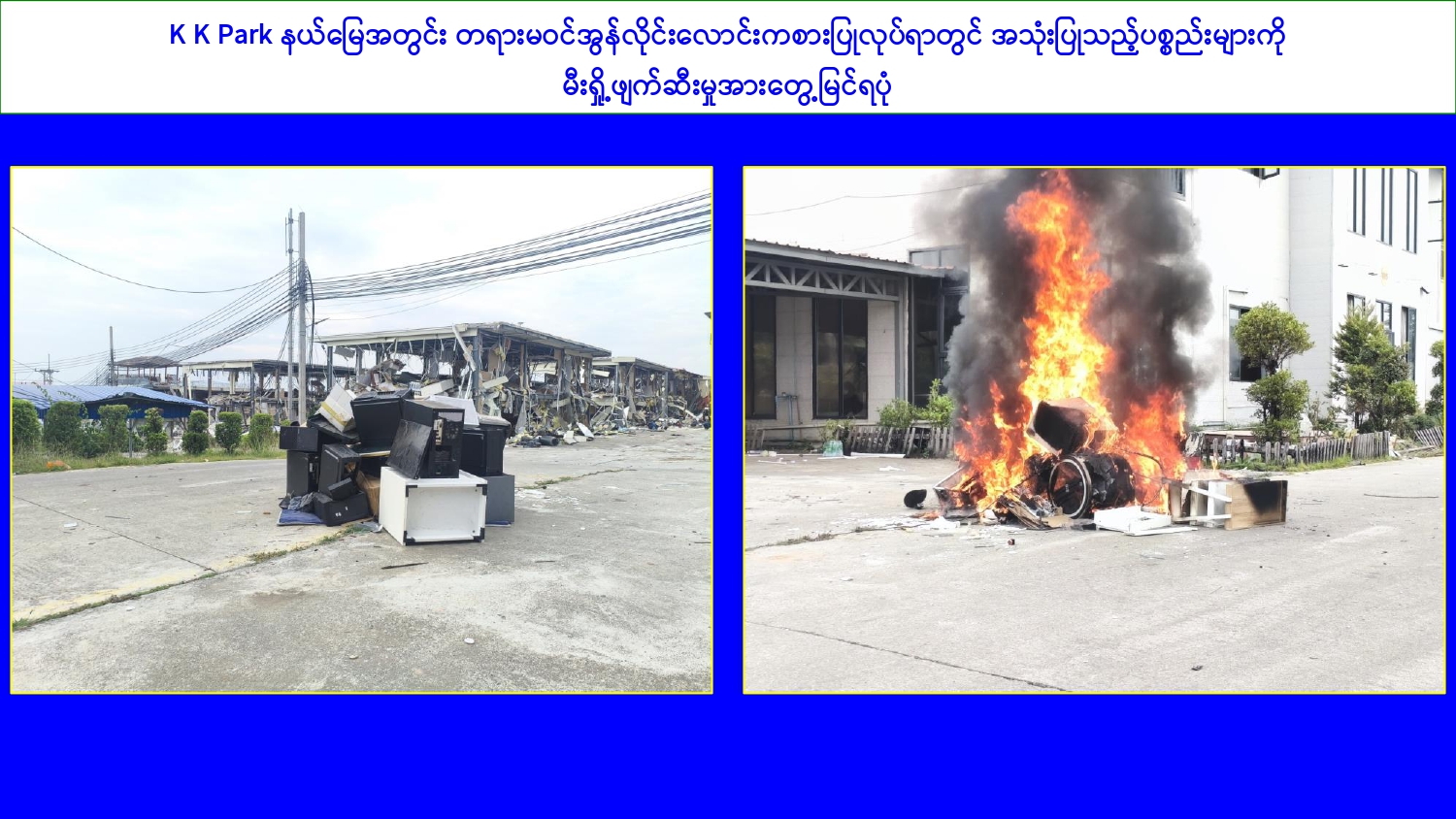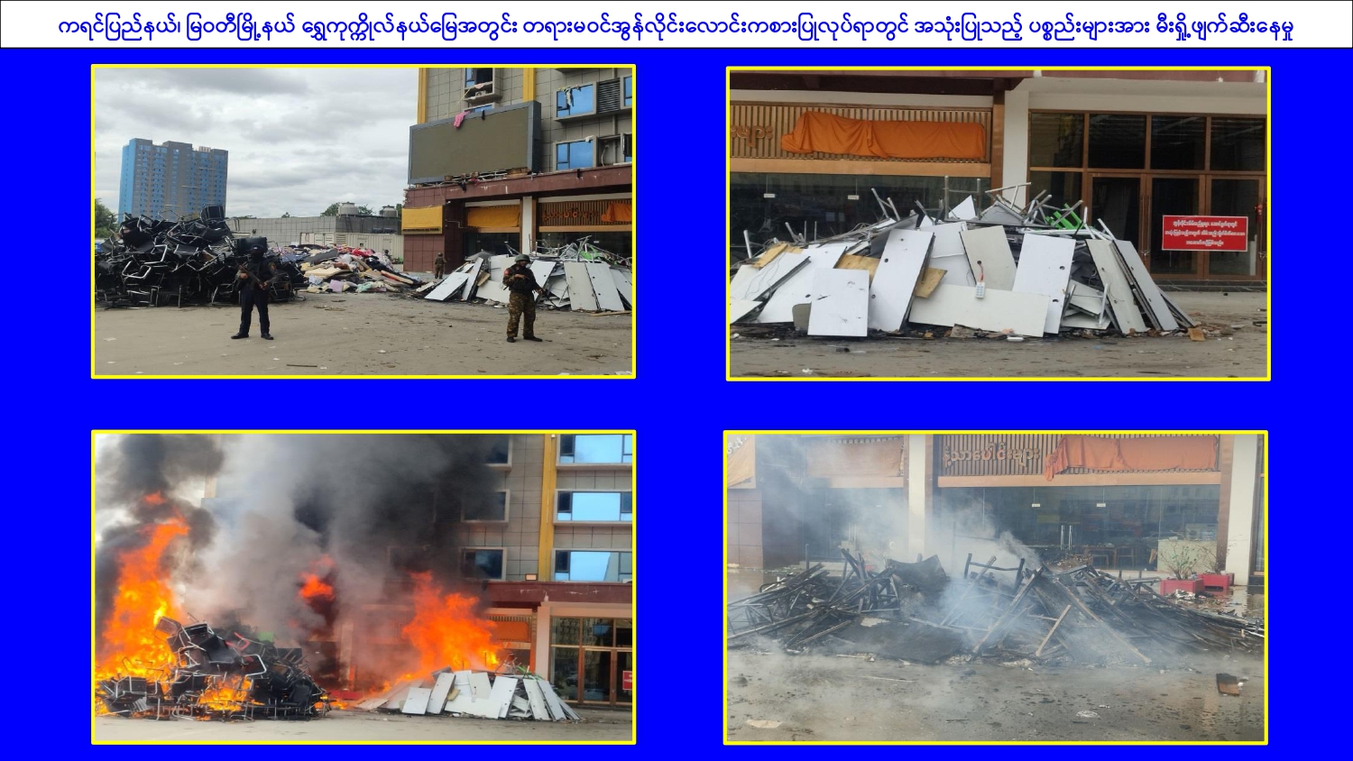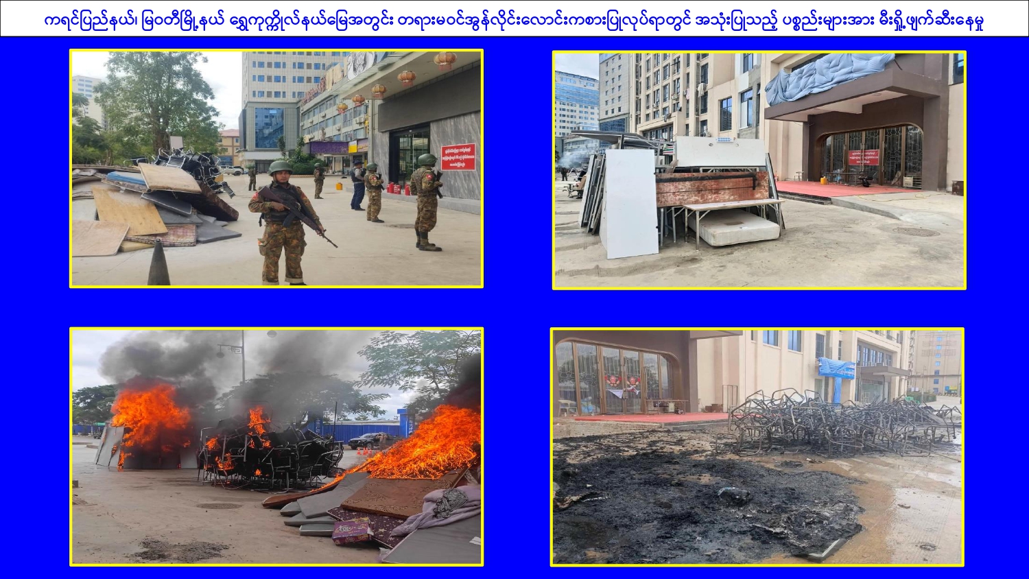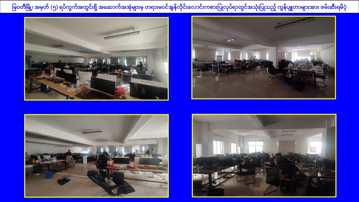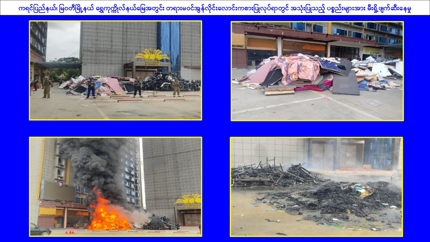၎င်းအပြင် မြဝတီမြို့နယ်အတွင်းရှိ KK Park နယ်မြေနှင့် ရွှေကုက္ကိုလ်နယ်မြေတို့၌ အွန်လိုင်းလိမ်လည်လောင်းကစားမှုကျူးလွန်ရာတွင် အသုံးပြုသည့်ပစ္စည်းများအား ထပ်မံ ၍ အသုံးပြုနိုင်ခြင်းမရှိစေရန်အတွက်ယနေ့တွင်လည်း စနစ်တကျ မီးရှို့ဖျက်ဆီးခဲ့ကြောင်း သိရှိရသည်။