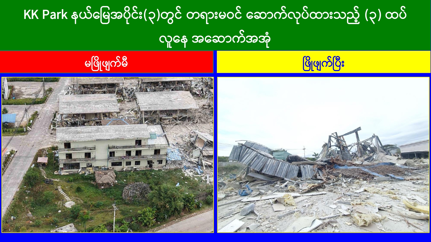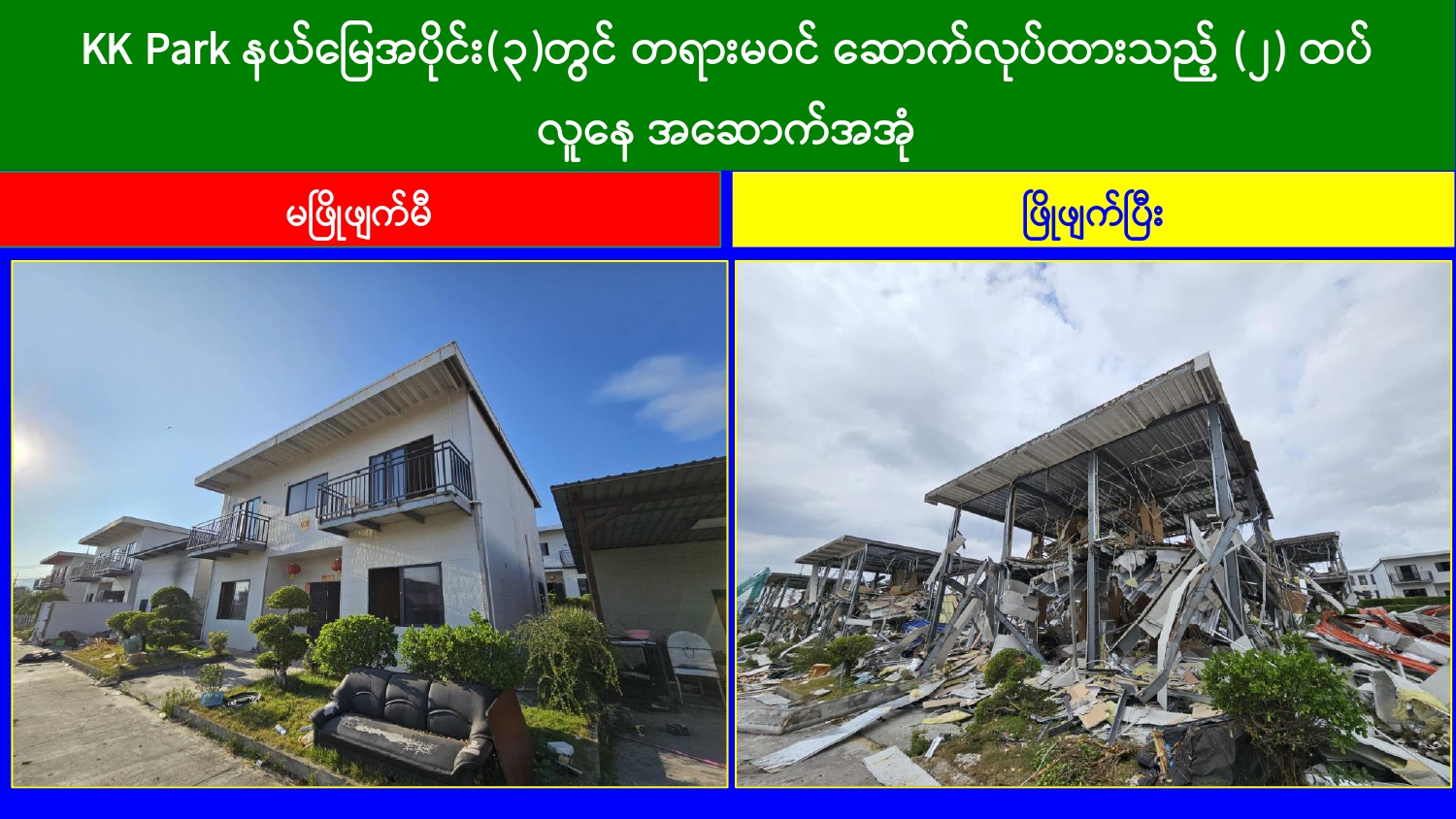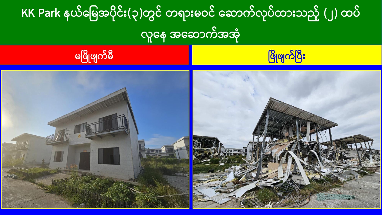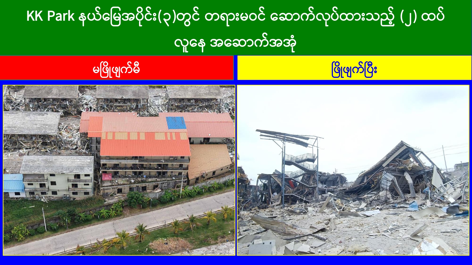 ထိုသို့ အွန်လိုင်းလိမ်လည်လောင်းကစားမှုတိုက်ဖျက်ရေး လုပ်ငန်းများဆောင်ရွက် လျက်ရှိရာ ယနေ့တွင် မြဝတီ-မဲထော်သလေး (KK Park) နယ်မြေအတွင်းရှိ အွန်လိုင်း လိမ်လည်လောင်းကစားမှုများ ကျူးလွန်ရာတွင် အသုံးပြုခဲ့သည့် အပိုင်း(၃) နယ်မြေ အတွင်းရှိ တရားမဝင် ၄ ထပ်အဆောက်အအုံ ၁ လုံး၊ ၃ ထပ်အဆောက်အအုံ ၂ လုံးနှင့် ၂ ထပ် အဆောက်အအုံ ၁၄ လုံး၊ စုစုပေါင်း တရားမဝင်အဆောက်အအုံ ၁၇ လုံးကို ထပ်မံဖြိုချဖျက်ဆီးခဲ့သဖြင့် KK Park နယ်မြေအတွင်းရှိ တရားမဝင် အဆောက်အအုံ စုစုပေါင်း ၆၃၅ လုံး အနက် ၃၉၈ လုံးကို စနစ်တကျ ဖြိုချဖျက်ဆီးပြီးဖြစ်ကြောင်း သိရှိရသည်။