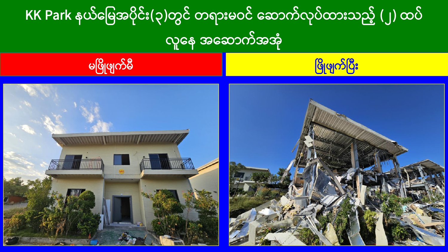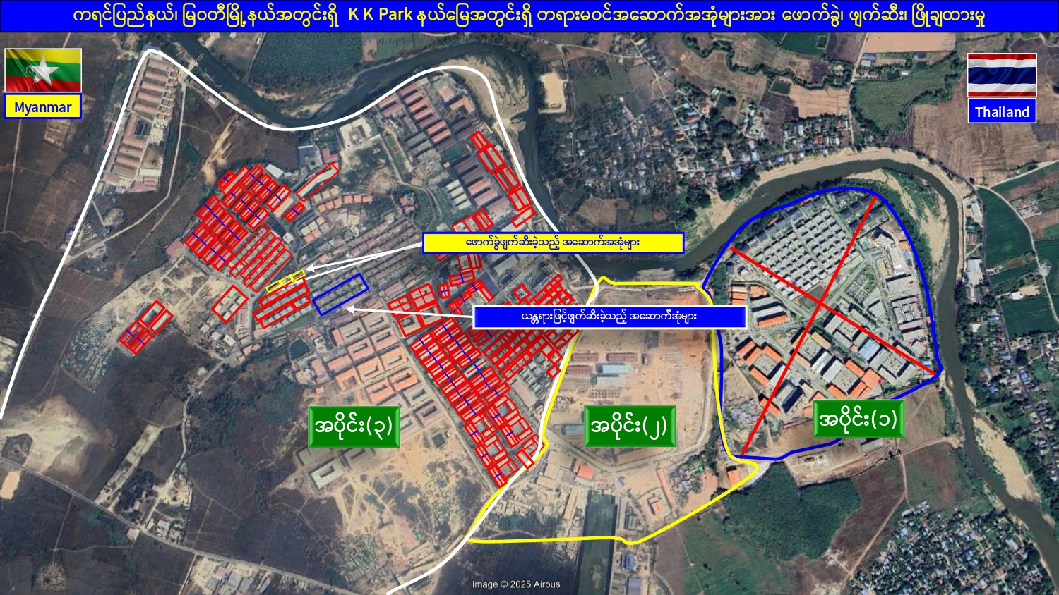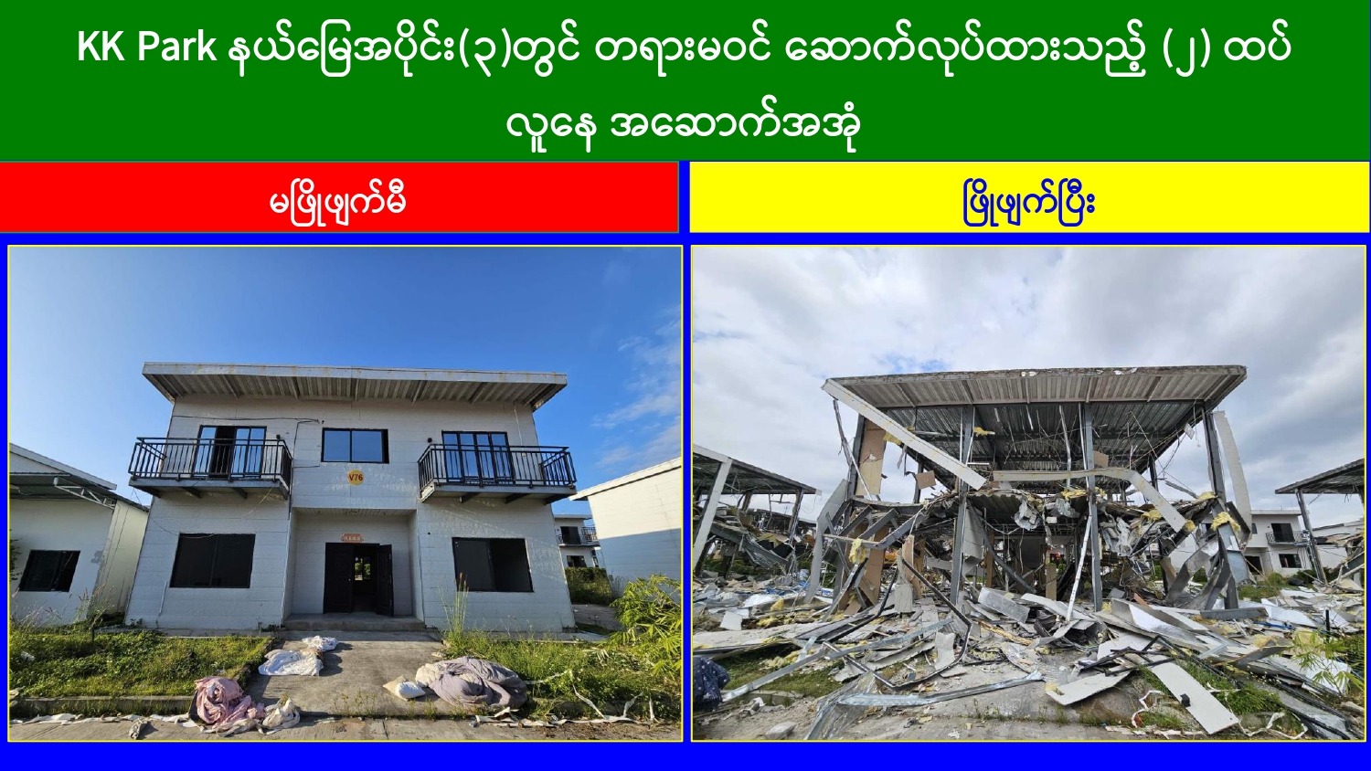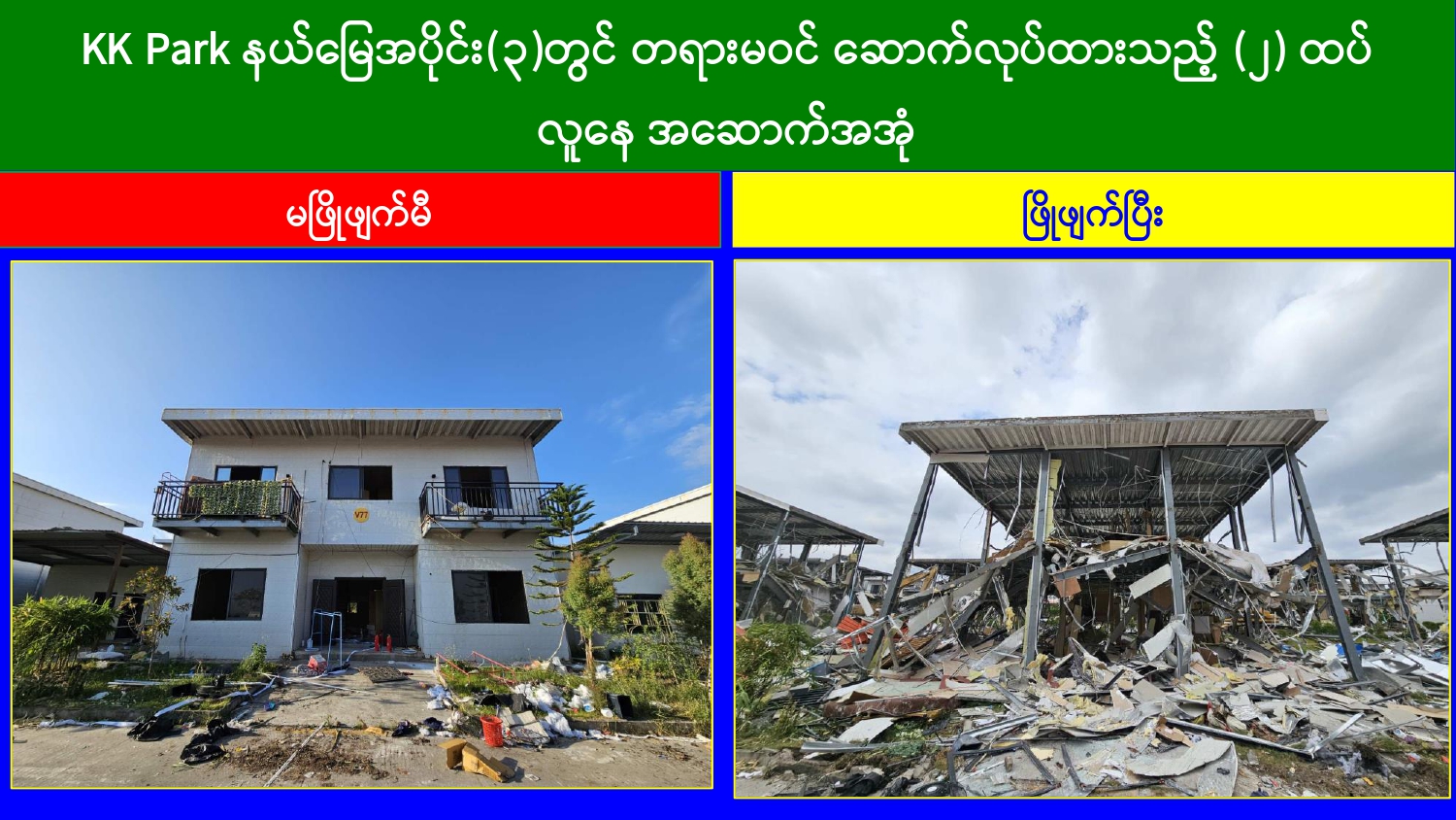 ထိုသို့ အွန်လိုင်းလိမ်လည်လောင်းကစားမှုတိုက်ဖျက်ရေး လုပ်ငန်းများဆောင်ရွက် လျက်ရှိရာ ယနေ့တွင် မြဝတီ-မဲထော်သလေး (KK Park) နယ်မြေအတွင်းရှိ အွန်လိုင်း လိမ်လည်လောင်းကစားမှုများ ကျူးလွန်ရာတွင် အသုံးပြုခဲ့သည့် အပိုင်း(၃) နယ်မြေ အတွင်းရှိ တရားမဝင် ၄ ထပ်အဆောက်အအုံ ၁ လုံး၊ ၃ ထပ်အဆောက်အအုံ ၂ လုံးနှင့် ၂ ထပ် အဆောက်အအုံ ၁၄ လုံး၊ စုစုပေါင်း တရားမဝင်အဆောက်အအုံ ၁၇ လုံးကို ထပ်မံဖြိုချဖျက်ဆီးခဲ့သဖြင့် KK Park နယ်မြေအတွင်းရှိ တရားမဝင် အဆောက်အအုံ စုစုပေါင်း ၆၃၅ လုံး အနက် ၃၉၈ လုံးကို စနစ်တကျ ဖြိုချဖျက်ဆီးပြီးဖြစ်ကြောင်း သိရှိရသည်။