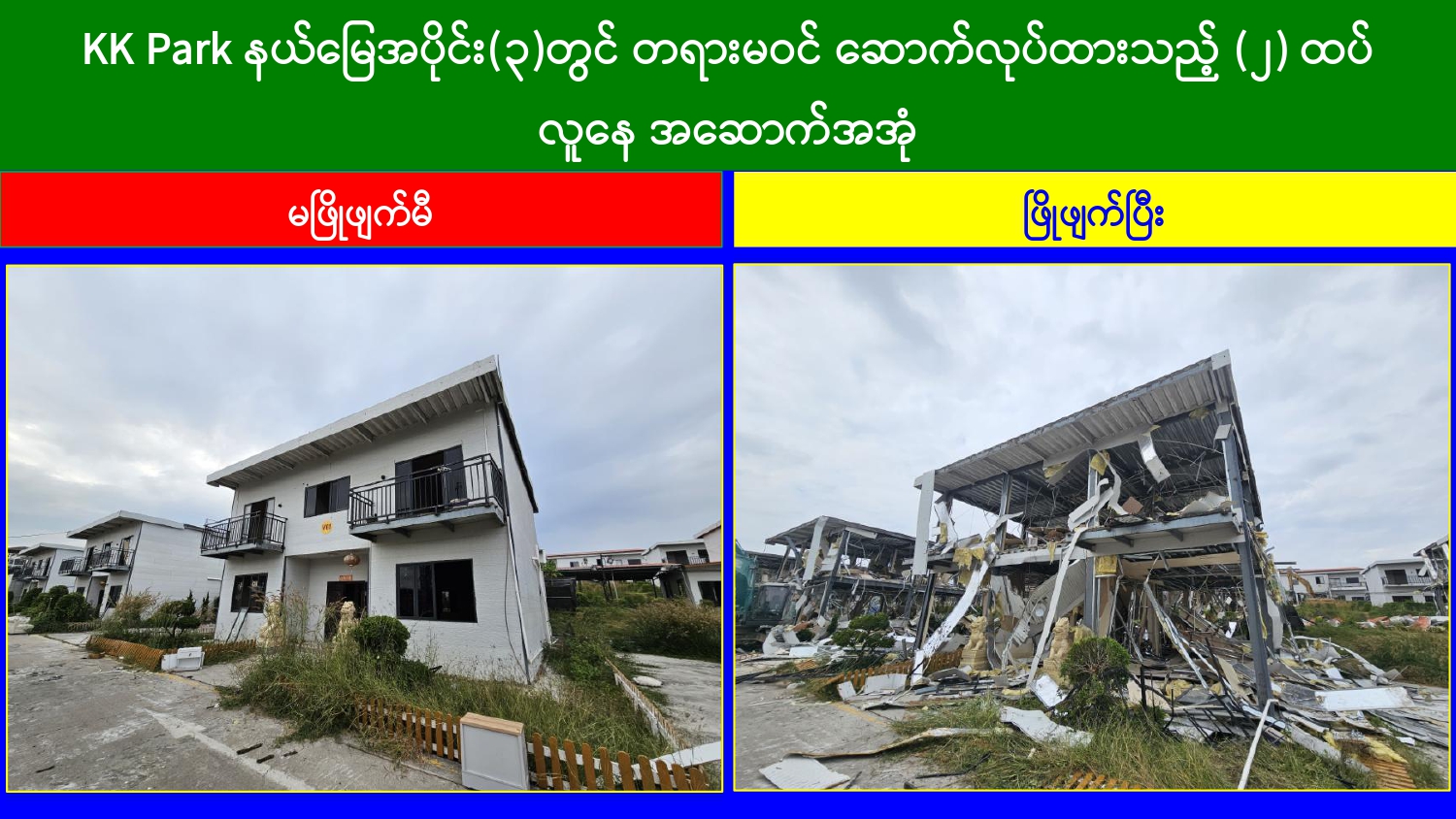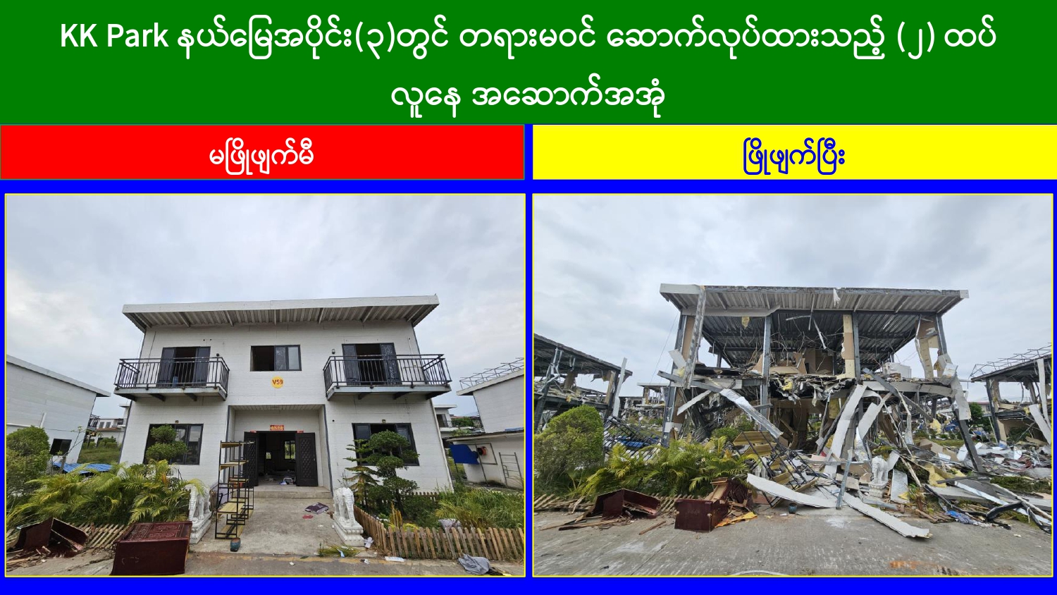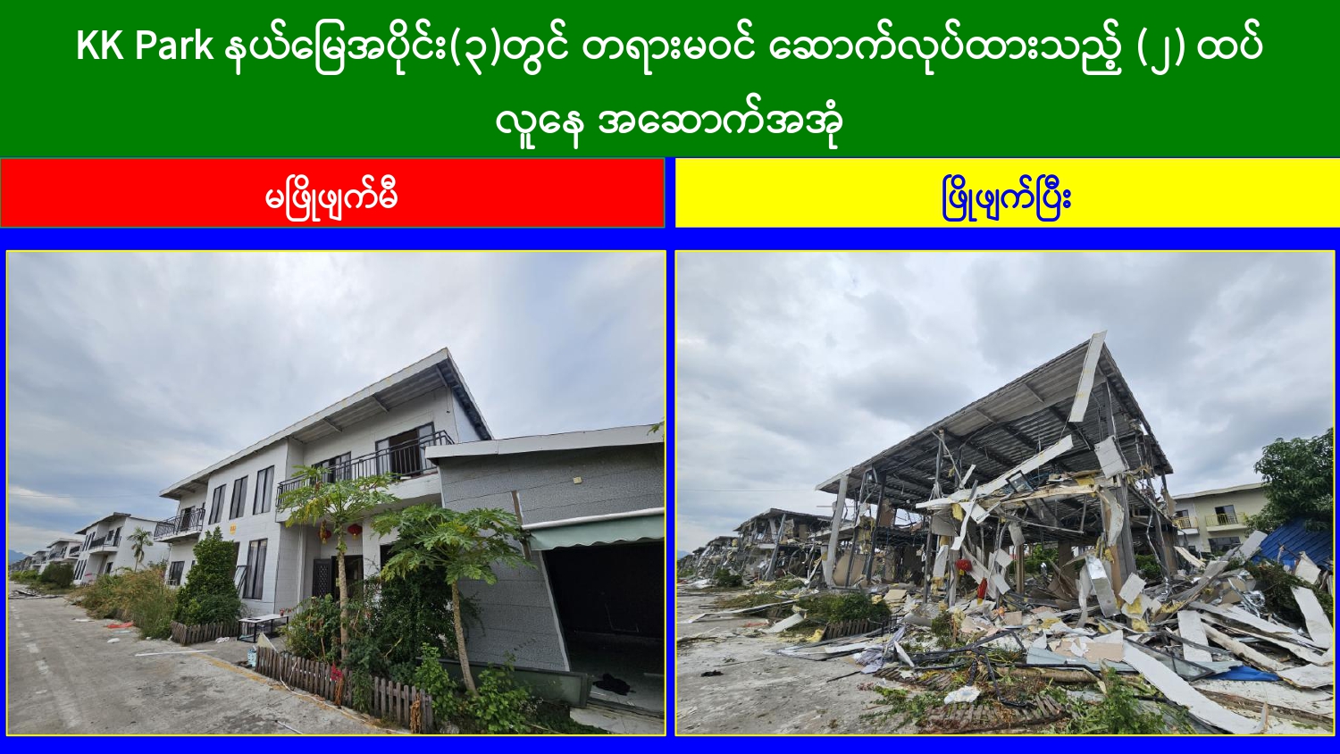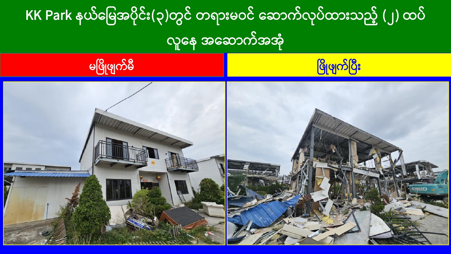 ထိုသို့ အွန်လိုင်းလိမ်လည်လောင်းကစားမှုတိုက်ဖျက်ရေး လုပ်ငန်းများဆောင်ရွက် လျက်ရှိရာ ယနေ့တွင် မြဝတီ-မဲထော်သလေး (KK Park) နယ်မြေအတွင်းရှိ အွန်လိုင်း လိမ်လည်လောင်းကစားမှုများ ကျူးလွန်ရာတွင် အသုံးပြုခဲ့သည့် အပိုင်း(၃) နယ်မြေ အတွင်းရှိ တရားမဝင် ၃ ထပ်အဆောက်အအုံ ၁ လုံးနှင့် ၂ ထပ် အဆောက်အအုံ ၁၄ လုံး၊ စုစုပေါင်း တရားမဝင်အဆောက်အအုံ ၁၅ လုံးကို ထပ်မံဖြိုချဖျက်ဆီးခဲ့သဖြင့် KK Park နယ်မြေအတွင်းရှိ တရားမဝင် အဆောက်အအုံ စုစုပေါင်း ၆၃၅ လုံး အနက် ၄၁၃ လုံးကို စနစ်တကျ ဖြိုချဖျက်ဆီးပြီးဖြစ်ကြောင်း သိရှိရသည်။