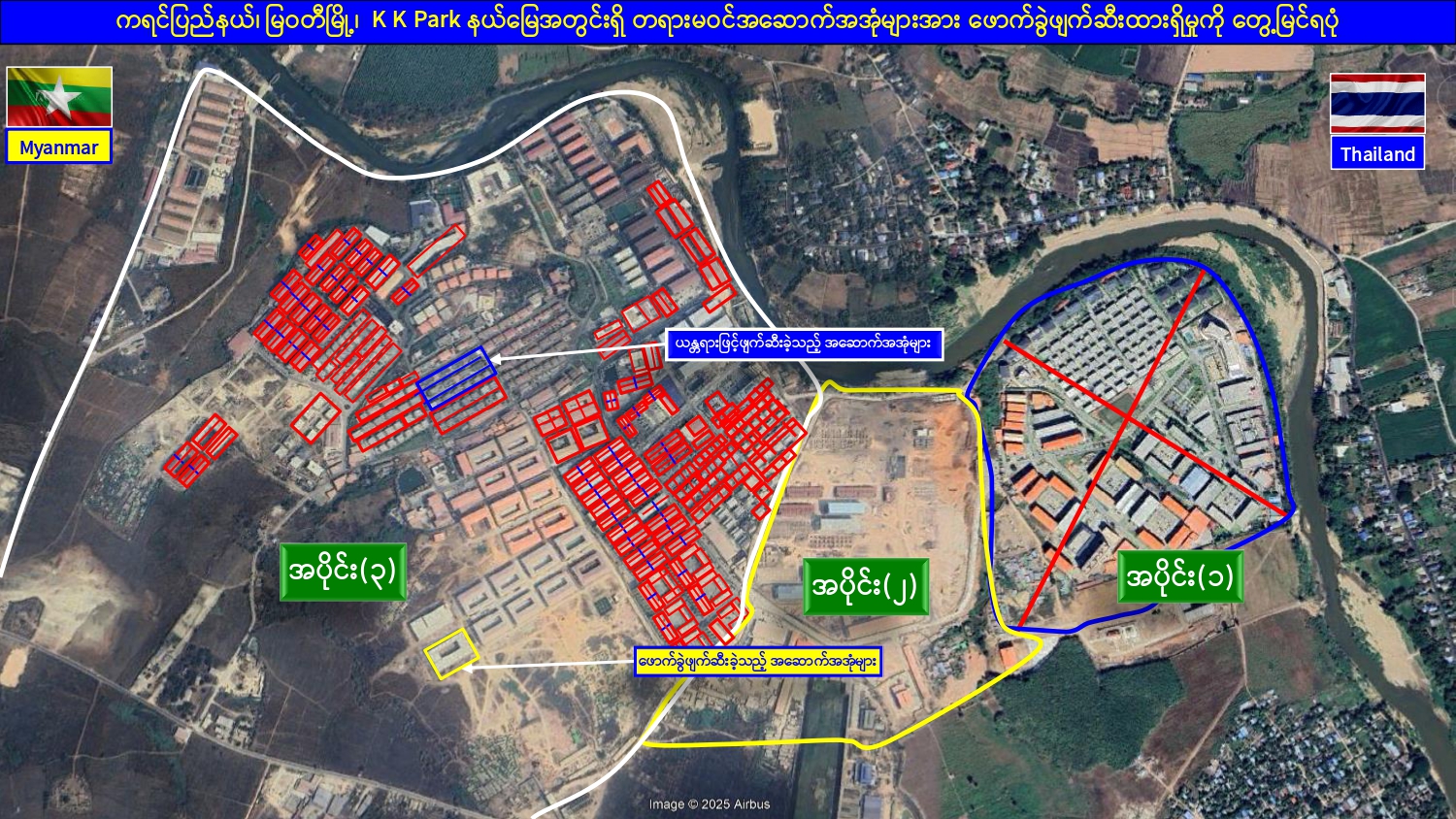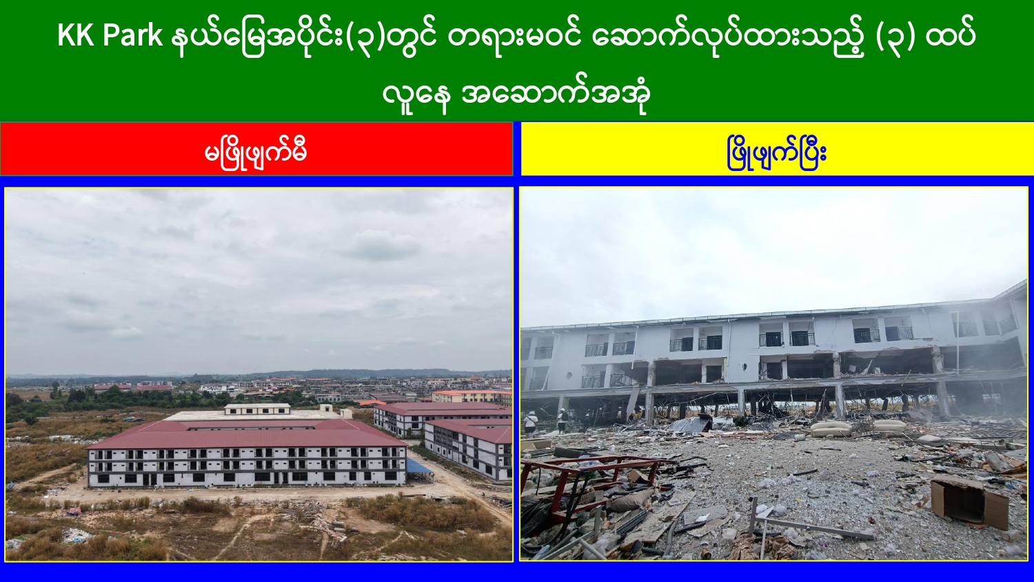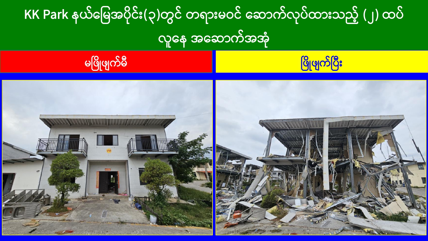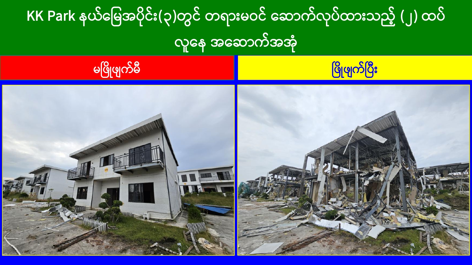 ထိုသို့ အွန်လိုင်းလိမ်လည်လောင်းကစားမှုတိုက်ဖျက်ရေး လုပ်ငန်းများဆောင်ရွက် လျက်ရှိရာ ယနေ့တွင် မြဝတီ-မဲထော်သလေး (KK Park) နယ်မြေအတွင်းရှိ အွန်လိုင်း လိမ်လည်လောင်းကစားမှုများ ကျူးလွန်ရာတွင် အသုံးပြုခဲ့သည့် အပိုင်း(၃) နယ်မြေ အတွင်းရှိ တရားမဝင် ၃ ထပ်အဆောက်အအုံ ၁ လုံးနှင့် ၂ ထပ် အဆောက်အအုံ ၁၄ လုံး၊ စုစုပေါင်း တရားမဝင်အဆောက်အအုံ ၁၅ လုံးကို ထပ်မံဖြိုချဖျက်ဆီးခဲ့သဖြင့် KK Park နယ်မြေအတွင်းရှိ တရားမဝင် အဆောက်အအုံ စုစုပေါင်း ၆၃၅ လုံး အနက် ၄၁၃ လုံးကို စနစ်တကျ ဖြိုချဖျက်ဆီးပြီးဖြစ်ကြောင်း သိရှိရသည်။