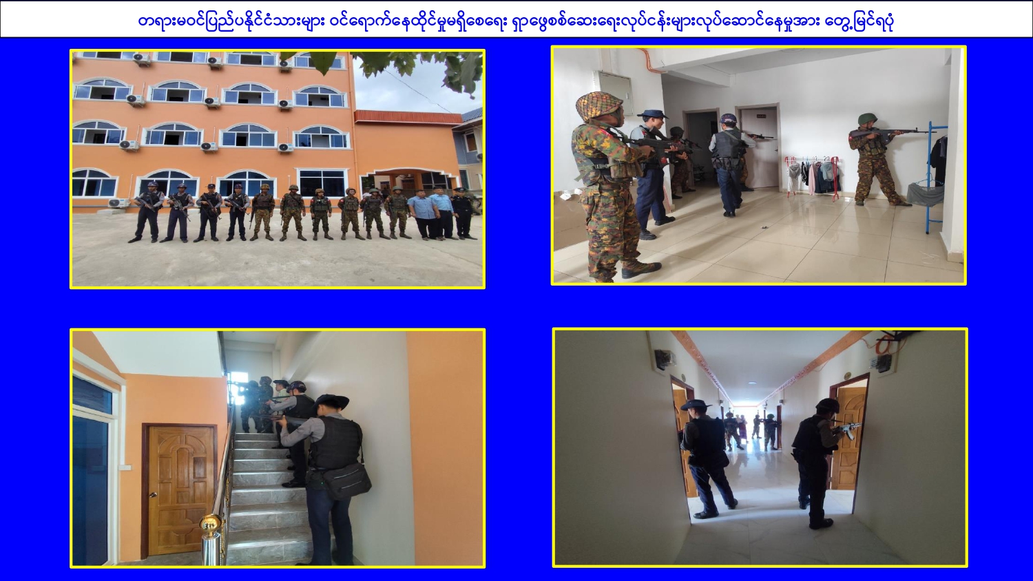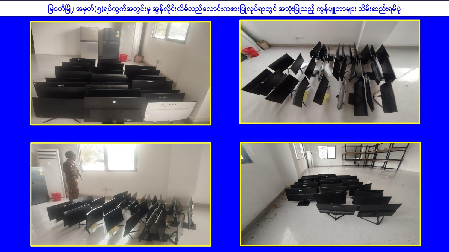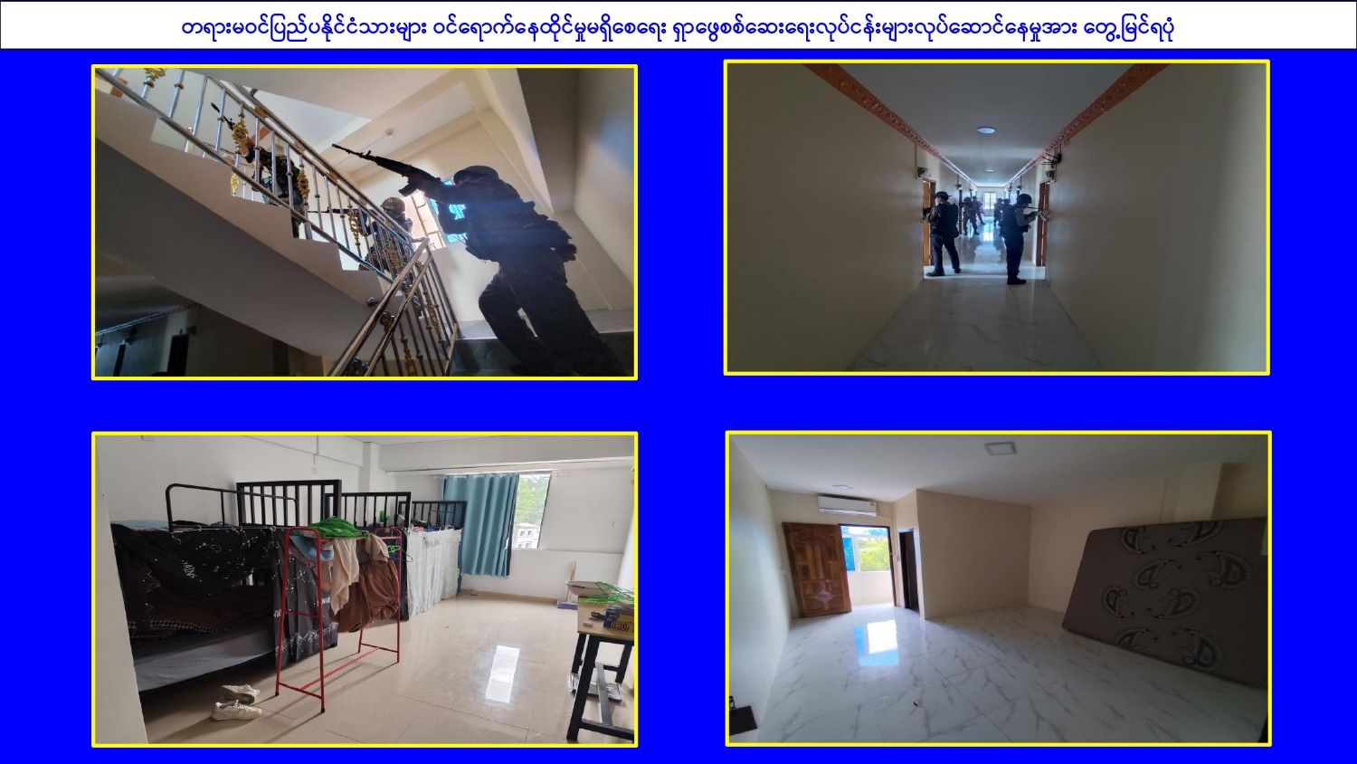ထို့ပြင် ကရင်ပြည်နယ်၊ မြဝတီမြို့နှင့် ပတ်ဝန်းကျင်ဒေသတစ်ဝိုက်ရှိ အဆောက် အအုံများ၌ တရားမဝင်ပြည်ပနိုင်ငံသားများ ဝင်ရောက်နေထိုင်ခြင်းနှင့် အွန်လိုင်းလိမ်လည် လောင်းကစားမှုများ လုပ်ကိုင်ဆောင်ရွက်ခြင်း မရှိစေရေးအတွက် လုံခြုံရေးတပ်ဖွဲ့ဝင်များ၊ အုပ်ချုပ်ရေးအဖွဲ့အစည်းများနှင့် ဒေသတွင်းတာဝန်ရှိသူများအပါအဝင် အဖွဲ့စုံပါဝင်သည့် ပူးပေါင်းအဖွဲ့ဖြင့် ဒီဇင်ဘာ ၈ ရက်မှ စတင်၍ ရှာဖွေရှင်းလင်းဆောင်ရွက်ခဲ့ရာ ယနေ့တွင် လည်း မြဝတီမြို့၊ အမှတ်(၅) ရပ်ကွက်အတွင်းရှိ အဆောက်အအုံ ၁ လုံးကို ထပ်မံစစ် ဆေးနိုင်ခဲ့ပြီး အဆိုပါအဆောက်အအုံအတွင်းမှ အွန်လိုင်းလိမ်လည်လောင်းကစားပြုလုပ် ရာတွင် အသုံးပြုသည့် All in One ကွန်ပျူတာ ၃၀ လုံးတို့ကို စစ်ဆေးဖော်ထုတ် သိမ်းဆည်းရမိခဲ့သည်။