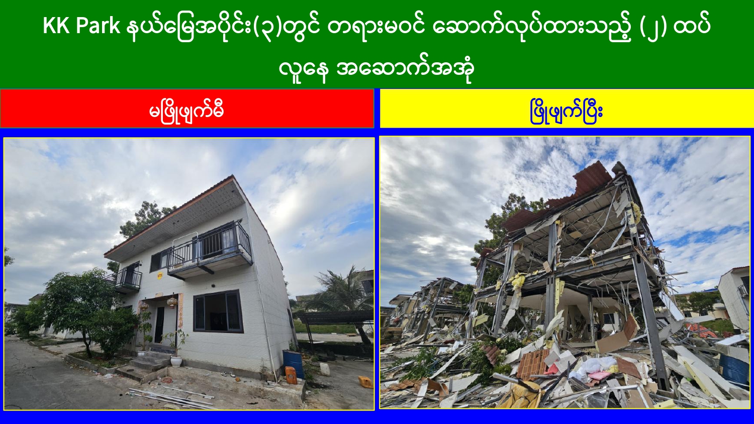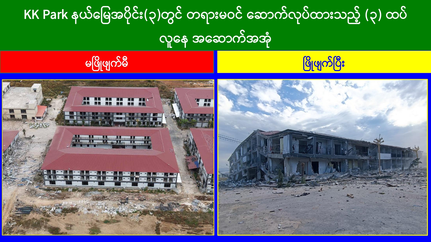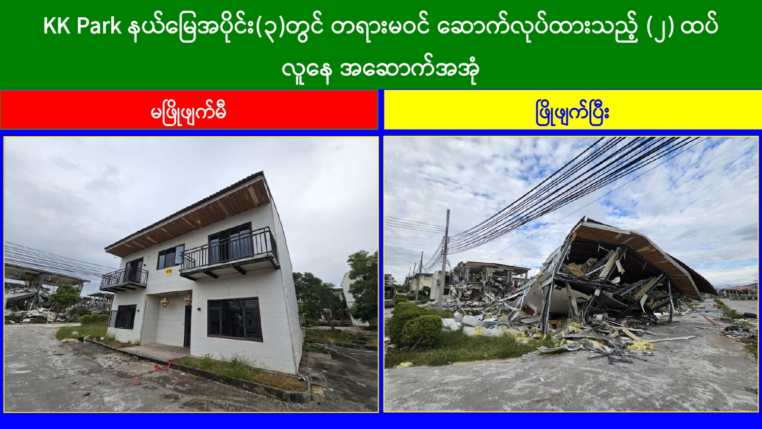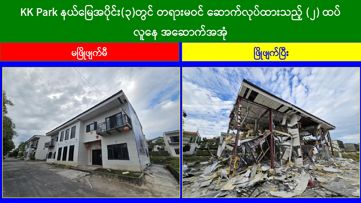 ထိုသို့ အွန်လိုင်းလိမ်လည်လောင်းကစားမှုတိုက်ဖျက်ရေး လုပ်ငန်းများဆောင်ရွက် လျက်ရှိရာ ယနေ့တွင် မြဝတီ-မဲထော်သလေး (KK Park) နယ်မြေအတွင်းရှိ အွန်လိုင်း လိမ်လည်လောင်းကစားမှုများ ကျူးလွန်ရာတွင် အသုံးပြုခဲ့သည့် အပိုင်း(၃) နယ်မြေ အတွင်းရှိ တရားမဝင် ၃ ထပ်အဆောက်အအုံ ၁ လုံးနှင့် ၂ ထပ် အဆောက်အအုံ ၁၅ လုံး၊ စုစုပေါင်း တရားမဝင်အဆောက်အအုံ ၁၆ လုံးကို ထပ်မံဖြိုချဖျက်ဆီးခဲ့သဖြင့် KK Park နယ်မြေအတွင်းရှိ တရားမဝင် အဆောက်အအုံ စုစုပေါင်း ၆၃၅ လုံး အနက် ၄၂၉ လုံးကို စနစ်တကျ ဖြိုချဖျက်ဆီးပြီးဖြစ်ကြောင်း သိရှိရသည်။