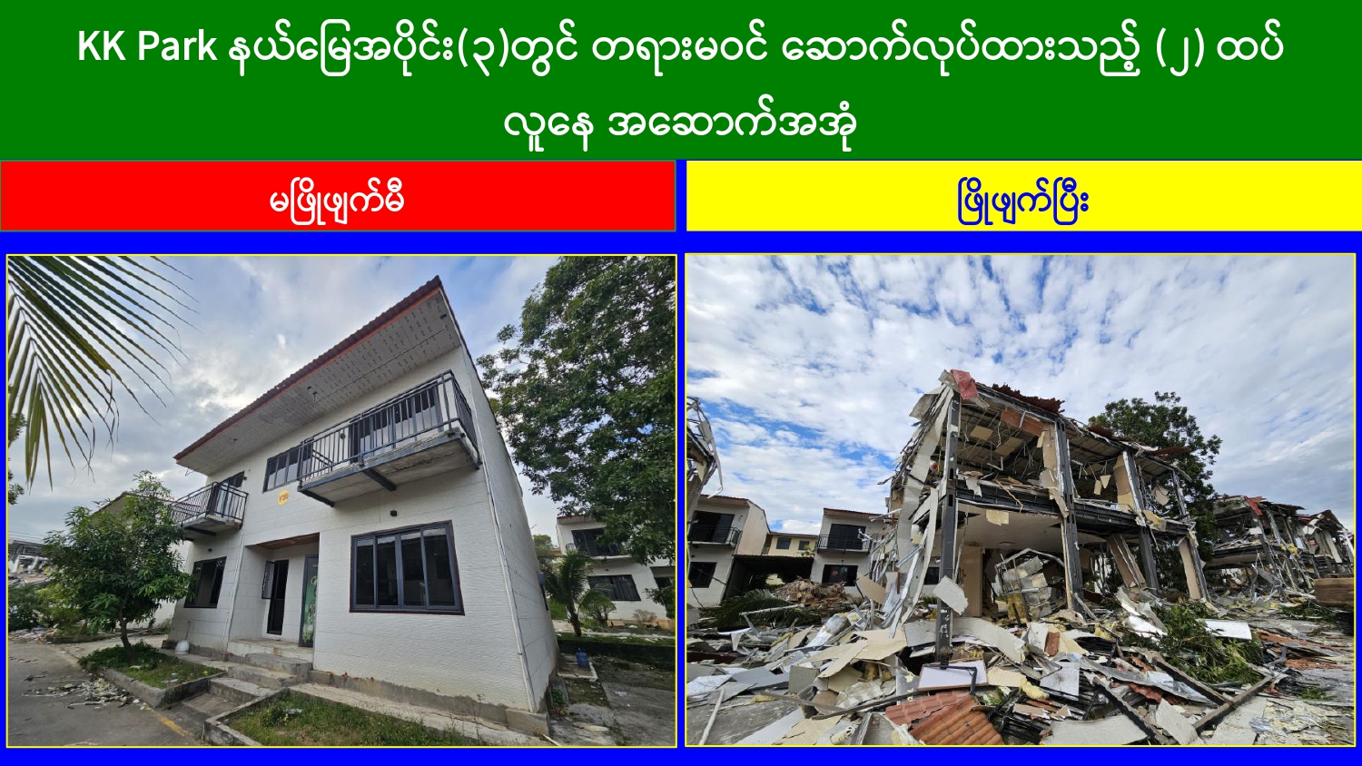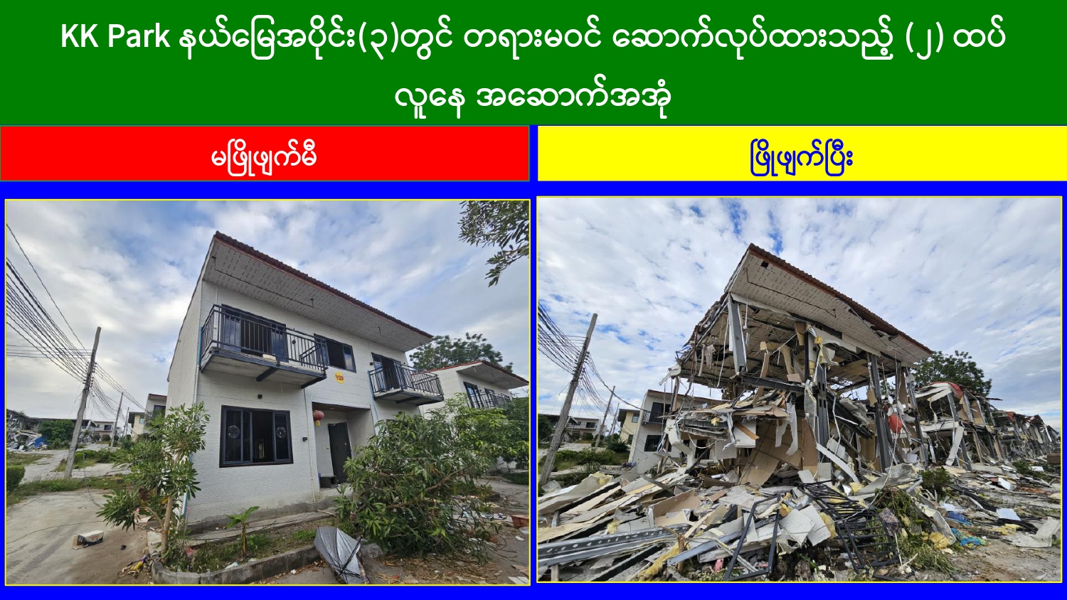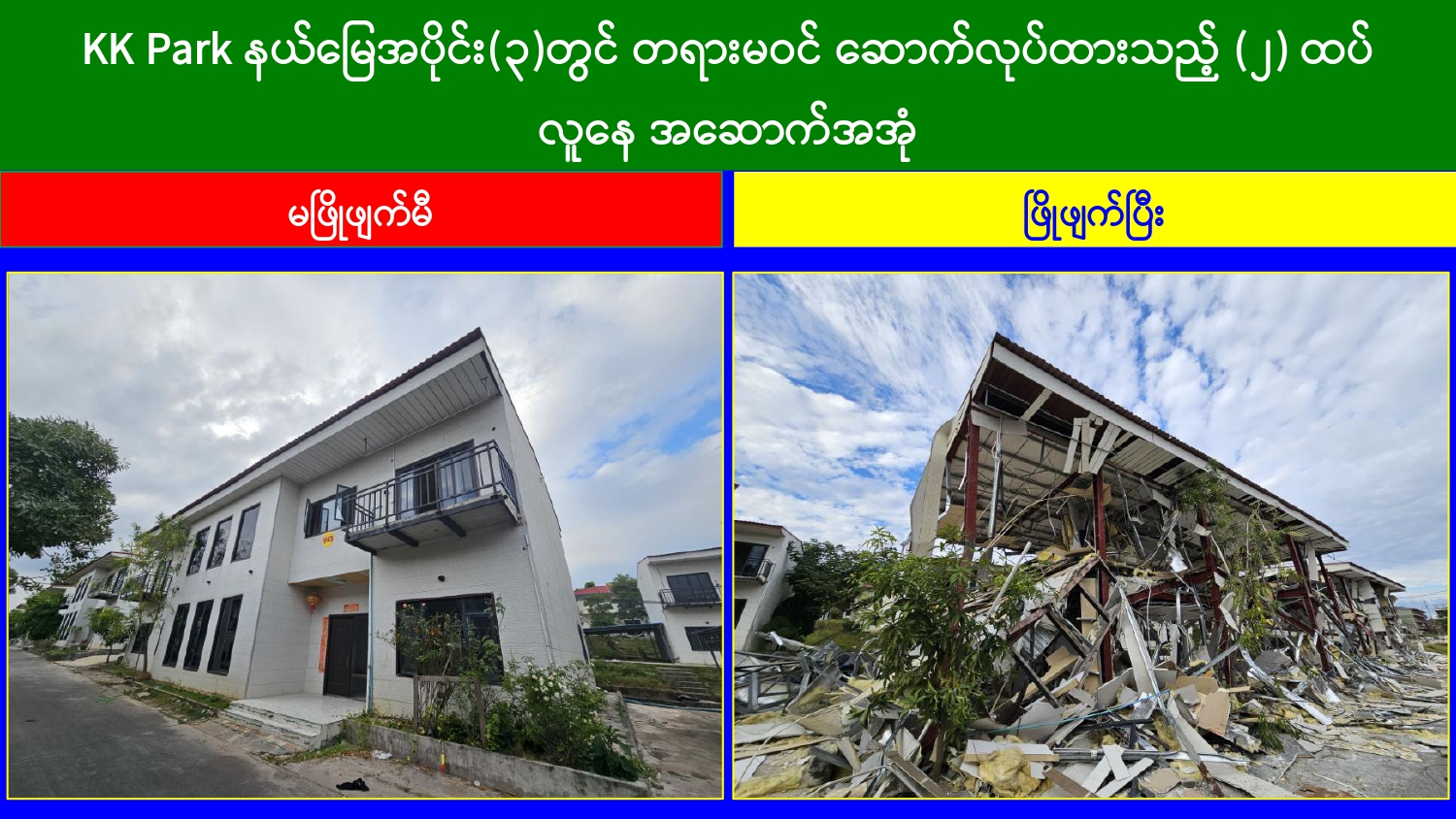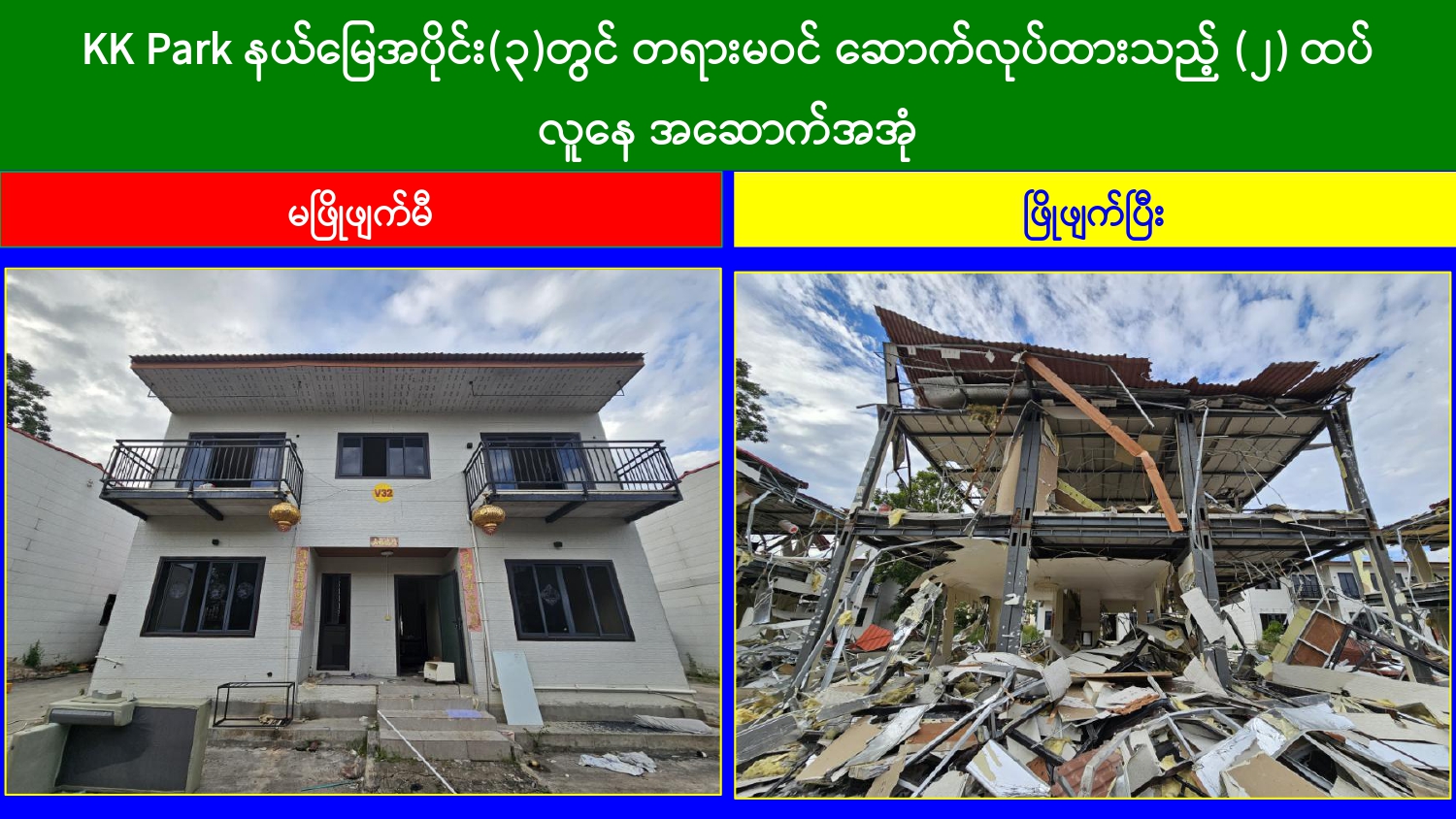 ထိုသို့ အွန်လိုင်းလိမ်လည်လောင်းကစားမှုတိုက်ဖျက်ရေး လုပ်ငန်းများဆောင်ရွက် လျက်ရှိရာ ယနေ့တွင် မြဝတီ-မဲထော်သလေး (KK Park) နယ်မြေအတွင်းရှိ အွန်လိုင်း လိမ်လည်လောင်းကစားမှုများ ကျူးလွန်ရာတွင် အသုံးပြုခဲ့သည့် အပိုင်း(၃) နယ်မြေ အတွင်းရှိ တရားမဝင် ၃ ထပ်အဆောက်အအုံ ၁ လုံးနှင့် ၂ ထပ် အဆောက်အအုံ ၁၅ လုံး၊ စုစုပေါင်း တရားမဝင်အဆောက်အအုံ ၁၆ လုံးကို ထပ်မံဖြိုချဖျက်ဆီးခဲ့သဖြင့် KK Park နယ်မြေအတွင်းရှိ တရားမဝင် အဆောက်အအုံ စုစုပေါင်း ၆၃၅ လုံး အနက် ၄၂၉ လုံးကို စနစ်တကျ ဖြိုချဖျက်ဆီးပြီးဖြစ်ကြောင်း သိရှိရသည်။