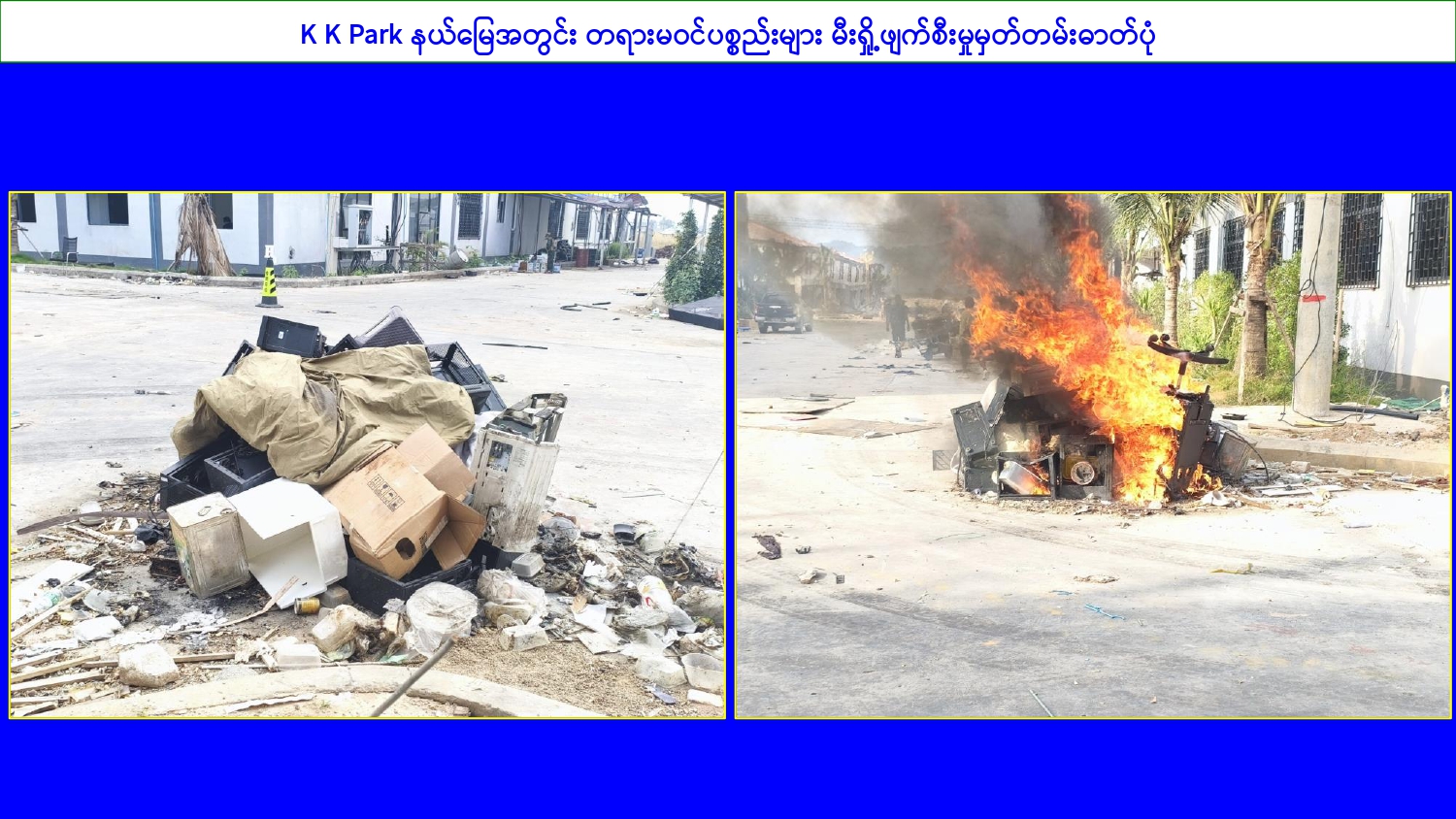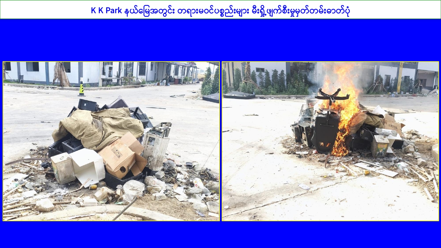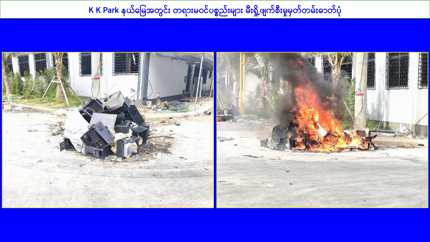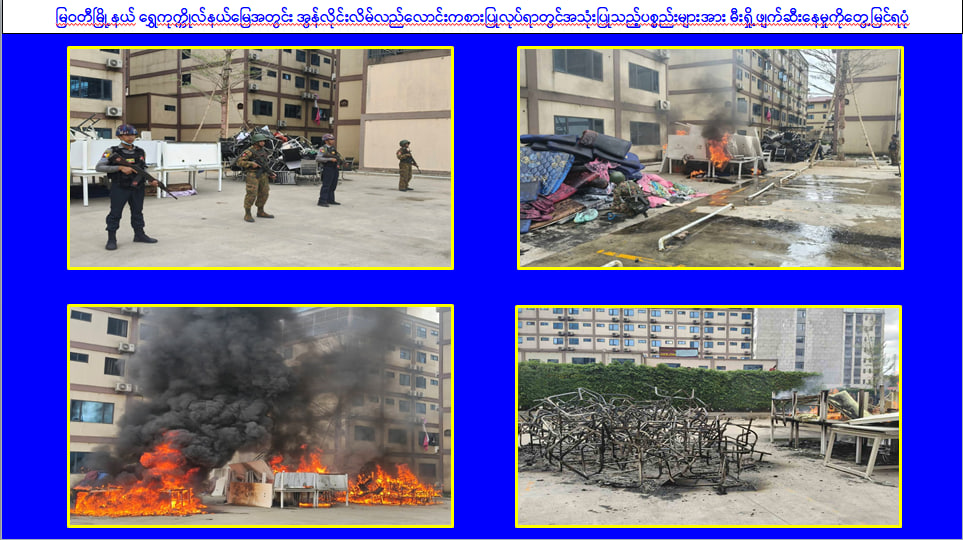 ၎င်းအပြင် မြဝတီမြို့နယ်အတွင်းရှိ KK Park နယ်မြေနှင့် ရွှေကုက္ကိုလ်နယ်မြေတို့၌ အွန်လိုင်းလိမ်လည်လောင်းကစားမှုကျူးလွန်ရာတွင် အသုံးပြုသည့်ပစ္စည်းများအား ထပ်မံ ၍ အသုံးပြုနိုင်ခြင်းမရှိစေရန်အတွက် ယနေ့တွင်လည်း စနစ်တကျ မီးရှို့ဖျက်ဆီးခဲ့ ကြောင်း သိရှိရသည်။