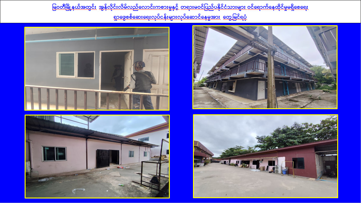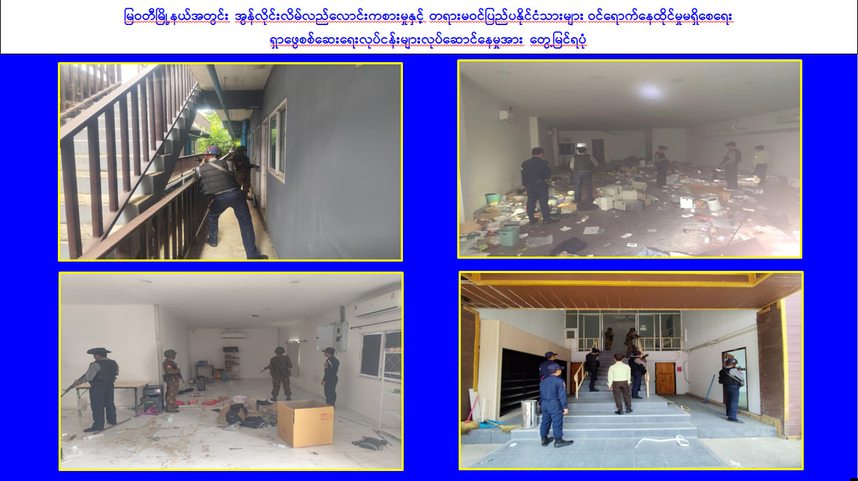 ထို့ပြင် ကရင်ပြည်နယ်၊ မြဝတီမြို့နှင့် ပတ်ဝန်းကျင်ဒေသတစ်ဝိုက်ရှိ အဆောက် အအုံများ၌ တရားမဝင်ပြည်ပနိုင်ငံသားများ ဝင်ရောက်နေထိုင်ခြင်းနှင့် အွန်လိုင်းလိမ်လည် လောင်းကစားမှုများ လုပ်ကိုင်ဆောင်ရွက်ခြင်း မရှိစေရေးအတွက် လုံခြုံရေးတပ်ဖွဲ့ဝင်များ၊ အုပ်ချုပ်ရေးအဖွဲ့အစည်းများနှင့် ဒေသတွင်းတာဝန်ရှိသူများအပါအဝင် အဖွဲ့စုံပါဝင်သည့် ပူးပေါင်းအဖွဲ့ဖြင့် ဒီဇင်ဘာ ၈ ရက်မှ စတင်၍ ရှာဖွေရှင်းလင်းဆောင်ရွက်လျက်ရှိပြီး ယနေ့ တွင်လည်း ၁ ထပ်အဆောက်အအုံ ၆ လုံး၊ ၂ ထပ်အဆောက်အအုံ ၄ လုံး၊ ၃ ထပ် အဆောက်အအုံ ၂၀ လုံးနှင့် ၄ ထပ်အဆောက်အအုံ ၆ လုံး စုစုပေါင်း အဆောက်အအုံ ၃၆ လုံးကို ရှာဖွေစစ်ဆေးရာ အွန်လိုင်းလိမ်လည်လောင်းကစားမှု လုပ်ကိုင်ခြင်းနှင့် တရားမဝင် ပြည်ပနိုင်ငံသားများ ဝင်ရောက်နေထိုင်ခြင်းများ မရှိသည်ကို စစ်ဆေးတွေ့ရှိရကြောင်း သိရှိရသည်။