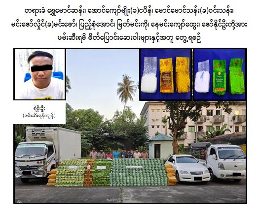 ကွင်းဆက်ဖော်ထုတ်စစ်ဆေးချက်များအရ ရှမ်းပြည်နယ်(မြောက်ပိုင်း)၊ လောက်ကိုင်မြို့နေ အားချန်(ဖမ်းဆီးရန်ကျန်)၊ ကိုစိုင်း(ခ)စိုင်းလေး (ဖမ်းဆီးရန်ကျန်)နှင့် မကွေးတိုင်းဒေသကြီး၊ ပခုက္ကူ မြို့နယ်၊ ဖောင်းချောင်းကျေးရွာနေ ရဲစိုးဦး (ဖမ်းဆီးရန်ကျန်)တို့၏ အစီအမံဖြင့် ရှမ်းပြည်နယ်(မြောက်ပိုင်း)မှ စိတ်ပြောင်းဆေးဝါးများအား ရန်ကုန်မြို့သို့သယ်ဆောင်ပြီး ပင်လယ်ရေကြောင်းမှတစ်ဆင့် မလေးရှားနှင့် ထိုင်းရေပိုင်နက်သို့ သယ်ဆောင်ရောင်းဝယ်ခြင်းဖြစ်ကြောင်း သိရှိရသဖြင့် ဖမ်းဆီးရမိသည့် မူးယစ် မှောင်ခိုဂိုဏ်းအဖွဲ့အား မူးယစ်ဆေးဝါးနှင့် စိတ်ကိုပြောင်းလဲစေသောဆေးဝါးများဆိုင်ရာဥပဒေအရ အရေးယူ ထားရှိပြီး ကွင်းဆက်ပြစ်မှုကျူးလွန်သူများအား ဆက်လက်ဖော်ထုတ်လျက်ရှိကြောင်းနှင့် ၎င်းတို့၏ မူးယစ်ဆေးဝါး သယ်ဆောင်ရောင်းဝယ်ရာမှရရှိသည့် ငွေကြေးအကျိုးအမြတ်များ၊ ပိုင်ဆိုင်မှု များကို ပြည်သူ့ဘဏ္ဍာအဖြစ် သိမ်းဆည်းနိုင်ရေးအတွက် ငွေကြေးခဝါချမှုတိုက်ဖျက်ရေးဥပဒေဖြင့် ဆက်လက် အရေးယူဆောင်ရွက်လျက်ရှိကြောင်း မြန်မာနိုင်ငံရဲတပ်ဖွဲ့မှ သတင်းရရှိသည်။