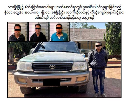 ထပ်မံစစ်ဆေးပေါ်ပေါက်ချက်အရ ရှမ်းပြည်နယ်(မြောက်ပိုင်း)မှ ရန်ကုန်မြို့သို့ စိတ်ပြောင်း ဆေးဝါးများ တာဝန်ခံသယ်ဆောင်သူ ကိုကိုကျော်ရဲနောင်အား နိုဝင်ဘာလ ၂၈ ရက်နေ့ညနေ ၆ နာရီ အချိန် လားရှိုးမြို့၊ ရပ်ကွက်(၁၂)ရှိ ၎င်း၏နေအိမ်တွင် စိတ်ပြောင်းဆေးဝါးများ သယ်ဆောင်ရာတွင် အသုံးပြုခဲ့သည့် TOYOTA LAND CRUISER ယာဉ် ၁ စီးနှင့်အတူ ထပ်မံဖမ်းဆီးရမိခဲ့ပြီး ၎င်း၏ ဖော်ထုတ်ချက်အရ စိတ်ပြောင်းဆေးဝါးများ သယ်ဆောင်ရာတွင် ပူးပေါင်းပါဝင်သူများဖြစ်သည့် နိုင်ဝင်းထွေး(ခ)အငယ်လေး၊ မျိုးဝင်း(ခ)မျိုးကြီးနှင့် တင်ကိုကိုလင်းတို့အား နိုဝင်ဘာလ ၂၉ ရက်နေ့ နံနက် ၉ နာရီခွဲအချိန်တွင် လားရှိုးမြို့၊ ရပ်ကွက်(၁)၌ ဆက်လက်ဖမ်းဆီးရမိခဲ့ပါသည်။