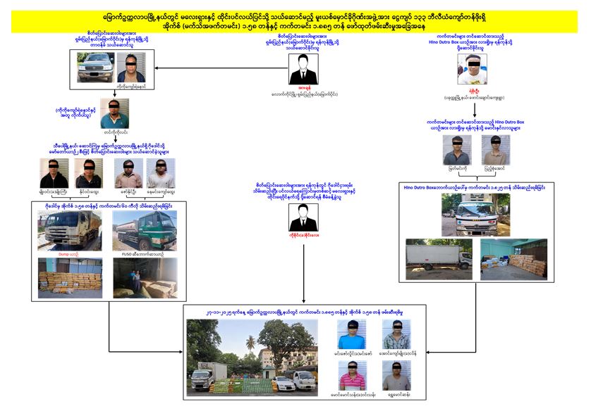 ကွင်းဆက်ဖော်ထုတ်ချက်အရ ဖမ်းဆီးရမိ HINO Box ယာဉ်ဖြင့် ရှမ်းပြည်နယ်(မြောက်ပိုင်း)၊ လားရှိုးမှ မြောက်ဥက္ကလာပမြို့နယ်၊ ရွှေပေါက္ကံမြို့သစ်သို့ စိတ်ပြောင်းဆေးဝါးများ သယ်ဆောင်ခဲ့ပြီး တစ်ဆင့်လွှဲပြောင်းပေးခဲ့သည့် မြတ်မင်းကိုနှင့် ပြည့်စုံအောင်တို့အား နိုဝင်ဘာလ ၂၇ ရက်နေ့ မွန်းလွဲ ၂ နာရီအချိန် မင်္ဂလာဒုံမြို့နယ်၊ နွယ်ခွေရပ်ကွက်ရှိ တည်းခိုခန်းတွင်လည်းကောင်း၊ ရှမ်းပြည်နယ် (မြောက်ပိုင်း)၊ မိုင်းရယ်မှ မြောက်ဥက္ကလာပမြို့နယ်၊ ရွှေပေါက္ကံမြို့သစ်ရှိ ဂိုဒေါင်အတွင်းသို့ စိတ်ပြောင်း ဆေးဝါးများ သယ်ဆောင်ခဲ့သည့် ဇော်နိုင်ဦးနှင့် နေမင်းကျော်ထွေးတို့အား နိုဝင်ဘာလ ၂၈ ရက်နေ့ ညနေ ၅ နာရီအချိန် ၎င်းတို့ စိတ်ပြောင်းဆေးဝါး သယ်ဆောင်ရာတွင် အသုံးပြုခဲ့သည့် MITSUBISHI FUSO ဆီဘောက်ဆာယာဉ် ၁ စီးနှင့်အတူ ကျောက်ဆည်မြို့နယ်၊ သံရွာအနီးတွင်လည်းကောင်း ဖမ်းဆီးရမိခဲ့ပါသည်။