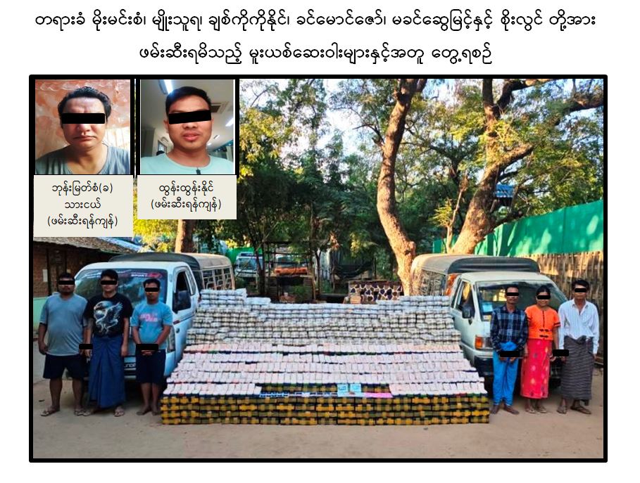 ကွင်းဆက်စစ်ဆေးဖော်ထုတ်ချက်များအရ ဥတ္တရသီရိမြို့နယ်၊ ကျွဲရှင်းကျေးရွာနေ ဘုန်းမြတ်စံ (ခ)သားငယ်(ဖမ်းဆီးရန်ကျန်)နှင့် ချမ်းမြသာစည်မြို့နယ်နေ အောင်နိုင်(ခ)ဖက်တီး (ဖမ်းဆီးရန်ကျန်) တို့၏ အစီအမံဖြင့် ဥတ္တရသီရိမြို့နယ်၊ ဇဝနသိဒ္ဓိရပ်ကွက်နေ တာဝန်ခံသယ်ဆောင်သူ ထွန်းထွန်းနိုင် (ဖမ်းဆီးရန်ကျန်)သည် ဖမ်းဆီးရမိမူးယစ်ဆေးဝါးများအား ရှမ်းပြည်နယ်မှ စစ်ကိုင်းတိုင်းဒေသကြီးသို့ တစ်ဆင့်သယ်ဆောင်ပြီး မန္တလေးမြို့သို့ ဆက်လက်သယ်ဆောင်ခြင်းဖြစ်ကြောင်း သိရှိရသဖြင့် ၎င်းတို့အား မူးယစ်ဆေးဝါးနှင့် စိတ်ကိုပြောင်းလဲစေသောဆေးဝါးများဆိုင်ရာဥပဒေအရ အရေးယူထားရှိပြီး ကွင်းဆက်ပြစ်မှုကျူးလွန်သူများအား ဆက်လက်ဖော်ထုတ်လျက်ရှိကြောင်းနှင့် ၎င်းတို့၏ မူးယစ် ဆေးဝါးသယ်ဆောင်ရောင်းဝယ်ရာမှရရှိသည့် ငွေကြေးအကျိုးအမြတ်များ၊ ပိုင်ဆိုင်မှုများကို ပြည်သူ့ ဘဏ္ဍာအဖြစ် သိမ်းဆည်းနိုင်ရေးအတွက် ငွေကြေးခဝါချမှု တိုက်ဖျက်ရေးဥပဒေဖြင့် ဆက်လက် အရေးယူဆောင်ရွက်လျက်ရှိကြောင်း မြန်မာနိုင်ငံရဲတပ်ဖွဲ့မှ သတင်းရရှိသည်။