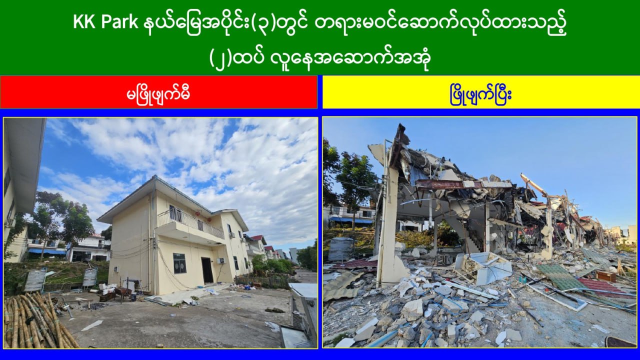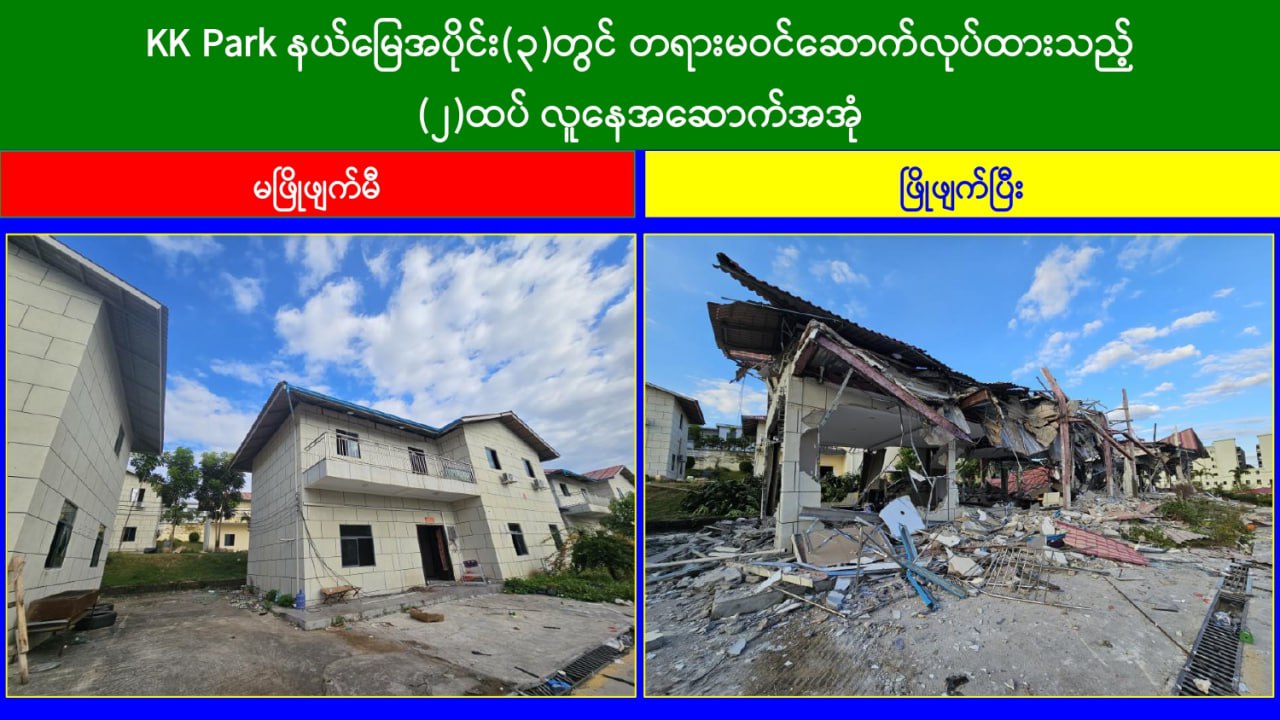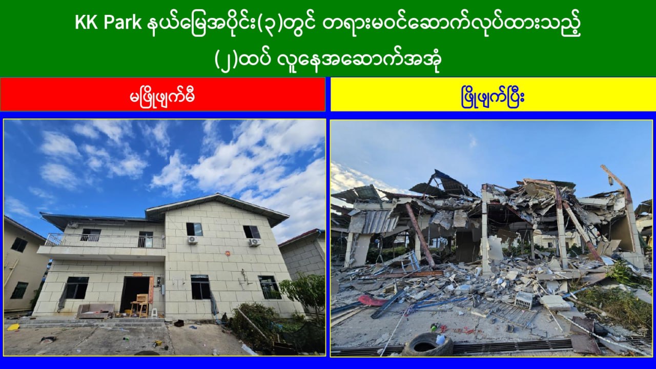 ထိုသို့ အွန်လိုင်းလိမ်လည်လောင်းကစားမှုတိုက်ဖျက်ရေး လုပ်ငန်းများဆောင်ရွက် လျက်ရှိရာ ယနေ့တွင် မြဝတီ-မဲထော်သလေး (KK Park) နယ်မြေအတွင်းရှိ အွန်လိုင်း လိမ်လည်လောင်းကစားမှုများ ကျူးလွန်ရာတွင် အသုံးပြုခဲ့သည့် အပိုင်း(၃) နယ်မြေ အတွင်းရှိ တရားမဝင် ၃ ထပ်အဆောက်အအုံ ၁ လုံး၊ ၂ ထပ်အဆောက်အအုံ ၁၁ လုံး၊ စုစုပေါင်း တရားမဝင်အဆောက်အအုံ ၁၂ လုံးကို ထပ်မံဖြိုချဖျက်ဆီးခဲ့သဖြင့် KK Park နယ်မြေအတွင်းရှိ တရားမဝင်အဆောက်အအုံ စုစုပေါင်း ၆၃၅ လုံး အနက် ၄၅၆ လုံးကို စနစ်တကျ ဖြိုချဖျက်ဆီးပြီးဖြစ်ကြောင်း သိရှိရသည်။