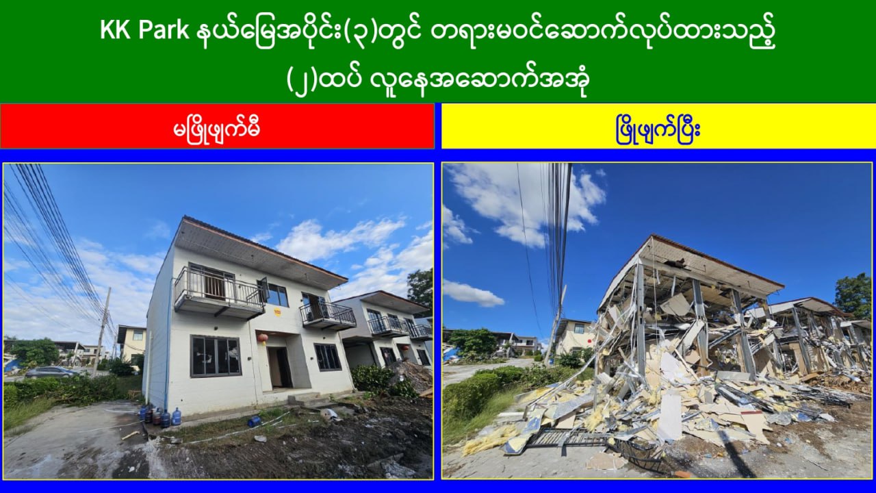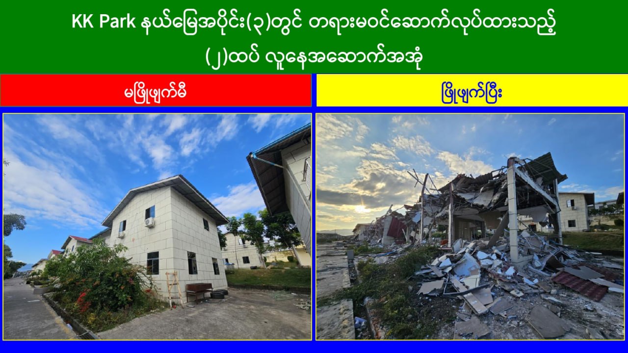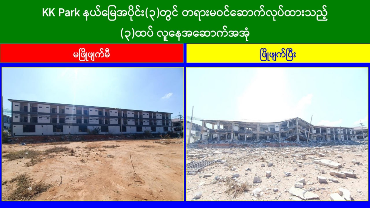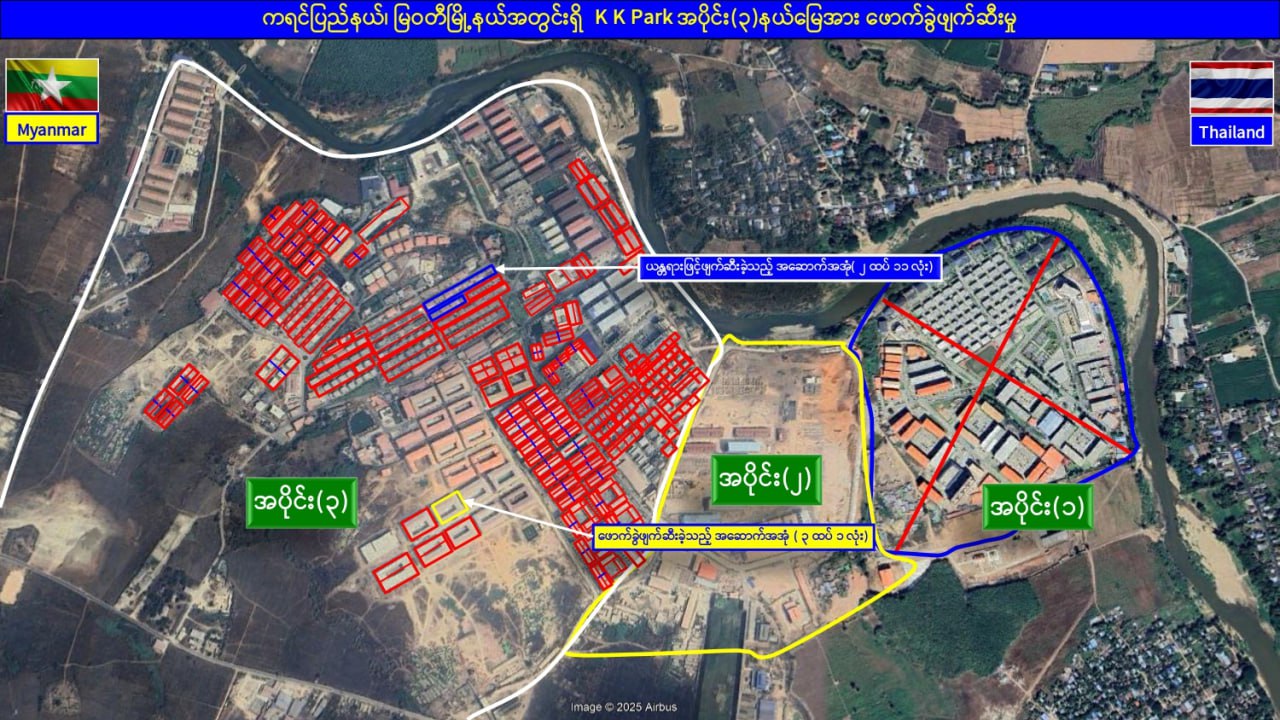 ထိုသို့ အွန်လိုင်းလိမ်လည်လောင်းကစားမှုတိုက်ဖျက်ရေး လုပ်ငန်းများဆောင်ရွက် လျက်ရှိရာ ယနေ့တွင် မြဝတီ-မဲထော်သလေး (KK Park) နယ်မြေအတွင်းရှိ အွန်လိုင်း လိမ်လည်လောင်းကစားမှုများ ကျူးလွန်ရာတွင် အသုံးပြုခဲ့သည့် အပိုင်း(၃) နယ်မြေ အတွင်းရှိ တရားမဝင် ၃ ထပ်အဆောက်အအုံ ၁ လုံး၊ ၂ ထပ်အဆောက်အအုံ ၁၁ လုံး၊ စုစုပေါင်း တရားမဝင်အဆောက်အအုံ ၁၂ လုံးကို ထပ်မံဖြိုချဖျက်ဆီးခဲ့သဖြင့် KK Park နယ်မြေအတွင်းရှိ တရားမဝင်အဆောက်အအုံ စုစုပေါင်း ၆၃၅ လုံး အနက် ၄၅၆ လုံးကို စနစ်တကျ ဖြိုချဖျက်ဆီးပြီးဖြစ်ကြောင်း သိရှိရသည်။