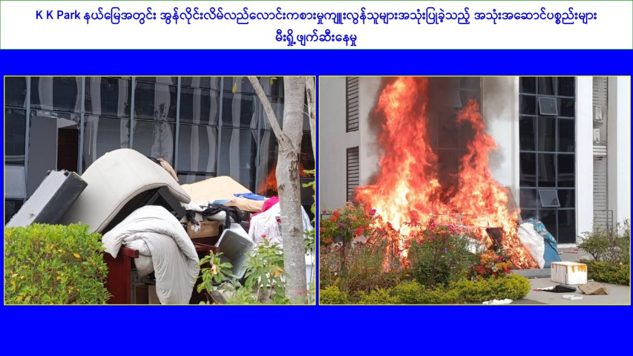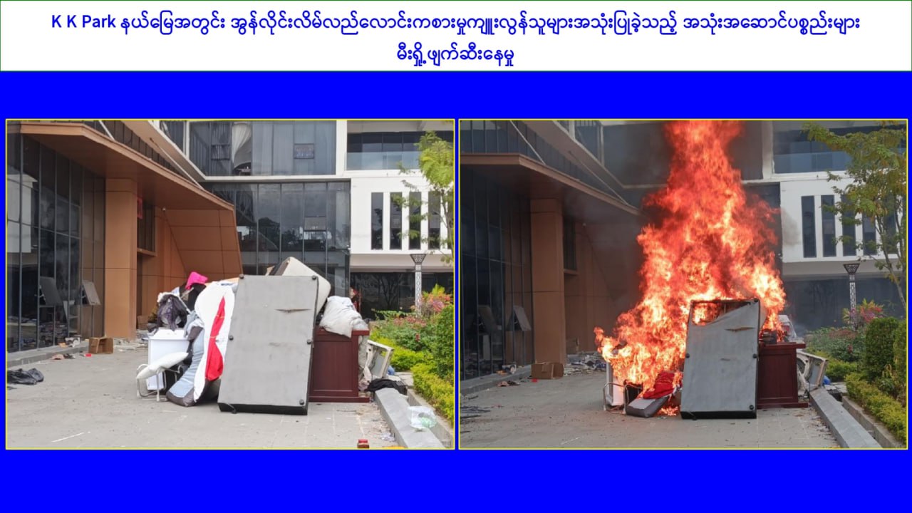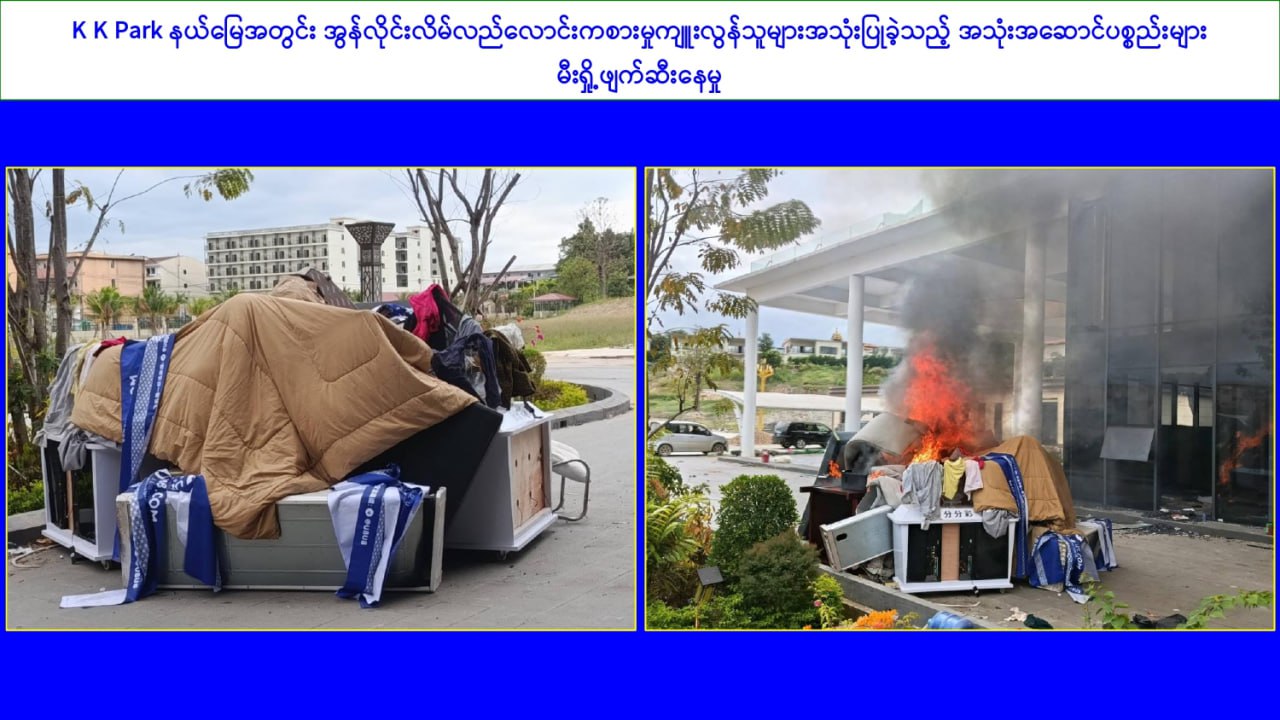 ၎င်းအပြင် မြဝတီမြို့နယ်အတွင်းရှိ KK Park နယ်မြေနှင့် ရွှေကုက္ကိုလ်နယ်မြေတို့၌ အွန်လိုင်းလိမ်လည်လောင်းကစားမှုကျူးလွန်ရာတွင် အသုံးပြုသည့်ပစ္စည်းများအား ထပ်မံ ၍ အသုံးပြုနိုင်ခြင်းမရှိစေရန်အတွက်ယနေ့တွင်လည်း စနစ်တကျ မီးရှို့ဖျက်ဆီးခဲ့ကြောင်း သိရှိရသည်။