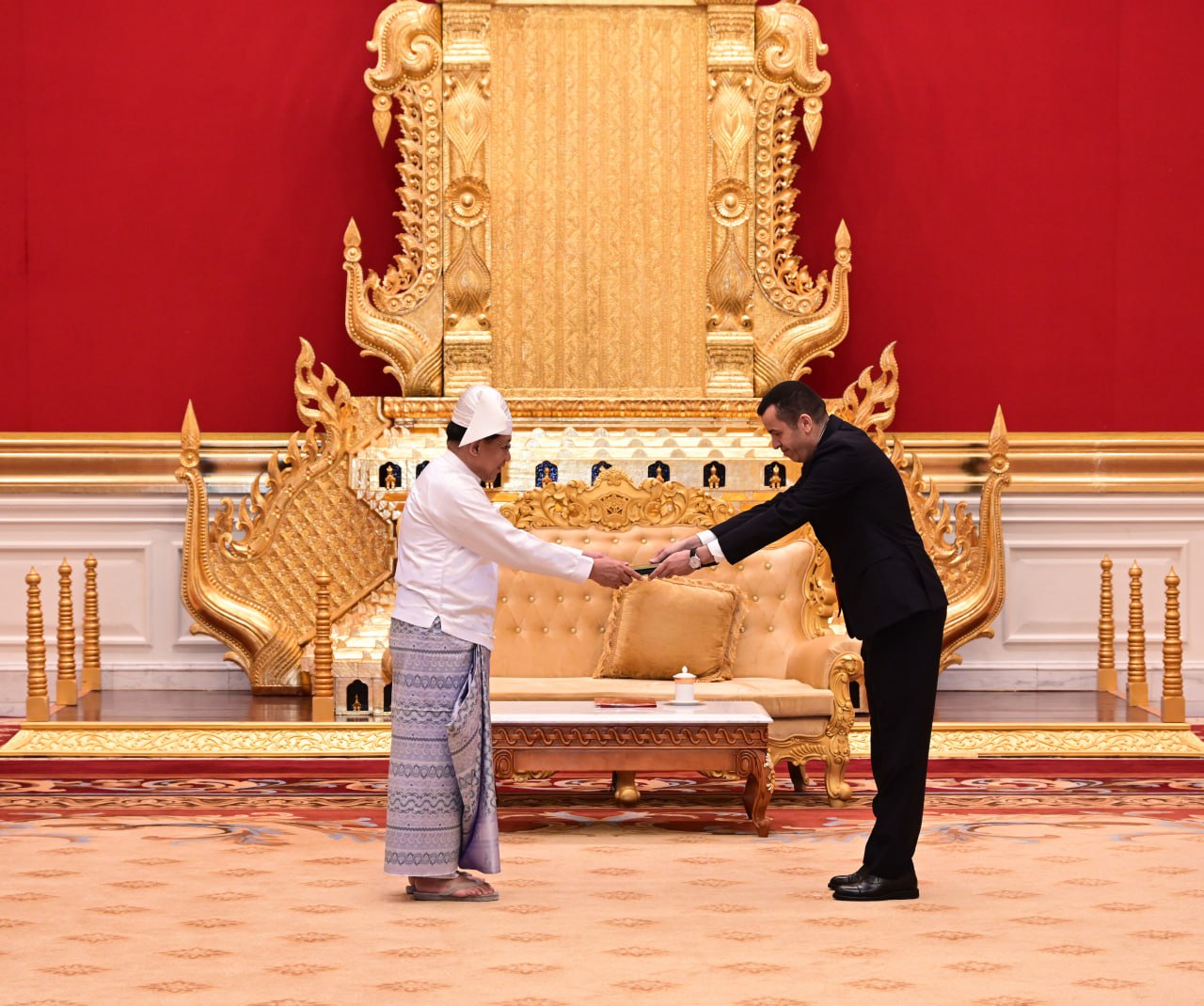ပြည်ထောင်စုသမ္မတမြန်မာနိုင်ငံတော် ယာယီသမ္မတ နိုင်ငံတော်လုံခြုံရေးနှင့် အေးချမ်းသာယာရေးကော်မရှင် ဥက္ကဋ္ဌ ဗိုလ်ချုပ်မှူးကြီး မင်းအောင်လှိုင်ထံ မြန်မာနိုင်ငံ ဆိုင်ရာ အယ်လ်ဂျီးရီးယား ပြည်သူ့ဒီမိုကရက်တစ်သမ္မတနိုင်ငံ သံအမတ်ကြီး H.E. Mr. Azeddine BECHKA က ယနေ့နံနက် ၁၀ နာရီတွင် နေပြည်တော်ရှိ အမျိုးသား ကာကွယ်ရေးနှင့်လုံခြုံရေးကောင်စီရုံး၊ သံတမန်ဆောင်ဧည့်ခန်းမ၌ ၎င်း၏သံအမတ် ခန့်အပ်လွှာကိုပေးအပ်သည်။