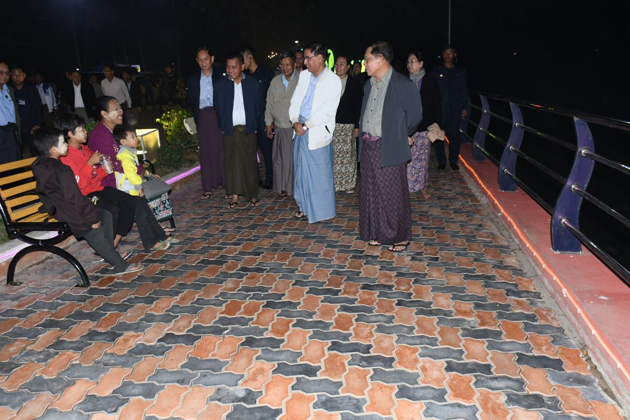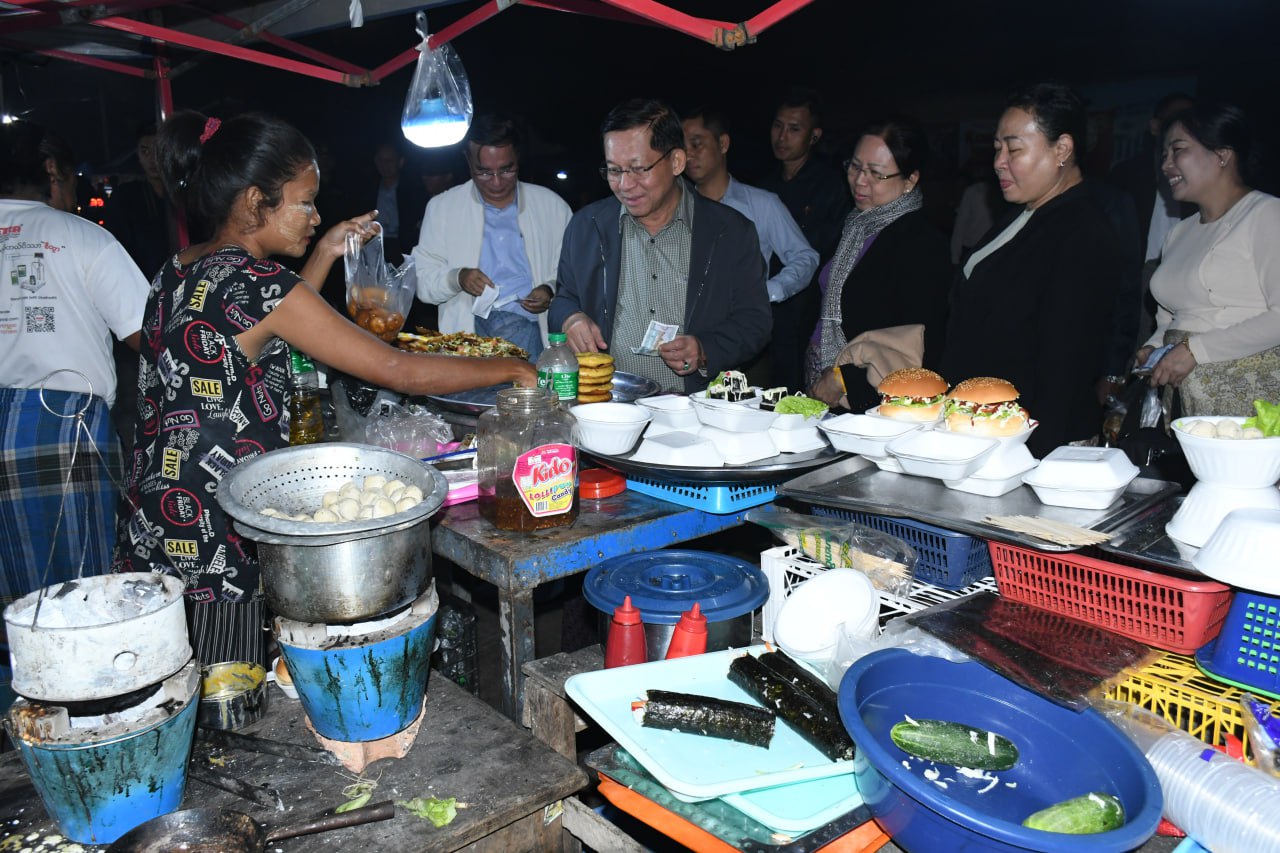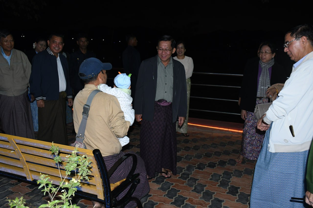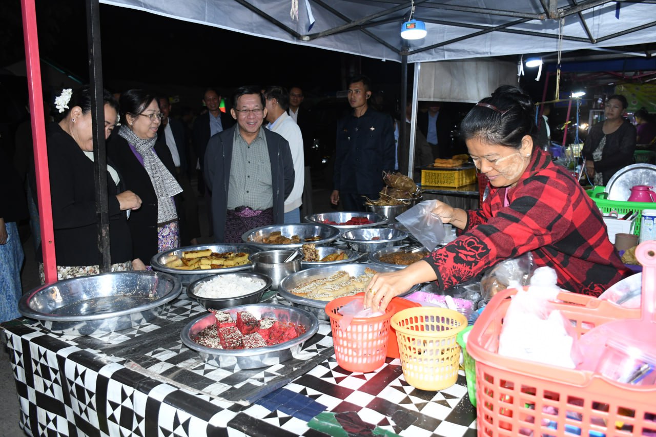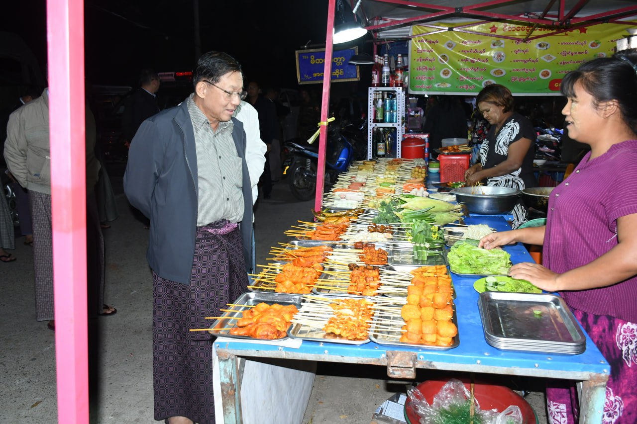 အလားတူ ယနေ့ညနေပိုင်းတွင် နိုင်ငံတော်ယာယီသမ္မတ နိုင်ငံတော်လုံခြုံရေး နှင့်အေးချမ်းသာယာရေးကော်မရှင်ဥက္ကဋ္ဌနှင့်ဇနီး၊ အဖွဲ့ဝင်များသည် ပြည်မြို့ ကမ်းနား လမ်းသို့ရောက်ရှိပြီး ကမ်းနားလမ်းရှိ ခေတ္တရာ ညဈေးတန်း၌ ဒေသရိုးရာအစား အသောက်များ၊ ဈေးဆိုင်ခန်းများဖွင့်လှစ်ရောင်းချနေမှုများကို လိုက်လံကြည့်ရှုပြီး ဈေး ရောင်းချနေသူများနှင့် လာရောက်စားသုံးကြသည့် ပြည်သူလူထုများအား ရင်းရင်းနှီးနှီး နှုတ်ဆက်သည်။