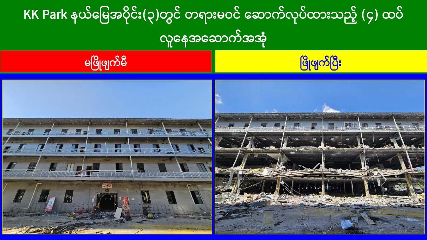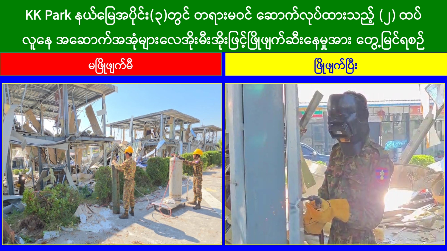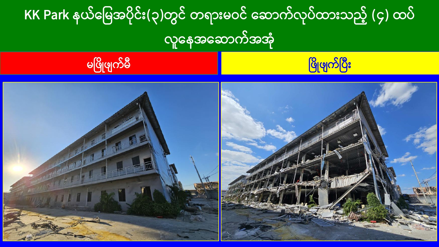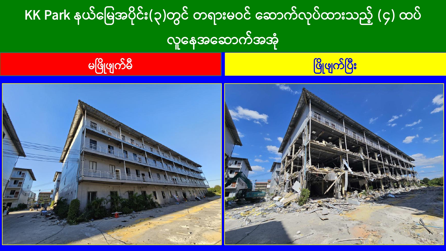 ထိုသို့ အွန်လိုင်းလိမ်လည်လောင်းကစားမှုတိုက်ဖျက်ရေးလုပ်ငန်းများဆောင်ရွက် လျက်ရှိရာ ယနေ့တွင် မြဝတီ-မဲထော်သလေး (KK Park) နယ်မြေအတွင်းရှိ အွန်လိုင်း လိမ်လည်လောင်းကစားမှုများ ကျူးလွန်ရာတွင် အသုံးပြုခဲ့သည့် အပိုင်း(၃) နယ်မြေ အတွင်းရှိ တရားမဝင် ၄ ထပ်အဆောက်အအုံ ၃ လုံးကို ထပ်မံဖြိုချဖျက်ဆီးခဲ့သဖြင့် KK Park နယ်မြေအတွင်းရှိ တရားမဝင် အဆောက်အအုံ စုစုပေါင်း ၆၃၅ လုံး အနက် ၄၈၅ လုံးကို စနစ်တကျ ဖြိုချဖျက်ဆီး ပြီးဖြစ်ကြောင်း သိရှိရသည်။