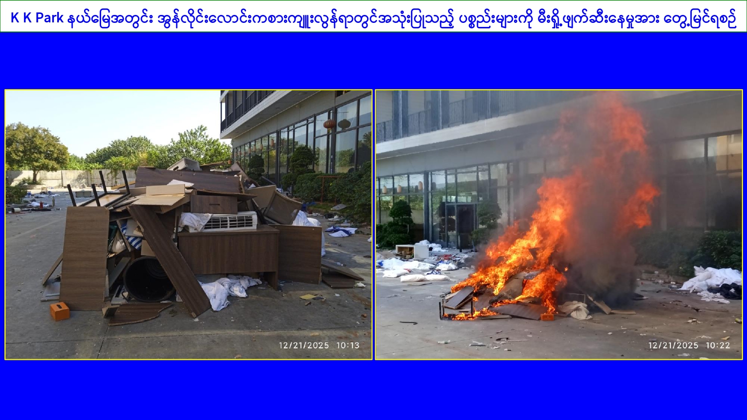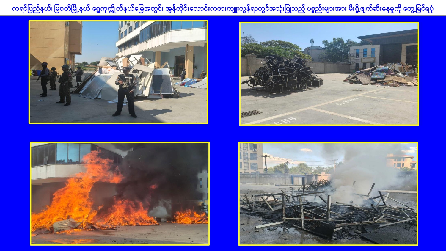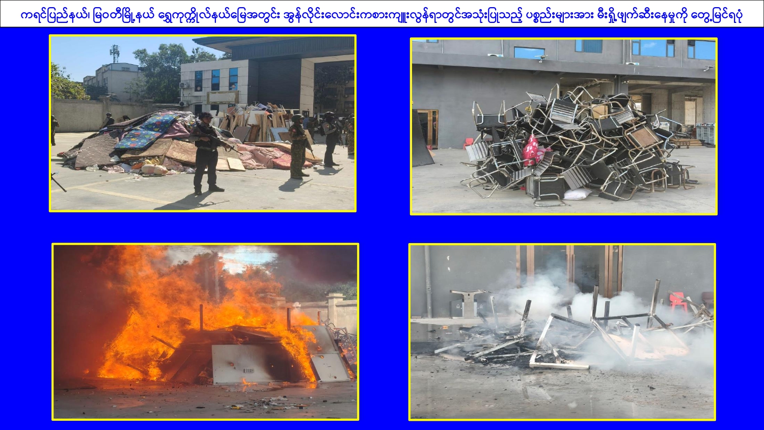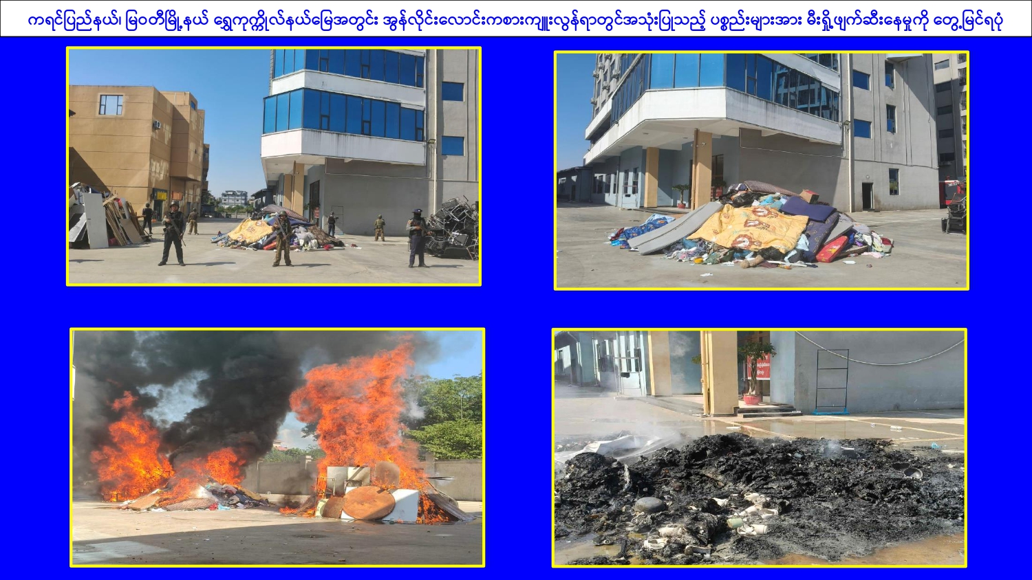 ၎င်းအပြင် မြဝတီမြို့နယ်အတွင်းရှိ KK Park နယ်မြေနှင့် ရွှေကုက္ကိုလ်နယ်မြေတို့၌ အွန်လိုင်းလိမ်လည်လောင်းကစားမှု ကျူးလွန်ရာတွင် အသုံးပြုသည့်ပစ္စည်းများအား ထပ်မံ၍ အသုံးပြုနိုင်ခြင်းမရှိစေရန်အတွက်ယနေ့တွင်လည်း စနစ်တကျ မီးရှို့ဖျက်ဆီး ခဲ့ကြောင်း သိရှိရသည်။