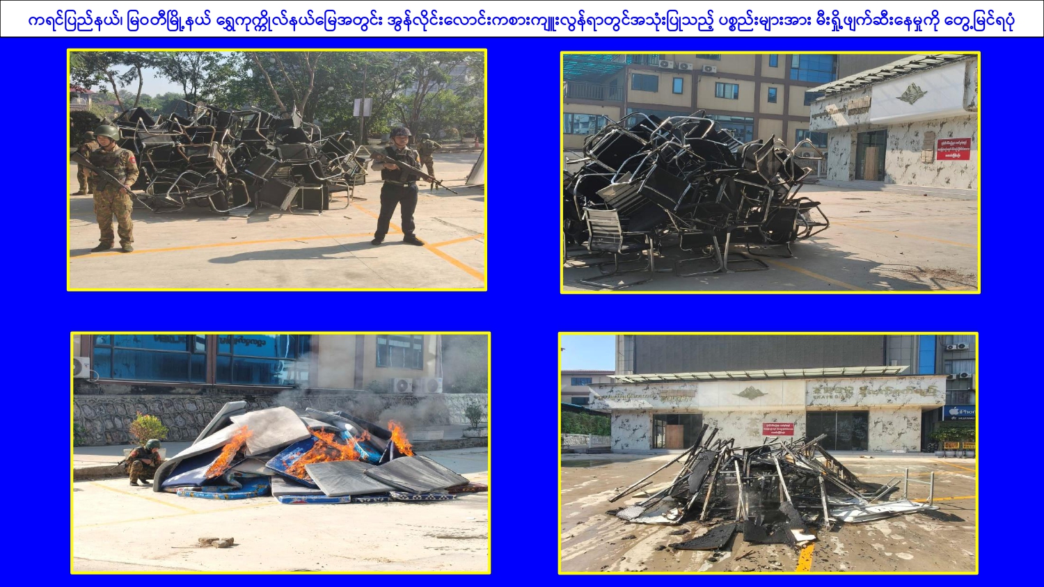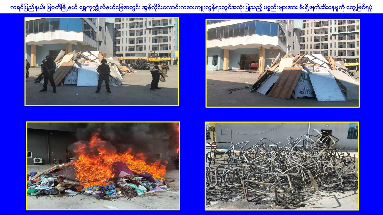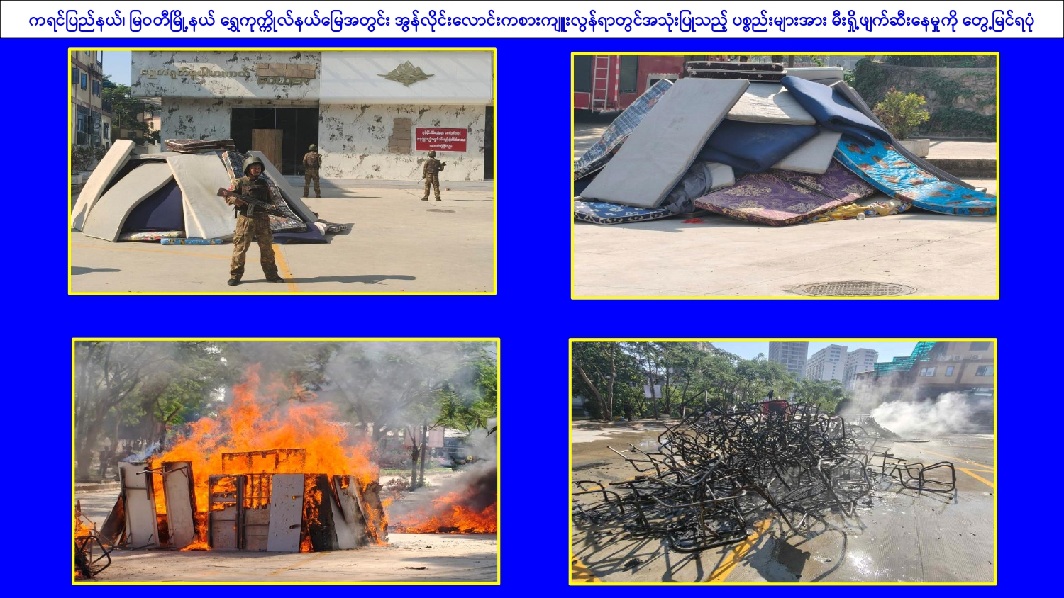 ၎င်းအပြင် မြဝတီမြို့နယ်အတွင်းရှိ KK Park နယ်မြေနှင့် ရွှေကုက္ကိုလ်နယ်မြေတို့၌ အွန်လိုင်းလိမ်လည်လောင်းကစားမှု ကျူးလွန်ရာတွင် အသုံးပြုသည့်ပစ္စည်းများအား ထပ်မံ၍ အသုံးပြုနိုင်ခြင်းမရှိစေရန်အတွက်ယနေ့တွင်လည်း စနစ်တကျ မီးရှို့ဖျက်ဆီး ခဲ့ကြောင်း သိရှိရသည်။