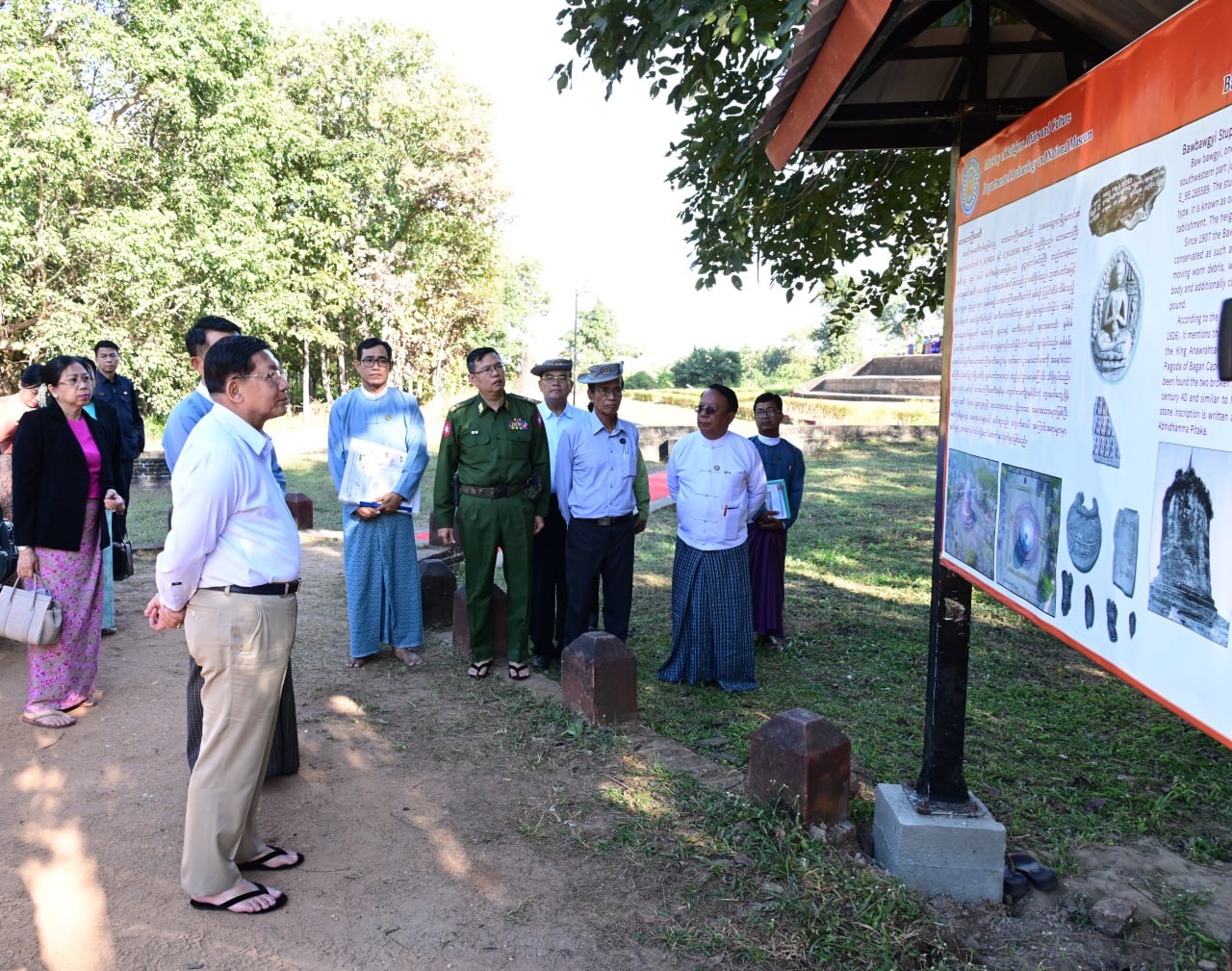 ယင်းနောက် နိုင်ငံတော်ယာယီသမ္မတ နိုင်ငံတော်လုံခြုံရေးနှင့် အေးချမ်းသာယာ ရေး ကော်မရှင်ဥက္ကဋ္ဌနှင့်ဇနီး၊ အဖွဲ့ဝင်များသည် သရေခေတ္တရာမြို့ဟောင်း၏ အနောက် တောင်ဘက်ရှိ ဒွတ္တဘောင်မင်းကြီးတည်ထားခဲ့သော ရှေးဟောင်းသမိုင်းဝင် အထင် ကရ စေတီတစ်ဆူဖြစ်သည့် ဘောဘောကြီးစေတီသို့ ရောက်ရှိကြရာ သာသနာရေးနှင့် ယဉ်ကျေးမှုဝန်ကြီးဌာန၊ ရှေးဟောင်းသုတေသနနှင့် အမျိုးသားပြတိုက်ဦးစီးဌာနမှ တာဝန်ရှိသူများက စေတီတော်ကြီးအား ရှေးမူလက်ရာမပြတ် ထိန်းသိမ်းထားရှိမှုအခြေ အနေများကို ရှင်းလင်းတင်ပြသည်။