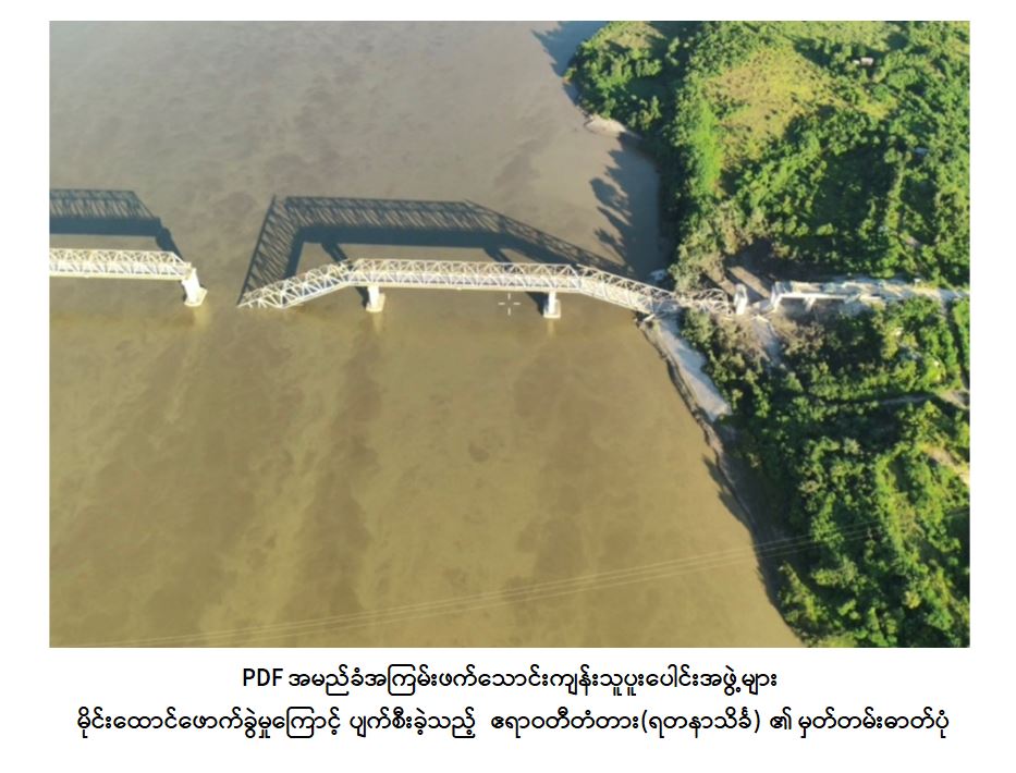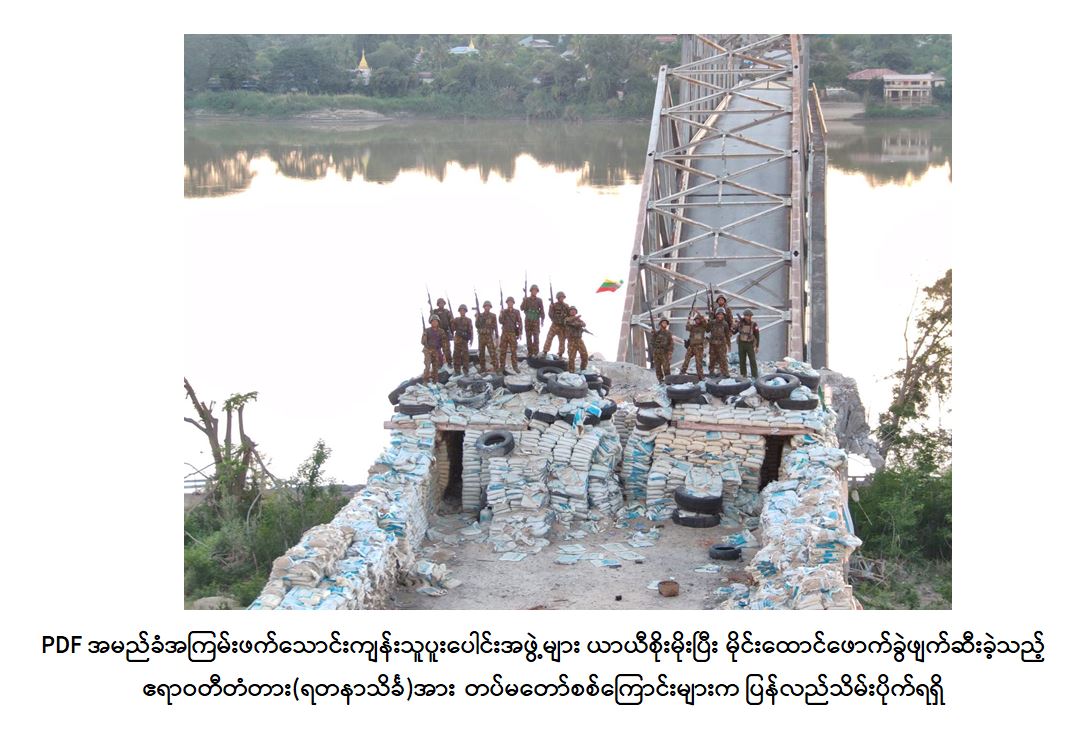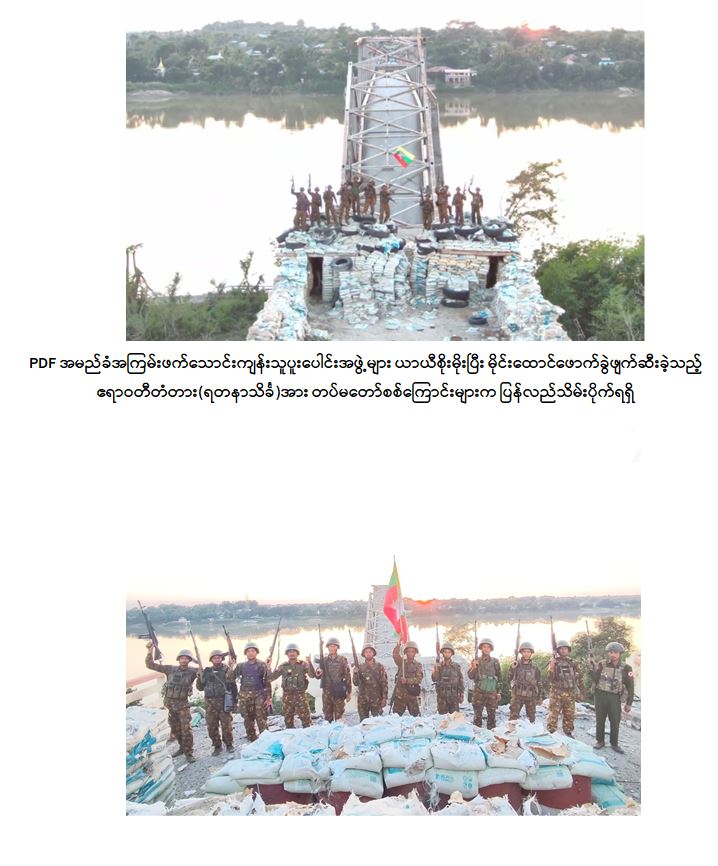 PDF အမည်ခံအကြမ်းဖက်သောင်းကျန်းသူပူးပေါင်းအဖွဲ့များအနေဖြင့် အဆိုပါ ဒေသအား ယာယီစိုးမိုးထားစဉ် မြို့/ရွာများအတွင်း ဘာသာရေးဆိုင်ရာအဆောက်အအုံ များ၊ စာသင်ကျောင်းများ၊ ဌာနဆိုင်ရာအဆောက်အအုံများ၊ ဆေးရုံများနှင့် လူနေ အိမ်များအတွင်း ဝင်ရောက်နေရာယူ၍ ဘန်ကာများပြုလုပ်ခြင်း၊ ပြည်သူများ၏ အိုးအိမ်များကို ခံစစ်တံတိုင်းအဖြစ် အကာကွယ်ရယူ၍ ပစ်ခတ်တိုက်ခိုက်ခြင်း၊ ပြည်သူများ အဓိကသွားလာအသုံးပြုလျက်ရှိသည့် လမ်း/တံတားများအား မိုင်းထောင် ဖောက်ခွဲခြင်းများ ဆောင်ရွက်လျက်ရှိရာ အောက်တိုဘာလ ၂၉ ရက်နေ့တွင်လည်း မန္တလေးတိုင်း ဒေသကြီး၊ စဉ့်ကူးမြို့နှင့် စစ်ကိုင်းတိုင်းဒေသကြီး၊ ကျောက်မြောင်းမြို့ကို ဆက်သွယ်ထား၍ ပြည်သူလူထု၏ လမ်းပန်းဆက်သွယ်ရေးနှင့် ကုန်စည်စီးဆင်းမှုတို့ အတွက် အဓိကအရေးပါသည့် ဧရာဝတီတံတား (ရတနာသိင်္ခ)ကိုလည်း မိုင်းထောင် ဖောက်ခွဲဖျက်ဆီးခဲ့သဖြင့် တံတား၏ ရေလည်တိုင်များဖြစ်သည့် တိုင်အမှတ် RP4 နှင့် RP5 တို့အကြားတွင် လည်းကောင်း၊ RP6-A2 ချဉ်းကပ်လမ်းနေရာတို့တွင် လည်း ကောင်းကျိုးကျပျက်စီးခဲ့သဖြင့် မော်တော်ယာဉ်များနှင့် ခရီးသွားပြည်သူများဖြတ်သန်း သွားလာနိုင်ခြင်း မရှိတော့ဘဲ ကုန်စည်စီးဆင်းမှုများ ရပ်တန့်ခဲ့ရသည်။