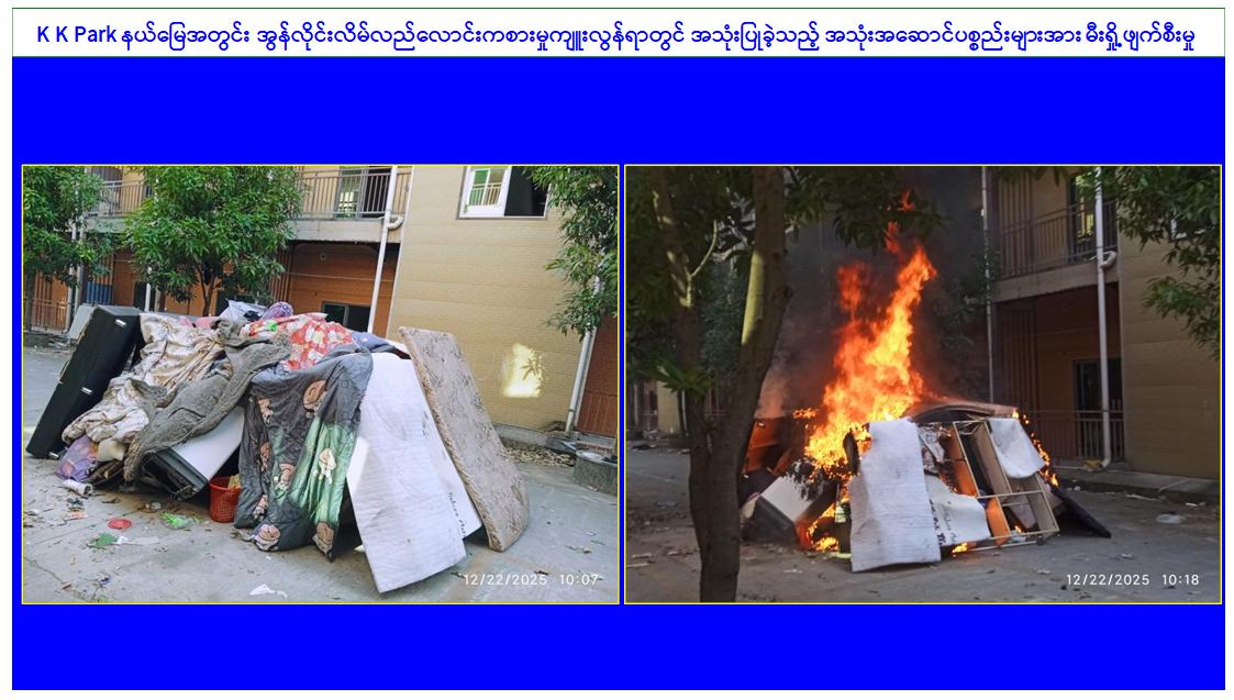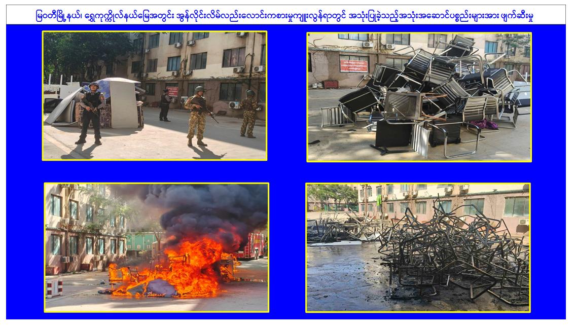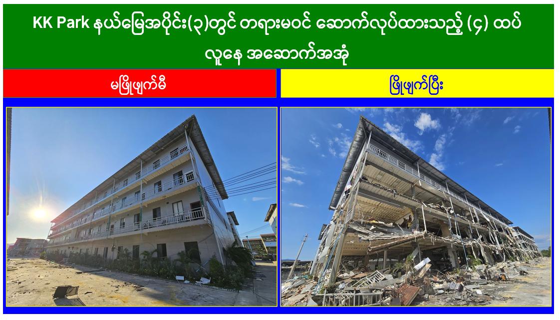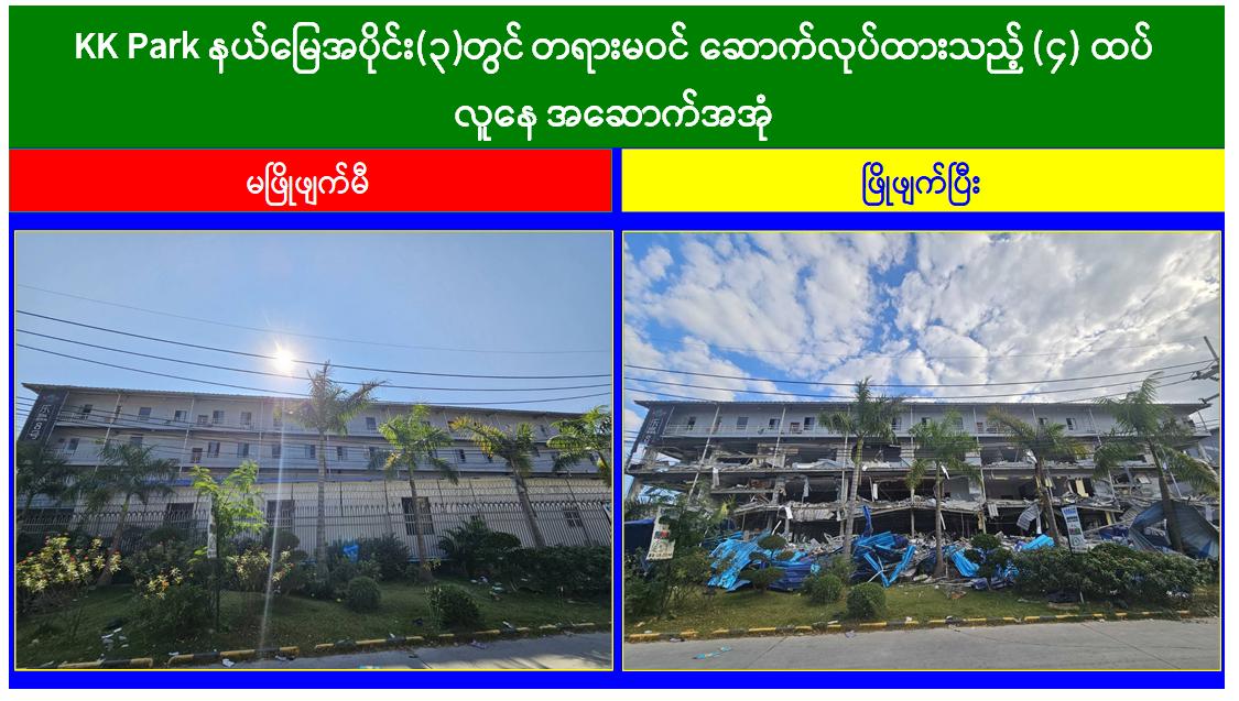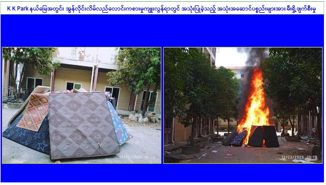 KK Park နယ်မြေအတွင်း အွန်လိုင်းလိမ်လည်လောင်းကစားမှု ကျူးလွန်ရာတွင် အသုံးပြုသည့် တရားမဝင်အဆောက်အအုံ ၄၈၈ လုံးကို စနစ်တကျဖြိုချဖျက်ဆီးပြီးစီး၊ မြဝတီမြို့နှင့် အနီးတစ်ဝိုက်ရှိ အွန်လိုင်းလိမ်လည်လောင်းကစားမှုကျူးလွန်ရာတွင် အသုံးပြုသည့် အဆောက်အအုံများအား ချိပ်ပိတ်သိမ်းဆည်း နေပြည်တော်၊ ၂၀၂၅ ခုနှစ်၊ ဒီဇင်ဘာ ၂၂