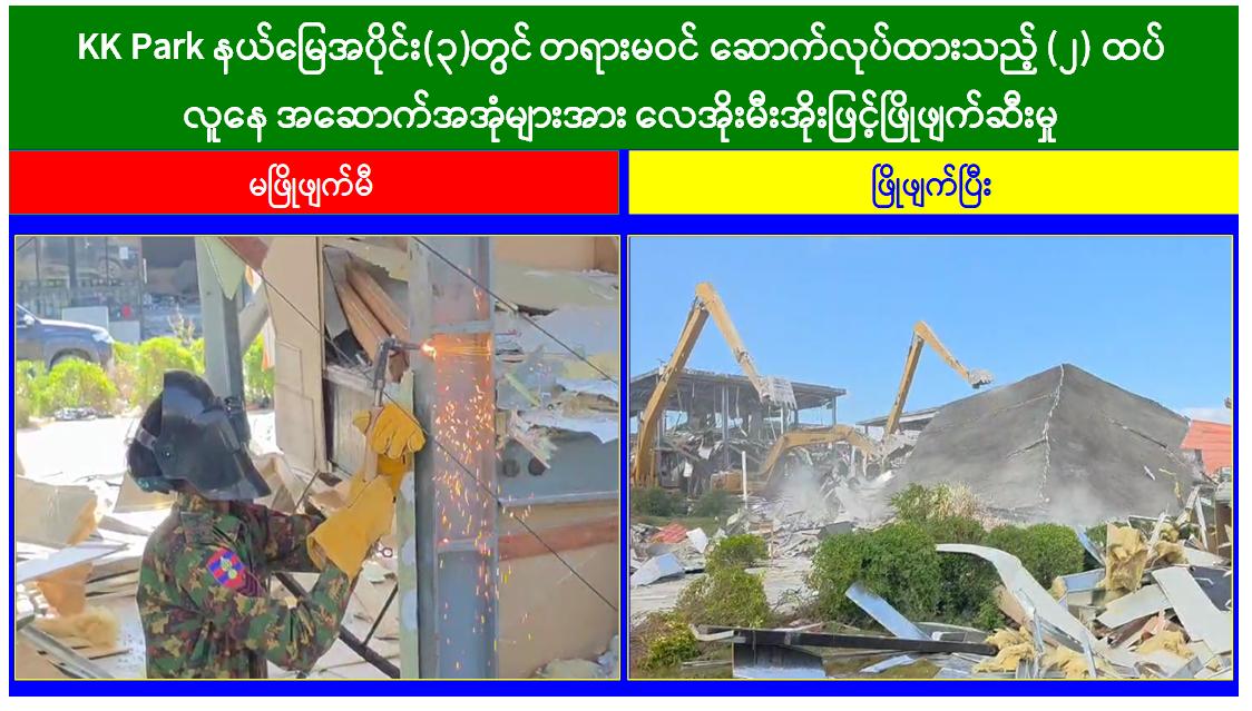ထိုသို့ အွန်လိုင်းလိမ်လည်လောင်းကစားမှုတိုက်ဖျက်ရေး လုပ်ငန်းများဆောင်ရွက် လျက်ရှိရာ ယနေ့တွင် မြဝတီ-မဲထော်သလေး (KK Park) နယ်မြေအတွင်းရှိ အွန်လိုင်း လိမ်လည်လောင်းကစားမှုများ ကျူးလွန်ရာတွင် အသုံးပြုခဲ့သည့် အပိုင်း(၃) နယ်မြေ အတွင်းရှိ တရားမဝင် ၄ ထပ်အဆောက်အအုံ ၃ လုံးကို ထပ်မံဖြိုချဖျက်ဆီးခဲ့သဖြင့် KK Park နယ်မြေအတွင်းရှိ တရားမဝင် အဆောက်အအုံ စုစုပေါင်း ၆၃၅ လုံး အနက် ၄၈၈ လုံး ကို စနစ်တကျ ဖြိုချဖျက်ဆီးပြီးဖြစ်ကြောင်း သိရှိရသည်။ အဆိုပါ KK Park နယ်မြေ အတွင်းရှိ အဆောက်အအုံများအနက် ယာဉ်ယန္တရားများအသုံးပြု၍ ဖြိုချဖျက်ဆီးခြင်းများ ဆောင်ရွက်ပြီးစီးခဲ့သည့် တရားမဝင်အဆောက်အအုံများကို အလုံးစုံပျက်စီးစေရန်အတွက် လေအိုးမီးအိုးဖြင့် ထပ်မံဖျက်ဆီးခြင်းများကိုလည်း ဒီဇင်ဘာ ၁၄ ရက်မှ စတင်ဆောင်ရွက် ခဲ့ရာ ယနေ့အထိ ၂ ထပ် အဆောက်အအုံ ၃၆ လုံးကို ရာခိုင်နှုန်းပြည့် ဖျက်ဆီးပြီးဖြစ် ကြောင်း သိရှိရသည်။