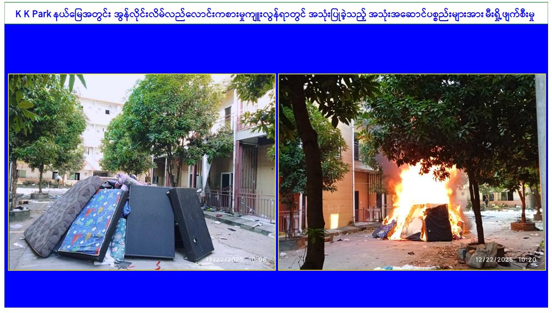၎င်းအပြင် KK park နှင့်ရွှေကုက္ကိုလ်နယ်မြေရှိ အွန်လိုင်းလိမ်လည်လောင်း ကစားမှု ကျူးလွန်ရာတွင် အသုံးပြုခဲ့သည့် ပစ္စည်းများအား ထပ်မံအသုံးပြုမှုမရှိစေရေးအတွက် ယနေ့တွင်လည်း စနစ်တကျမီးရှို့ဖျက်ဆီးခဲ့ကြောင်းနှင့် နိုင်ငံတော်အစိုးရအနေဖြင့် အွန်လိုင်းလိမ်လည် လောင်းကစားမှုကျူးလွန်မှုများကို အမျိုးသားရေးတာဝန်တစ်ရပ် အဖြစ်ခံယူကာ မြန်မာနိုင်ငံအတွင်း လုံးဝအခြေမပြုနိုင်ရေး ပြည်တွင်းအင်အားစုများ အပြင် အိမ်နီးချင်းနိုင်ငံအစိုးရများနှင့်လည်း ပေါင်းစပ်ညှိနှိုင်း၍ ဆက်လက်ဆောင်ရွက် သွားမည်ဖြစ်ကြောင်း သတင်းရရှိသည်။