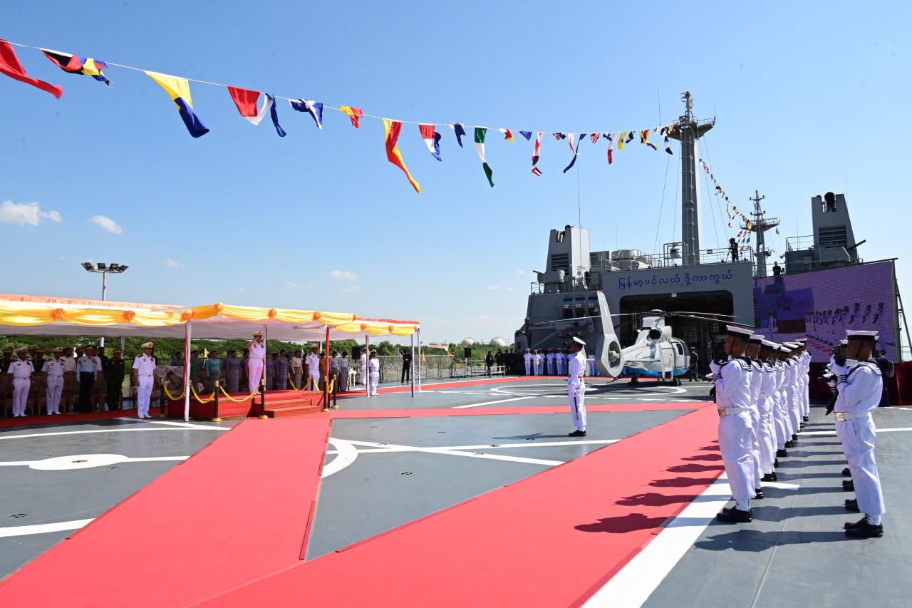 ပြည်ထောင်စုသမ္မတမြန်မာနိုင်ငံတော်၊ တပ်မတော်(ရေ)ဖွဲ့စည်းတည်ထောင်မှု(၇၈) နှစ်မြောက်နှစ်ပတ်လည်နေ့အခမ်းအနားကို ယနေ့နံနက်ပိုင်းတွင် သန်လျင်တပ်နယ်၊ ရေတပ်လေ့ကျင့်ရေးဌာနချုပ် သီရိမဟာဇေယျကျော်ထင် ခန်းမ၌ကျင်းပပြုလုပ်ရာ နိုင်ငံ တော်လုံခြုံရေးနှင့် အေးချမ်းသာယာရေးကော်မရှင်ဥက္ကဌ တပ်မတော်ကာကွယ်ရေးဦးစီး ချုပ် ဗိုလ်ချုပ်မှူးကြီး မင်းအောင်လှိုင် တက်ရောက်ချီးမြှင့်သည်။