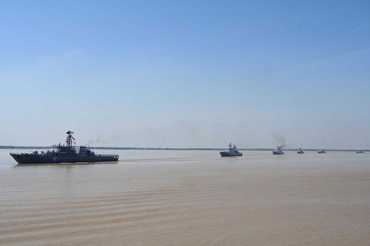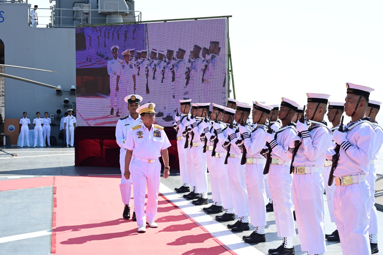 ဆက်လက်ပြီး နိုင်ငံတော်လုံခြုံရေးနှင့်အေးချမ်းသာယာရေးကော်မရှင်ဥက္ကဌ တပ်မတော်ကာကွယ်ရေးဦးစီးချုပ်သည် စစ်ရေယာဉ်(မုတ္တမ)ပေါ်ရှိ အလေးပြုခံစင်မြင့်မှ နေ၍ ဂုဏ်ပြုတပ်ဖွဲ့၏အလေးပြုခြင်းကိုခံယူပြီး ဂုဏ်ပြုတပ်ဖွဲ့ကိုစစ်ဆေးသည်။ ဂုဏ်ပြု တပ်ဖွဲ့၏အလေးပြုခြင်းကိုခံယူနေစဉ် စစ်ရေယာဉ်(ရန်တိုင်းအောင်)နှင့် စစ်ရေယာဉ် (ရန်ကြီးအောင်)တို့မှ အမြောက်(၂၁)ချက်ပစ်ဖောက်ပြီး နိုင်ငံတော်လုံခြုံရေးနှင့် အေးချမ်း သာယာရေးကော်မရှင်ဥက္ကဌ တပ်မတော်ကာကွယ်ရေးဦးစီးချုပ်အား ဂုဏ်ပြုအလေးပြု ကြသည်။ ၎င်းနောက် နိုင်ငံတော်လုံခြုံရေးနှင့်အေးချမ်းသာယာရေးကော်မရှင်ဥက္ကဌ တပ်မတော်ကာကွယ်ရေးဦးစီးချုပ်အား ရေငုတ်သင်္ဘောစစ်ရေယာဉ်(မင်းရဲကျော်ထင်) ဖရီ ဂိတ်စစ်ရေယာဉ်(အောင်ဇေယျ) ဦးဆောင်သော ဖရီဂိတ်စစ်ရေယာဉ်(ကျန်စစ်သား)၊ ဖရီ ဂိတ်စစ်ရေယာဉ်(ဆင်ဖြူရှင်)၊ ကော်ဗက်စစ်ရေယာဉ်(တပင်ရွှေထီး)၊ ကမ်းလွန်ကင်းလှည့် ရေယာဉ်(အင်းလေး)၊ ရေငုပ်သင်္ဘောတိုက်ဖျက်ရေးရေယာဉ်(ရန်ငြိမ်းအောင်)နှင့် ရေငုပ် သင်္ဘောတိုက်ဖျက်ရေးရေယာဉ်(ရန်ရဲအောင်)၊ အမြန်သွားတိုက်ခိုက်ရေးရေယာဉ်(ဒုံးပျံ) စစ်ရေယာဉ်(၄၉၁)၊ အမြန်သွားတိုက်ခိုက်ရေးရေယာဉ်(ဒုံးပျံ) စစ်ရေယာဉ်(၄၉၂)တို့က Single Line Formation ပုံစံဖြင့် လည်းကောင်း၊ အမြန်သွားတိုက်ခိုက်ရေး ရေယာဉ် စစ်ရေယာဉ် (၅၆၄)၊ (၅၆၆)၊ (၅၅၆)၊ (၅၅၈)၊ ကမ်းခြေစောင့်တိုက်ခိုက်ရေးရေယာဉ် စစ်ရေယာဉ်(၄၂၇)၊ (၄၂၈)၊ အမြန်သွားကင်းလှည့်ရေယာဉ် စစ်ရေယာဉ်(၂၇၁)၊ (၂၇၂)၊ (၂၇၆)၊ (၂၇၈)တို့က Line Abreast Formation ပုံပြုပုံစံများဖြင့် အသီးသီးပုံပြု မောင်းနှင်ပြီး နိုင်ငံတော်လုံခြုံရေးနှင့် အေးချမ်းသာယာရေးကော်မရှင်ဥက္ကဌ တပ်မတော် ကာကွယ်ရေးဦးစီးချုပ်အား ချီတက်အလေးပြုကြသည်။