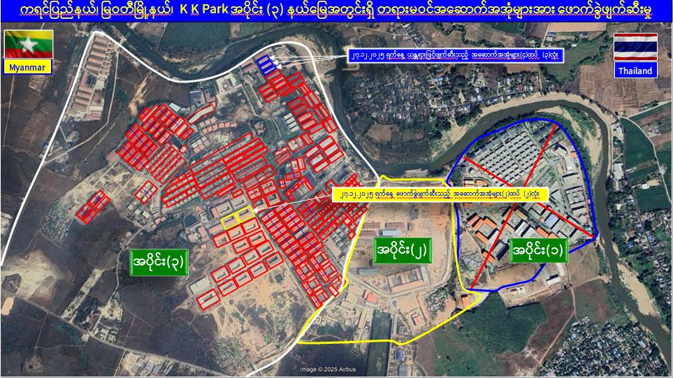 ယနေ့တွင် မြဝတီ-မဲထော်သလေး(KK Park)အပိုင်း(၃)နယ်မြေအတွင်းရှိ အွန်လိုင်း လိမ်လည်လောင်းကစားမှုများ ကျူးလွန်ရာတွင် အသုံးပြုခဲ့သည့် တရားမဝင် ၄ ထပ် အဆောက်အအုံ ၃ လုံး၊ ၂ ထပ်အဆောက်အအုံ ၂ လုံး စုစုပေါင်း တရားမဝင် အဆောက်အအုံ ၅ လုံးတို့ကို ထပ်မံဖြိုချဖျက်ဆီးခဲ့သဖြင့် KK Park နယ်မြေအတွင်းရှိ တရားမဝင် အဆောက်အအုံ စုစုပေါင်း ၆၃၅ လုံး အနက် ၅၀၉ လုံး ကို စနစ်တကျ ဖြိုချဖျက်ဆီးပြီးဖြစ်ကြောင်း သိရှိရသည်။