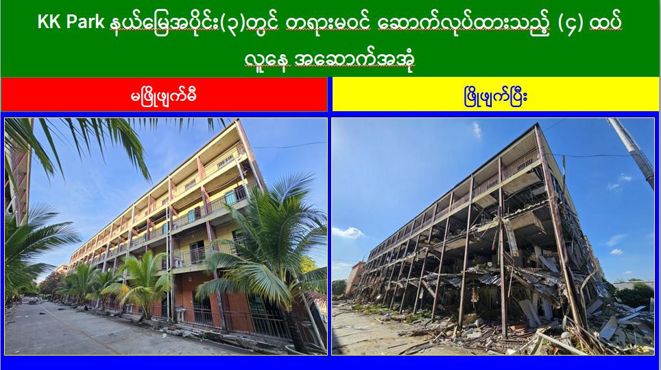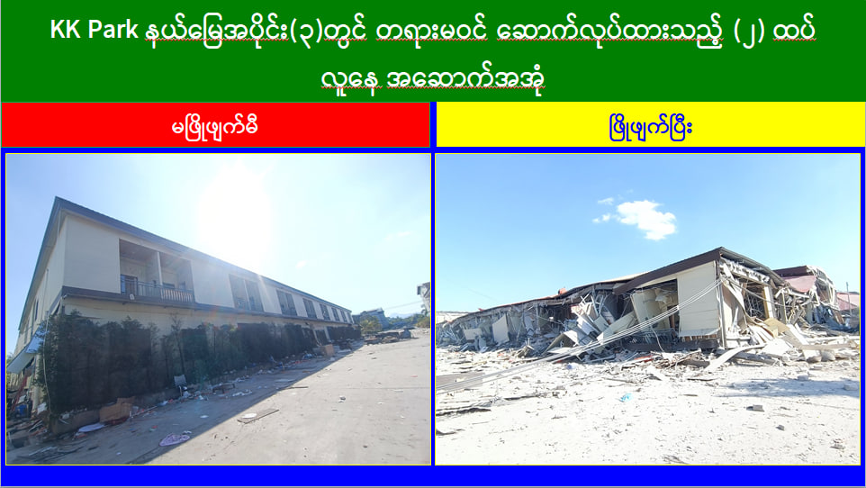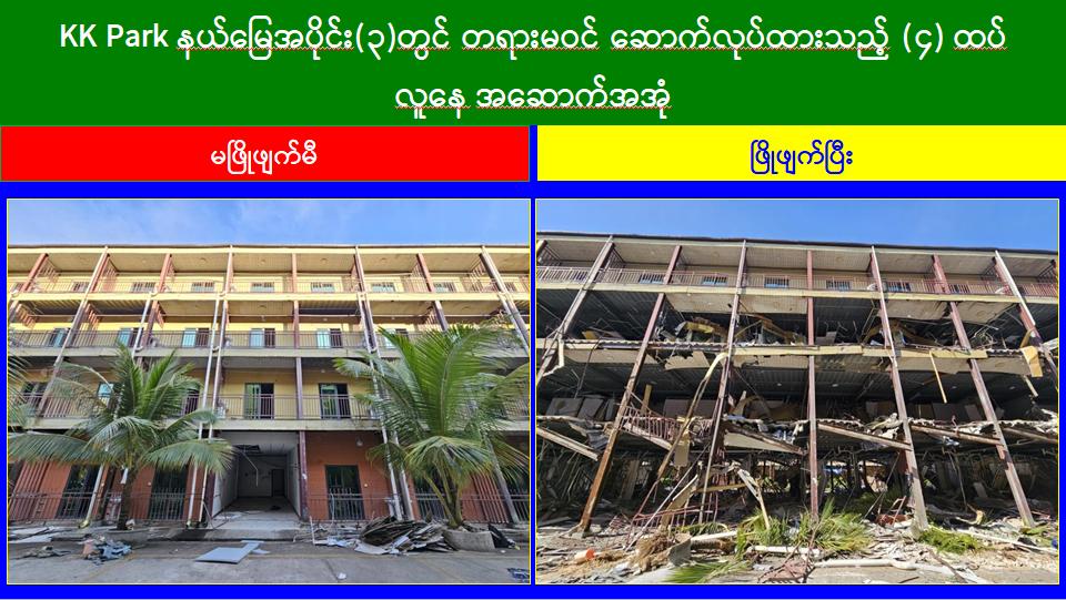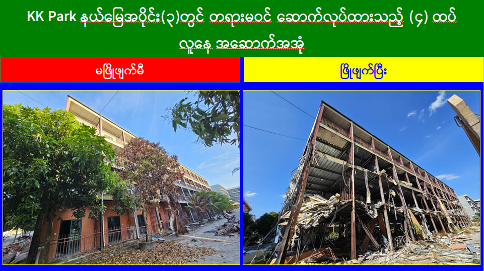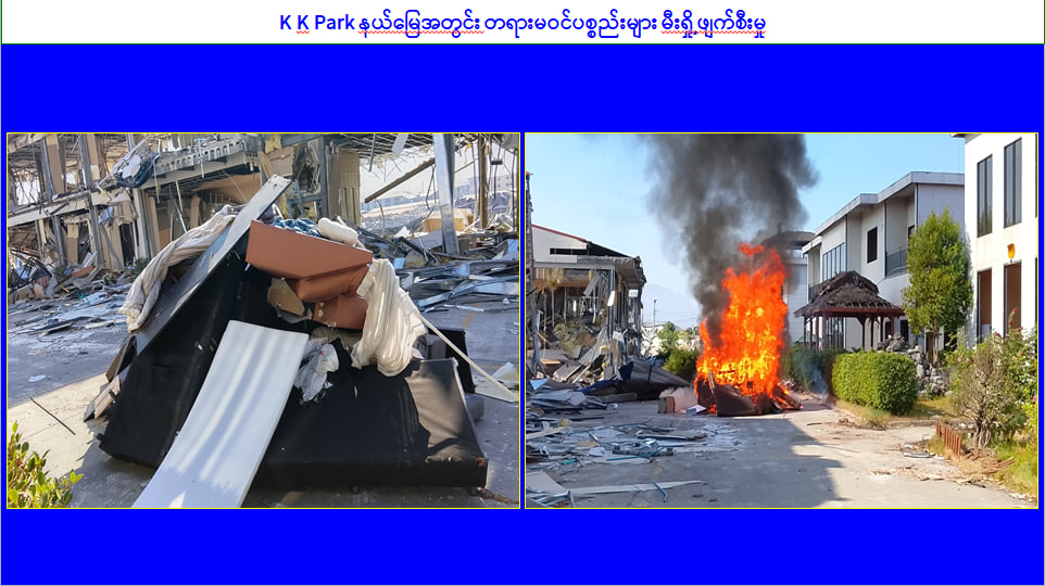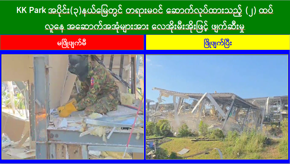 မြန်မာနိုင်ငံအစိုးရအနေဖြင့် အွန်လိုင်းလိမ်လည်လောင်းကစားမှုများ အများဆုံး အခြေချလုပ်ကိုင်လျက်ရှိကြသည့် ရွှေကုက္ကိုလ်နယ်မြေနှင့် KK Park နယ်မြေများရှိ တရားမဝင် အဆောက်အအုံများအတွင်း ဝင်ရောက်ရှင်းလင်းခြင်း၊ အွန်လိုင်းလိမ်လည် လောင်းကစားမှု လုပ်ငန်းစဉ်များတွင် အသုံးပြုခဲ့သည့် သိမ်းဆည်းရမိပစ္စည်းများနှင့် တရားမဝင် အဆောက်အအုံများအား စနစ်တကျဖြိုချဖျက်ဆီးခြင်းများကို လုံခြုံရေး တပ်ဖွဲ့ဝင်များ၊ အုပ်ချုပ်ရေးအဖွဲ့အစည်းများနှင့် ဒေသတွင်းတာဝန်ရှိသူများအပါအဝင် အဖွဲ့စုံပါဝင်သည့် ပူးပေါင်းအဖွဲ့ဖြင့် ဆောင်ရွက်လျက်ရှိရာ ယနေ့တွင် KK Park နယ်မြေအတွင်းရှိ တရားမဝင်အဆောက်အအုံ ၅ လုံးကို ထပ်မံဖြိုချဖျက်ဆီးခဲ့ကြောင်း သိရှိရသည်။