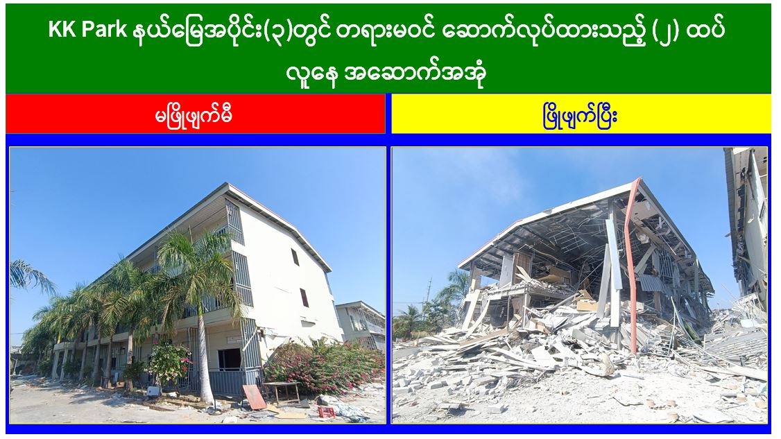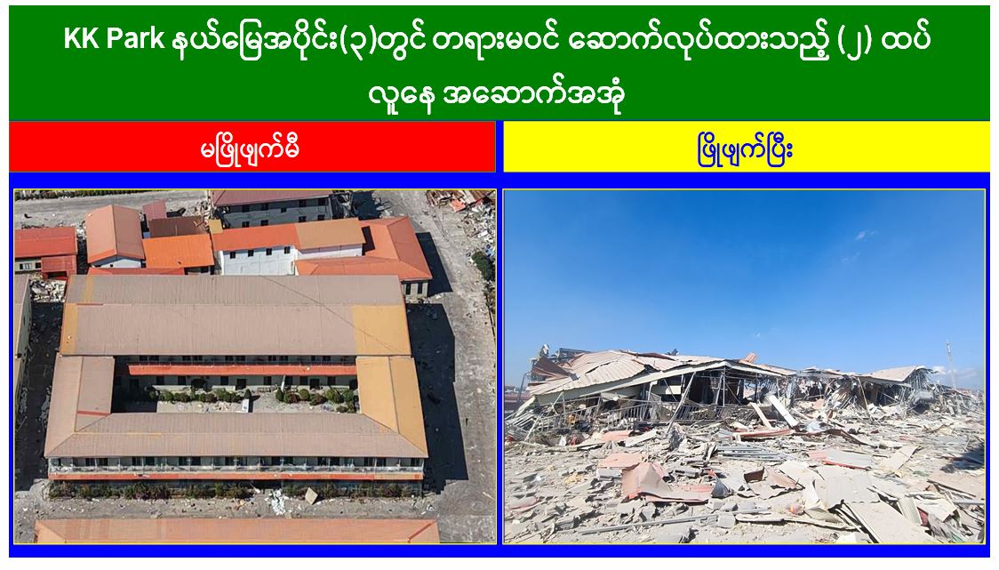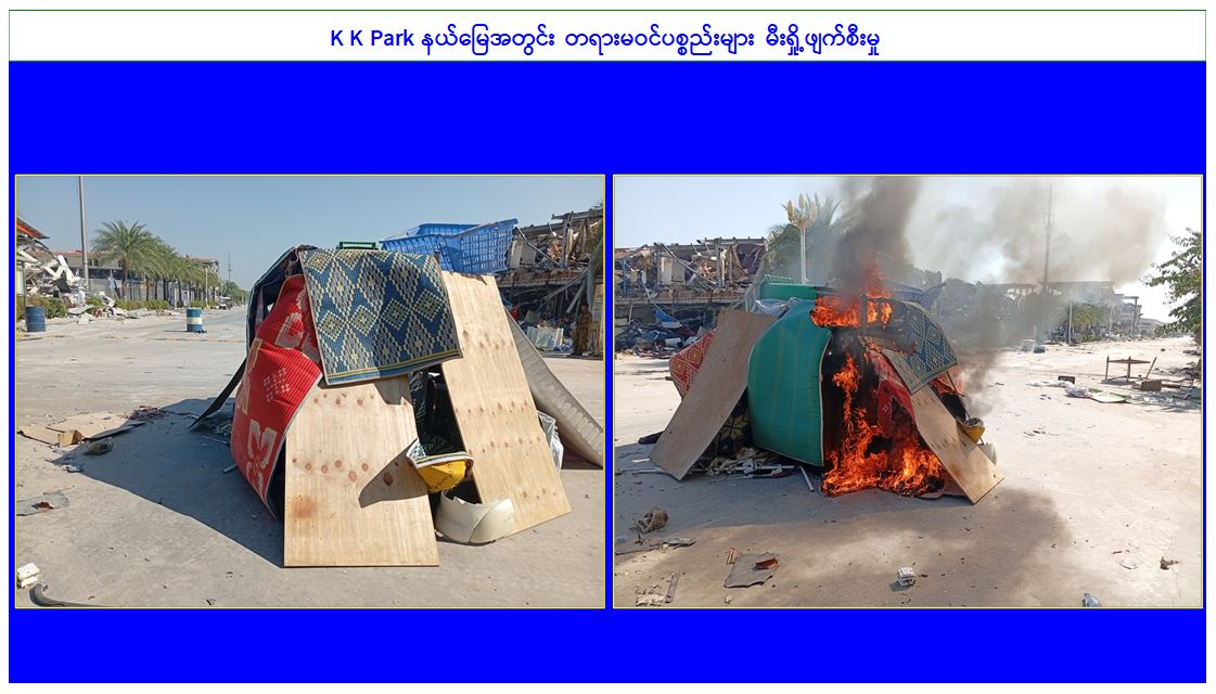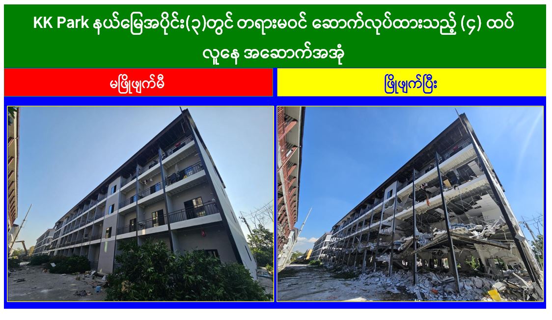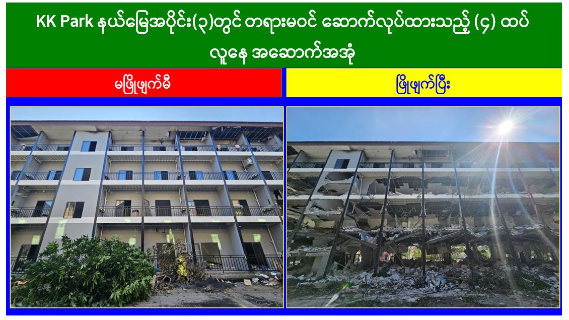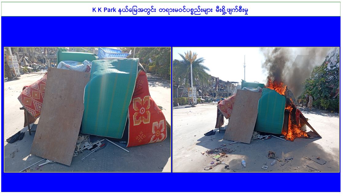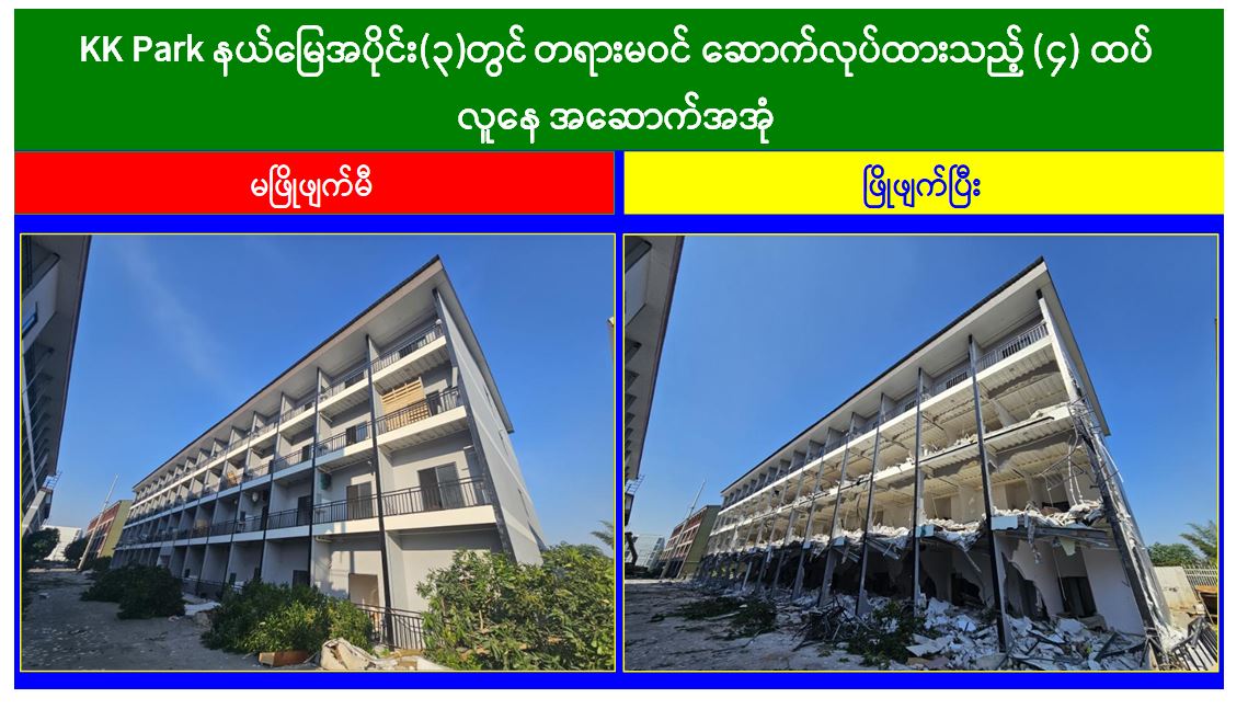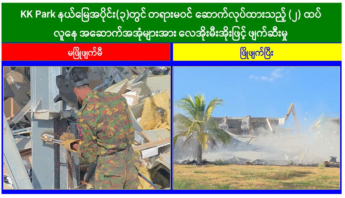 မြန်မာနိုင်ငံအစိုးရအနေဖြင့် အွန်လိုင်းလိမ်လည်လောင်းကစားမှုများ အများဆုံး အခြေချလုပ်ကိုင်လျက်ရှိကြသည့် ရွှေကုက္ကိုလ်နယ်မြေနှင့် KK Park နယ်မြေများရှိ တရားမဝင် အဆောက်အအုံများအတွင်း ဝင်ရောက်ရှင်းလင်းခြင်း၊ အွန်လိုင်းလိမ်လည် လောင်းကစားမှု လုပ်ငန်းစဉ်များတွင် အသုံးပြုခဲ့သည့် သိမ်းဆည်းရမိပစ္စည်းများနှင့် တရားမဝင် အဆောက်အအုံများအား စနစ်တကျဖြိုချဖျက်ဆီးခြင်းများကို လုံခြုံရေး တပ်ဖွဲ့ဝင်များ၊ အုပ်ချုပ်ရေးအဖွဲ့အစည်းများနှင့် ဒေသတွင်းတာဝန်ရှိသူများအပါအဝင် အဖွဲ့စုံပါဝင်သည့် ပူးပေါင်းအဖွဲ့ဖြင့် ဆောင်ရွက်လျက်ရှိရာ ယနေ့တွင် KK Park နယ်မြေ အတွင်းရှိ တရားမဝင်အဆောက်အအုံ ၆ လုံးကို ထပ်မံဖြိုချဖျက်ဆီးခဲ့ကြောင်း သိရှိရသည်။