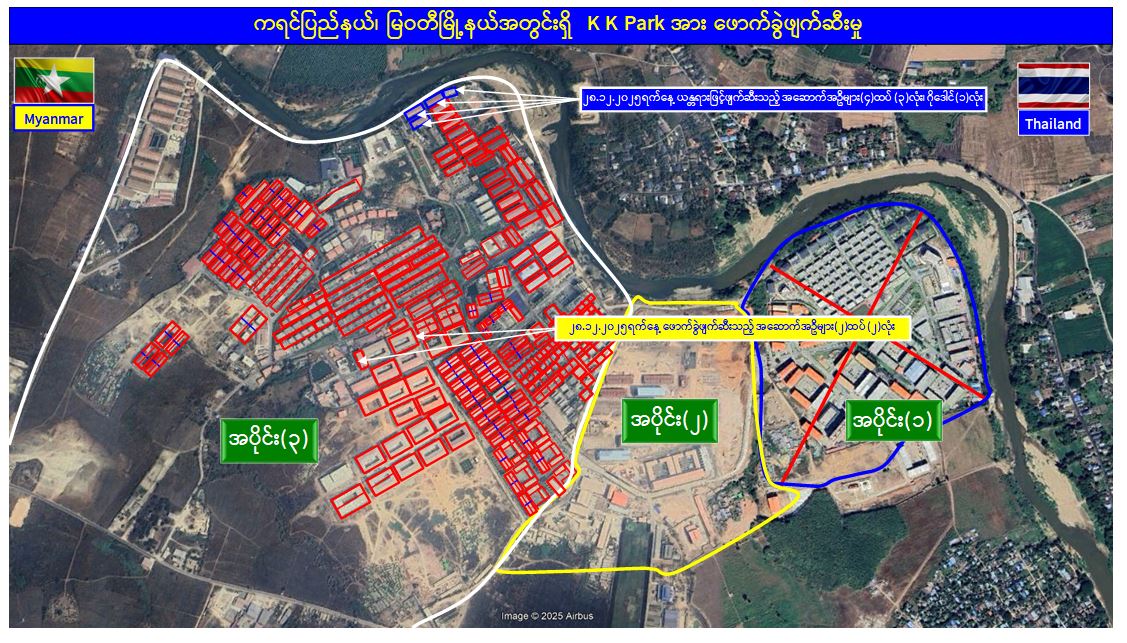 ယနေ့တွင် မြဝတီ-မဲထော်သလေး(KK Park)အပိုင်း(၃)နယ်မြေအတွင်းရှိ အွန်လိုင်း လိမ်လည်လောင်းကစားမှုများ ကျူးလွန်ရာတွင် အသုံးပြုခဲ့သည့် တရားမဝင် ၄ ထပ် အဆောက်အအုံ ၃ လုံး၊ ၂ ထပ်အဆောက်အအုံ ၂ လုံးနှင့် ဂိုဒေါင် ၁ လုံး၊ စုစုပေါင်း တရားမဝင် အဆောက်အအုံ ၆ လုံးတို့ကို ထပ်မံဖြိုချဖျက်ဆီးခဲ့သဖြင့် KK Park နယ်မြေအတွင်းရှိ တရားမဝင် အဆောက်အအုံ စုစုပေါင်း ၆၃၅ လုံး အနက် ၅၁၅ လုံးကို စနစ် တကျ ဖြိုချဖျက်ဆီးပြီးဖြစ်ကြောင်း သိရှိရသည်။