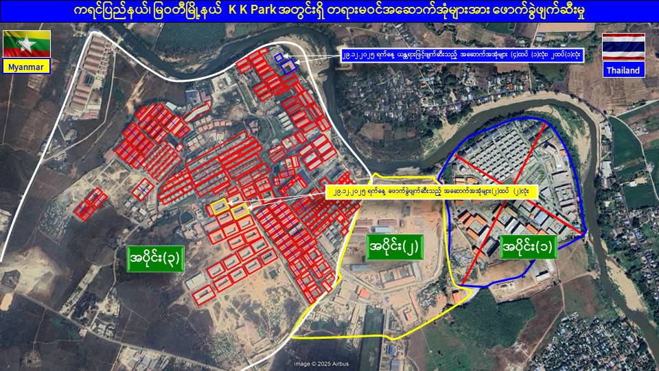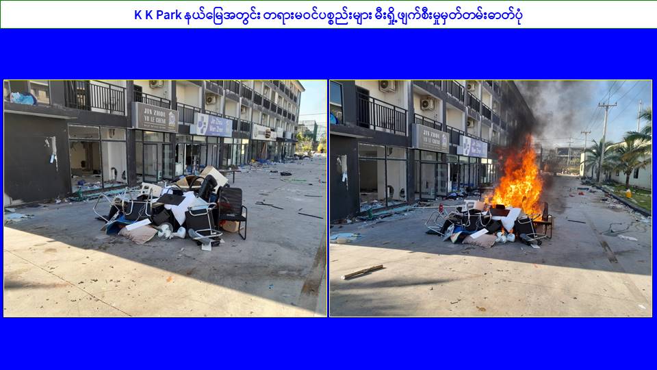 မြန်မာနိုင်ငံအစိုးရအနေဖြင့် အွန်လိုင်းလိမ်လည်လောင်းကစားမှုများ အများဆုံး အခြေချလုပ်ကိုင်လျက်ရှိကြသည့် ရွှေကုက္ကိုလ်နယ်မြေနှင့် KK Park နယ်မြေများရှိ တရားမဝင် အဆောက်အအုံများအတွင်း ဝင်ရောက်ရှင်းလင်းခြင်း၊ အွန်လိုင်းလိမ်လည် လောင်းကစားမှု လုပ်ငန်းစဉ်များတွင် အသုံးပြုခဲ့သည့် သိမ်းဆည်းရမိပစ္စည်းများနှင့် တရားမဝင် အဆောက်အအုံများအား စနစ်တကျဖြိုချဖျက်ဆီးခြင်းများကို လုံခြုံရေး တပ်ဖွဲ့ဝင်များ၊ အုပ်ချုပ်ရေးအဖွဲ့အစည်းများနှင့် ဒေသတွင်းတာဝန်ရှိသူများအပါအဝင် အဖွဲ့စုံပါဝင်သည့် ပူးပေါင်းအဖွဲ့ဖြင့် ဆောင်ရွက်လျက်ရှိရာ ယနေ့တွင် KK Park နယ်မြေအတွင်းရှိ တရားမဝင်အဆောက်အအုံ ၄ လုံးကို ထပ်မံဖြိုချဖျက်ဆီးခဲ့ကြောင်း သိရှိရသည်။