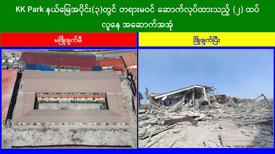 ယနေ့တွင် မြဝတီ-မဲထော်သလေး(KK Park)အပိုင်း(၃)နယ်မြေအတွင်းရှိ အွန်လိုင်း လိမ်လည်လောင်းကစားမှုများ ကျူးလွန်ရာတွင် အသုံးပြုခဲ့သည့် တရားမဝင် ၄ ထပ် အဆောက်အအုံ ၁ လုံးနှင့် ၂ ထပ်အဆောက်အအုံ ၃ လုံး စုစုပေါင်း တရားမဝင် အဆောက်အအုံ ၄ လုံးတို့ကို ထပ်မံဖြိုချဖျက်ဆီးခဲ့သဖြင့် KK Park နယ်မြေအတွင်းရှိ တရားမဝင် အဆောက်အအုံ စုစုပေါင်း ၆၃၅ လုံး အနက် ၅၁၉ လုံး ကို စနစ်တကျ ဖြိုချဖျက်ဆီးပြီးဖြစ်ကြောင်း သိရှိရသည်။