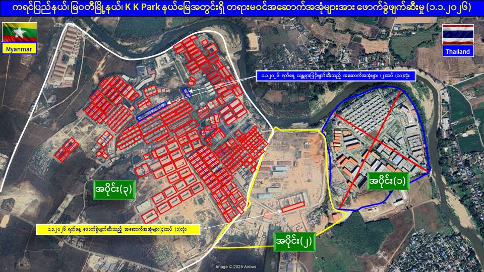 ယနေ့တွင် မြဝတီ-မဲထော်သလေး(KK Park)အပိုင်း(၃)နယ်မြေအတွင်းရှိ အွန်လိုင်း လိမ်လည်လောင်းကစားမှုများ ကျူးလွန်ရာတွင် အသုံးပြုခဲ့သည့် တရားမဝင် ၄ ထပ် အဆောက်အအုံ ၁ လုံး၊ ၂ ထပ်အဆောက်အအုံ ၁၀ လုံး စုစုပေါင်း တရားမဝင် အဆောက် အအုံ ၁၁ လုံးတို့ကို ထပ်မံဖြိုချဖျက်ဆီးခဲ့သဖြင့် KK Park နယ်မြေအတွင်းရှိ တရားမဝင် အဆောက်အအုံ စုစုပေါင်း ၆၃၅ လုံး အနက် ၅၄၉ လုံးကို စနစ်တကျ ဖြိုချဖျက်ဆီးပြီး ဖြစ်ကြောင်း သိရှိရသည်။