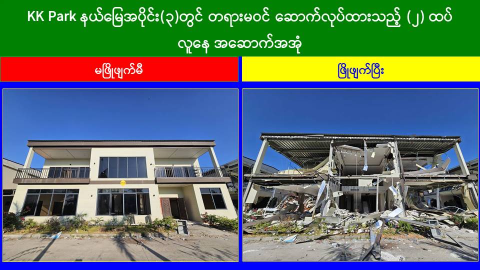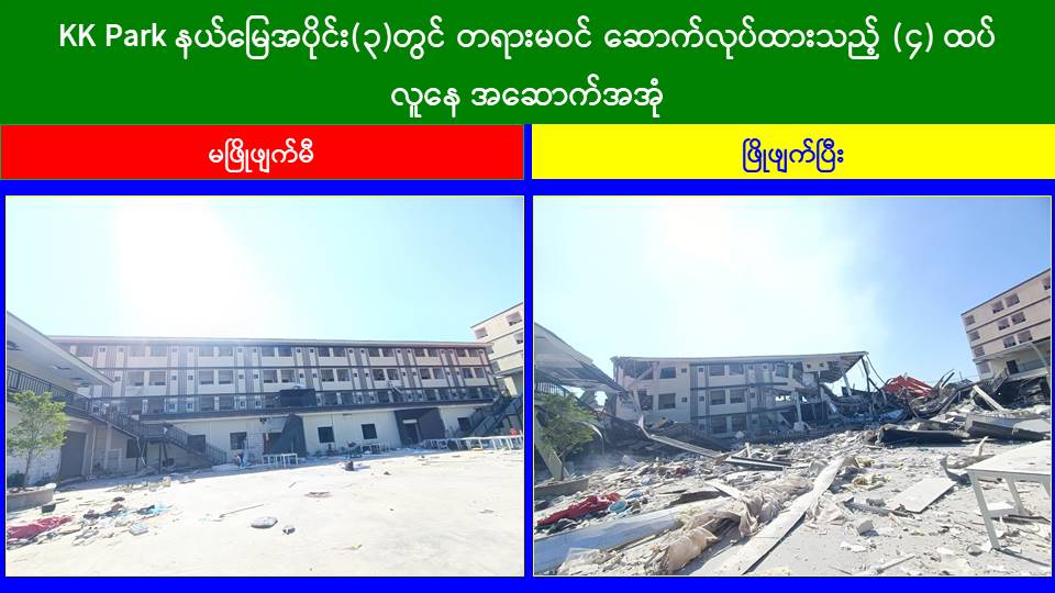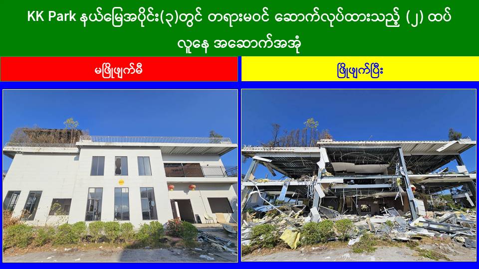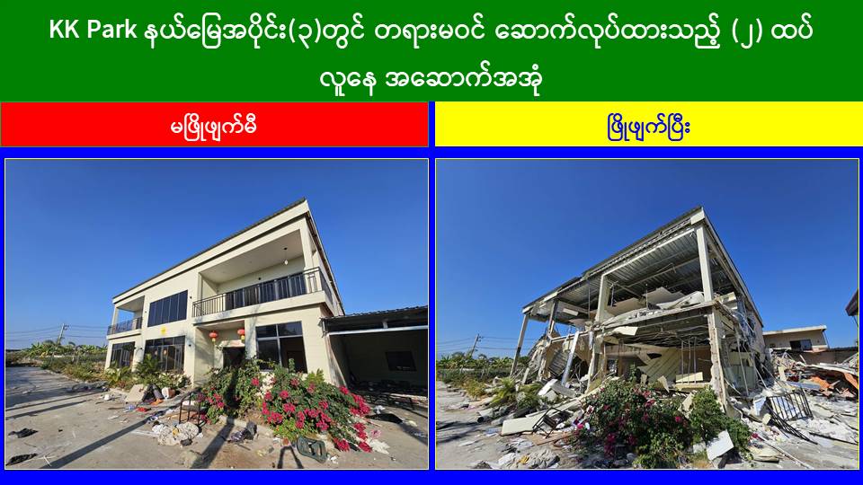 မြန်မာနိုင်ငံအစိုးရအနေဖြင့် အွန်လိုင်းလိမ်လည်လောင်းကစားမှုများ အများဆုံး အခြေချလုပ်ကိုင်လျက်ရှိကြသည့် ရွှေကုက္ကိုလ်နယ်မြေနှင့် KK Park နယ်မြေများရှိ တရားမဝင် အဆောက်အအုံများအတွင်း ဝင်ရောက်ရှင်းလင်း၍ အွန်လိုင်းလိမ်လည် လောင်းကစားမှုလုပ်ငန်းစဉ်များတွင် အသုံးပြုခဲ့သည့် သိမ်းဆည်းရမိပစ္စည်းများနှင့် တရား မဝင် အဆောက်အအုံများအား စနစ်တကျဖြိုချဖျက်ဆီးခြင်းများကို အဖွဲ့စုံပါဝင်သည့် ပူးပေါင်းအဖွဲ့ဖြင့် ဆောင်ရွက်လျက်ရှိရာ ယနေ့တွင်လည်း KK Park နယ်မြေအတွင်းရှိ တရားမဝင်အဆောက်အအုံ ၁၁ လုံးကို ထပ်မံဖြိုချဖျက်ဆီးခဲ့ကြောင်း သိရှိရသည်။