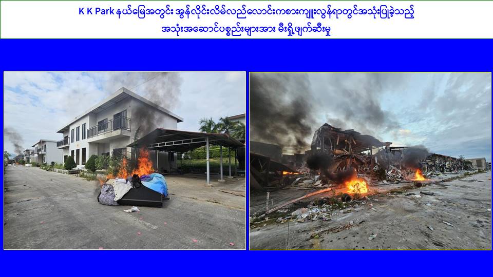 ၎င်းအပြင် KK park နယ်မြေအတွင်းရှိ အွန်လိုင်းလိမ်လည် လောင်းကစားမှု ကျူးလွန်ရာတွင် အသုံးပြုခဲ့သည့် ပစ္စည်းများအား ထပ်မံအသုံးပြုမှုမရှိစေရေးအတွက် ယနေ့တွင်လည်း စနစ်တကျမီးရှို့ဖျက်ဆီးခဲ့ကြောင်းနှင့် နိုင်ငံတော်အစိုးရအနေဖြင့် အွန်လိုင်းလိမ်လည် လောင်းကစားမှုကျူးလွန်မှုများကို အမျိုးသားရေးတာဝန်တစ်ရပ် အဖြစ်ခံယူကာ မြန်မာနိုင်ငံအတွင်း လုံးဝအခြေမပြုနိုင်ရေး ပြည်တွင်းအင်အားစုများ အပြင် အိမ်နီးချင်းနိုင်ငံအစိုးရများနှင့်လည်း ပေါင်းစပ်ညှိနှိုင်း၍ ဆက်လက်ဆောင်ရွက် သွားမည်ဖြစ်ကြောင်း သတင်းရရှိသည်။
