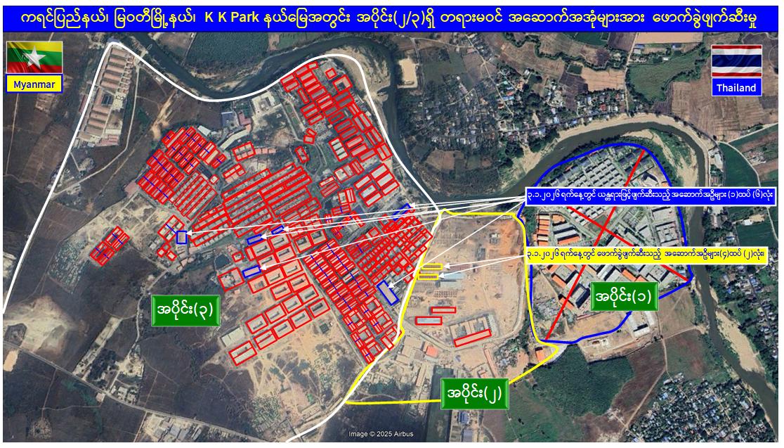 ယနေ့တွင် မြဝတီ-မဲထော်သလေး(KK Park)အပိုင်း(၃)နယ်မြေအတွင်းရှိ အွန်လိုင်း လိမ်လည်လောင်းကစားမှုများ ကျူးလွန်ရာတွင် အသုံးပြုခဲ့သည့် တရားမဝင် ၁ ထပ် အဆောက်အအုံ ၆ လုံးနှင့် အပိုင်း(၂)နယ်မြေအတွင်းရှိ အွန်လိုင်းလိမ်လည်လောင်းကစား မှုများ ကျူးလွန်ရာတွင် အသုံးပြုခဲ့သည့် တရားမဝင် ၄ ထပ် အဆောက်အအုံ ၂ လုံး၊ စုစုပေါင်း တရားမဝင် အဆောက်အအုံ ၈ လုံးတို့ကို ထပ်မံဖြိုချဖျက်ဆီးခဲ့သဖြင့် KK Park နယ်မြေအတွင်းရှိ တရားမဝင် အဆောက်အအုံ စုစုပေါင်း ၆၃၅ လုံး အနက် ၅၆၃ လုံးကို စနစ်တကျ ဖြိုချဖျက်ဆီးပြီး ဖြစ်ကြောင်း သိရှိရသည်။