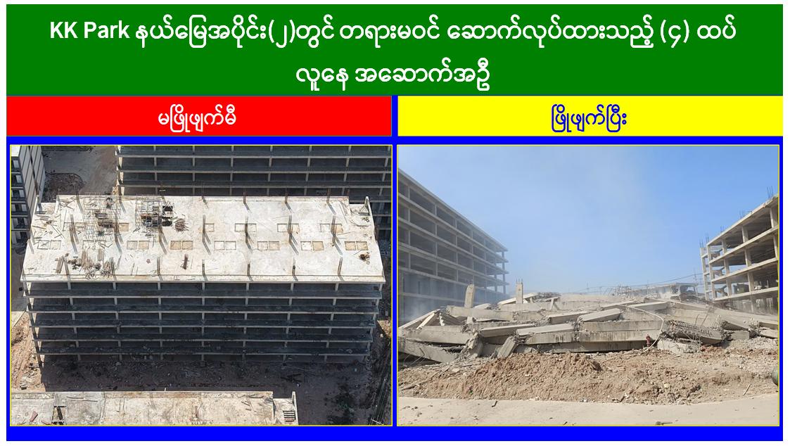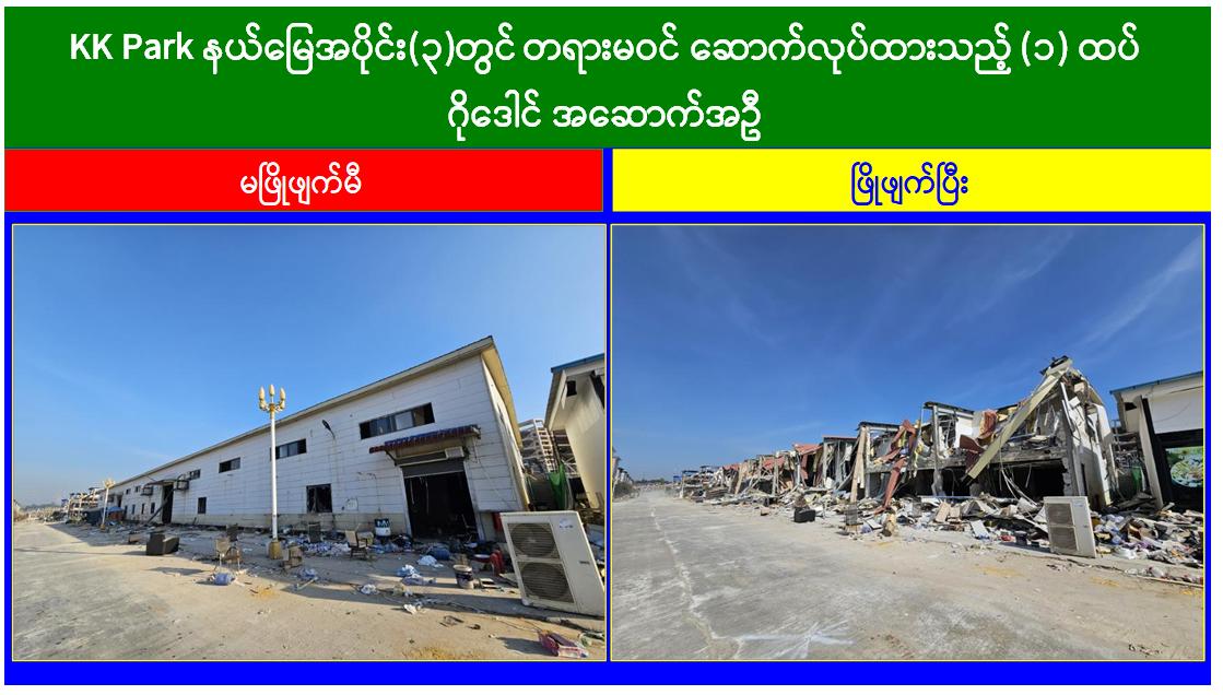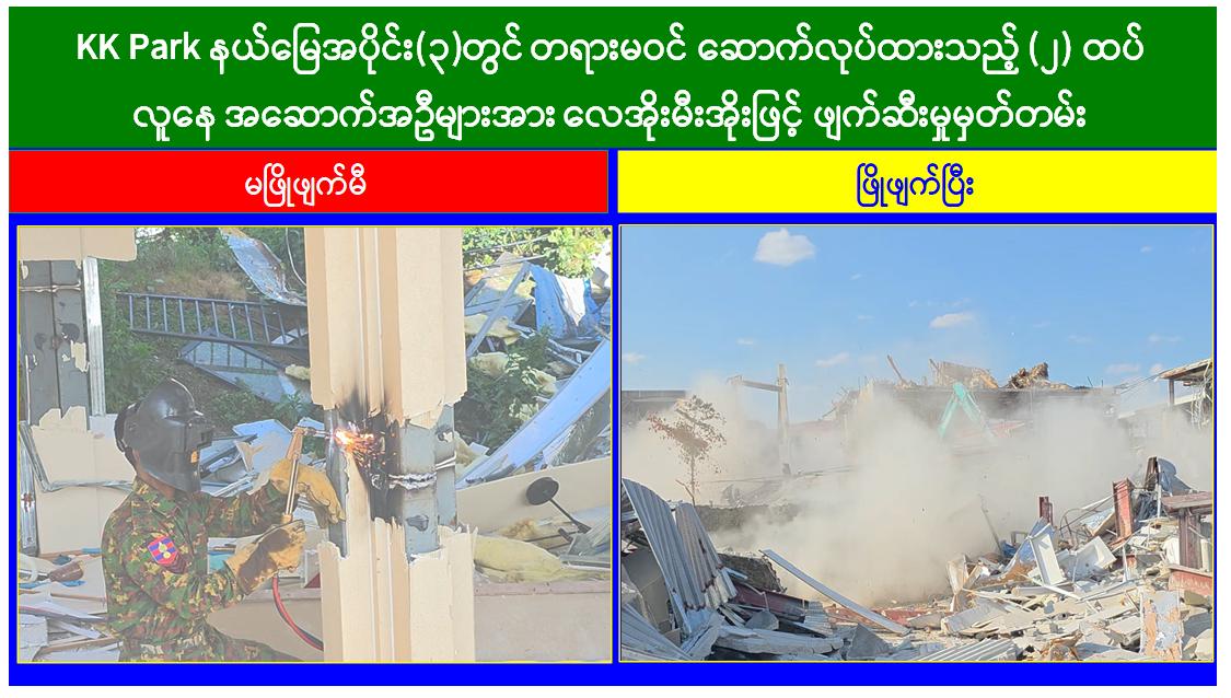 မြန်မာနိုင်ငံအစိုးရအနေဖြင့် အွန်လိုင်းလိမ်လည်လောင်းကစားမှုများ အများဆုံး အခြေချလုပ်ကိုင်လျက်ရှိကြသည့် ရွှေကုက္ကိုလ်နယ်မြေနှင့် KK Park နယ်မြေများရှိ တရားမဝင် အဆောက်အအုံများအတွင်း ဝင်ရောက်ရှင်းလင်း၍ အွန်လိုင်းလိမ်လည် လောင်းကစားမှုလုပ်ငန်းစဉ်များတွင် အသုံးပြုခဲ့သည့် သိမ်းဆည်းရမိပစ္စည်းများအား စနစ် တကျဖျက်ဆီးခြင်းနှင့် တရားမဝင်အဆောက်အအုံများအား စနစ်တကျဖြိုချ ဖျက်ဆီးခြင်း များကို အဖွဲ့စုံပါဝင်သည့် ပူးပေါင်းအဖွဲ့ဖြင့် ဆောင်ရွက်လျက်ရှိရာ ယနေ့တွင်လည်း KK Park နယ်မြေအတွင်းရှိ တရားမဝင်အဆောက်အအုံ ၈ လုံးကို ထပ်မံဖြိုချ ဖျက်ဆီး ခဲ့ကြောင်း သိရှိရသည်။