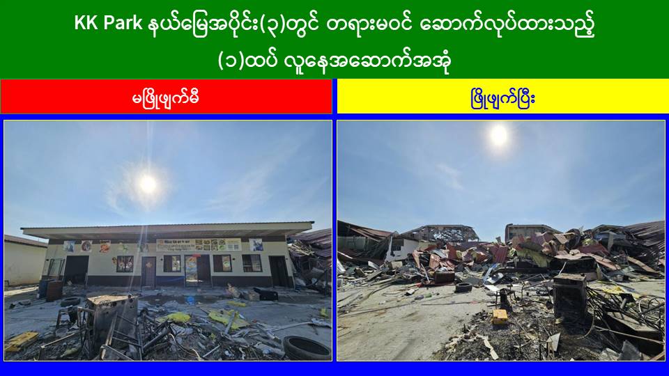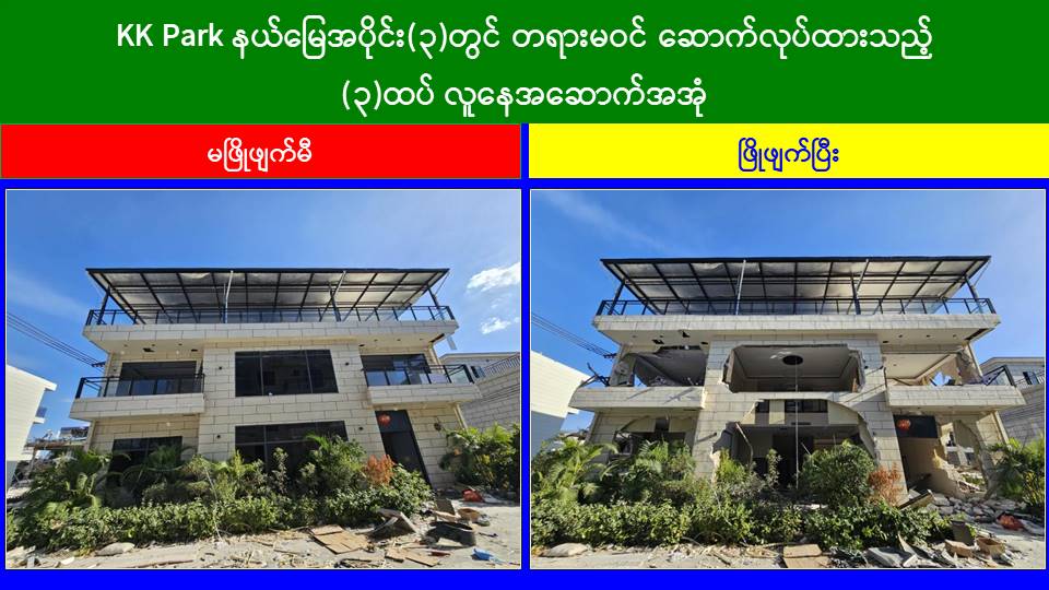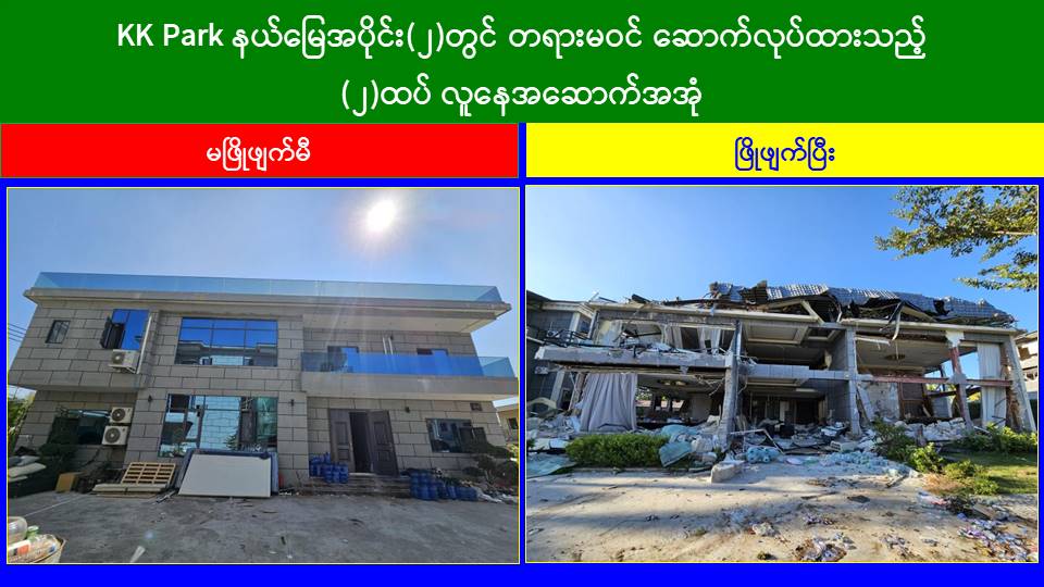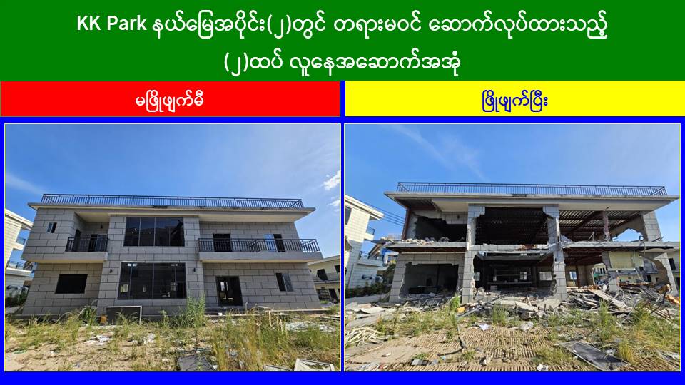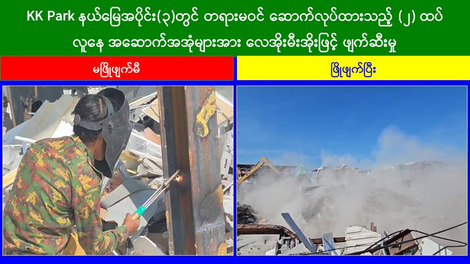 မြန်မာနိုင်ငံအစိုးရအနေဖြင့် အွန်လိုင်းလိမ်လည်လောင်းကစားမှုများ အများဆုံး အခြေချလုပ်ကိုင်လျက်ရှိကြသည့် ရွှေကုက္ကိုလ်နယ်မြေနှင့် KK Park နယ်မြေများရှိ တရားမဝင် အဆောက်အအုံများအတွင်း ဝင်ရောက်ရှင်းလင်း၍ အွန်လိုင်းလိမ်လည် လောင်းကစားမှုလုပ်ငန်းစဉ်များတွင် အသုံးပြုခဲ့သည့် သိမ်းဆည်းရမိပစ္စည်းများအား စနစ်တကျ ဖျက်ဆီးခြင်းနှင့် တရားမဝင်အဆောက်အအုံများအား စနစ်တကျဖြိုချ ဖျက်ဆီးခြင်းများကို အဖွဲ့စုံပါဝင်သည့် ပူးပေါင်းအဖွဲ့ဖြင့် ဆောင်ရွက်လျက်ရှိရာ ယနေ့တွင် လည်း KK Park နယ်မြေအတွင်းရှိ တရားမဝင်အဆောက်အအုံ ၂၁ လုံးကို ထပ်မံဖြိုချ ဖျက်ဆီးခဲ့ကြောင်း သိရှိရသည်။