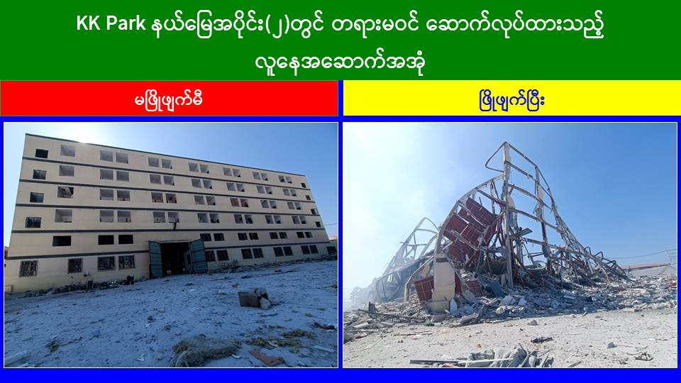 ယနေ့တွင် မြဝတီ-မဲထော်သလေး(KK Park)အပိုင်း(၃)နယ်မြေအတွင်းရှိ အွန်လိုင်း လိမ်လည်လောင်းကစားမှုများ ကျူးလွန်ရာတွင် အသုံးပြုခဲ့သည့် တရားမဝင် ၁ ထပ် အဆောက်အအုံ ၅ လုံး၊ ၃ ထပ်အဆောက်အအုံ ၈ လုံးနှင့် အပိုင်း(၂)နယ်မြေအတွင်းရှိ အွန်လိုင်းလိမ်လည်လောင်းကစားမှုများ ကျူးလွန်ရာတွင် အသုံးပြုခဲ့သည့် တရားမဝင် ၂ ထပ် အဆောက်အအုံ ၅ လုံး၊ ၃ ထပ်အဆောက်အအုံ ၁ လုံး၊ ၅ ထပ်အဆောက်အအုံ ၂ လုံး၊ စုစုပေါင်း တရားမဝင် အဆောက်အအုံ ၂၁ လုံးတို့ကို ထပ်မံဖြိုချဖျက်ဆီးခဲ့သဖြင့် KK Park နယ်မြေအတွင်းရှိ တရားမဝင် အဆောက်အအုံ စုစုပေါင်း ၆၃၅ လုံး အနက် ၅၈၄ လုံးကို စနစ်တကျ ဖြိုချဖျက်ဆီးပြီး ဖြစ်ကြောင်း သိရှိရသည်။