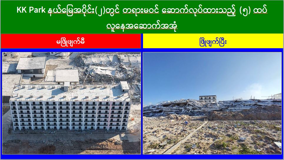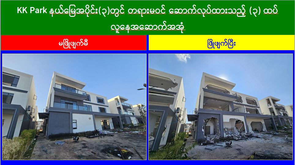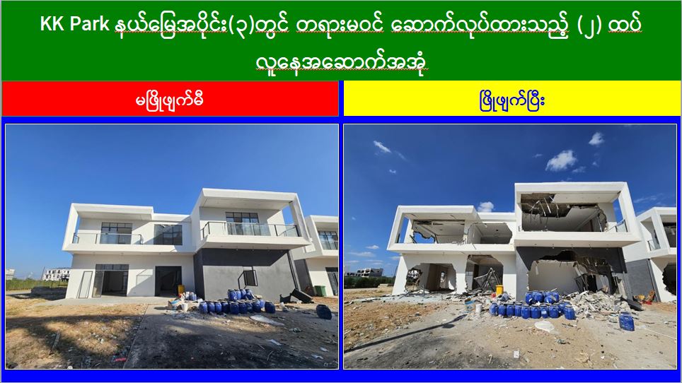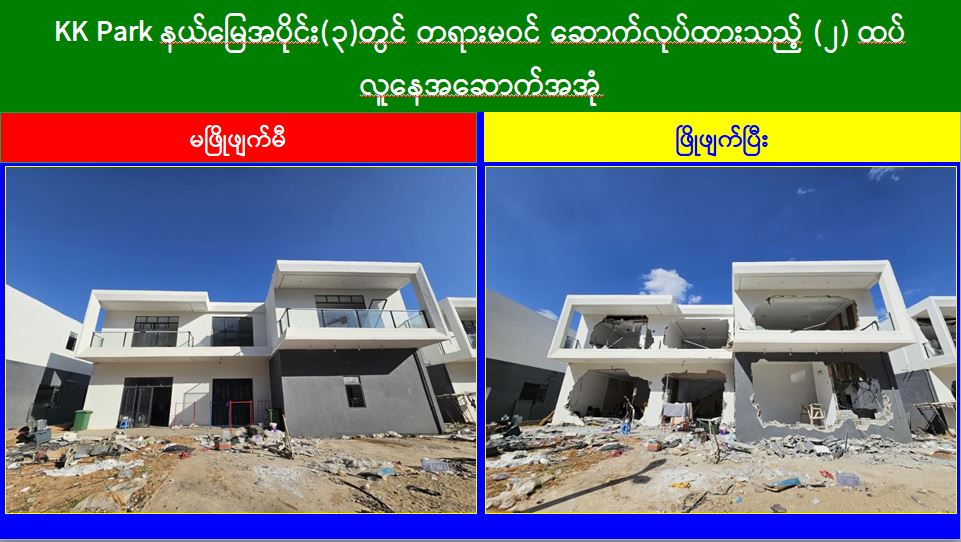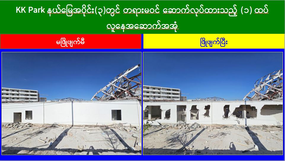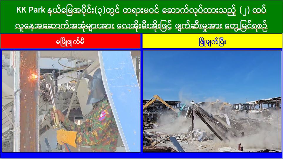 မြန်မာနိုင်ငံအစိုးရအနေဖြင့် အွန်လိုင်းလိမ်လည်လောင်းကစားမှုများ အများဆုံး အခြေချလုပ်ကိုင်လျက်ရှိကြသည့် ရွှေကုက္ကိုလ်နယ်မြေနှင့် KK Park နယ်မြေများရှိ တရားမဝင် အဆောက်အအုံများအတွင်း ဝင်ရောက်ရှင်းလင်း၍ အွန်လိုင်းလိမ်လည် လောင်းကစားမှုလုပ်ငန်းစဉ်များတွင် အသုံးပြုခဲ့သည့် သိမ်းဆည်းရမိပစ္စည်းများအား စနစ်တကျ ဖျက်ဆီးခြင်းနှင့် တရားမဝင်အဆောက်အအုံများအား စနစ်တကျဖြိုချ ဖျက်ဆီးခြင်းများကို အဖွဲ့စုံပါဝင်သည့် ပူးပေါင်းအဖွဲ့ဖြင့် ဆောင်ရွက်လျက်ရှိရာ ယနေ့တွင် လည်း KK Park နယ်မြေအတွင်းရှိ တရားမဝင်အဆောက်အအုံ ၂၆ လုံးကို ထပ်မံဖြိုချ ဖျက်ဆီးခဲ့ကြောင်း သိရှိရသည်။