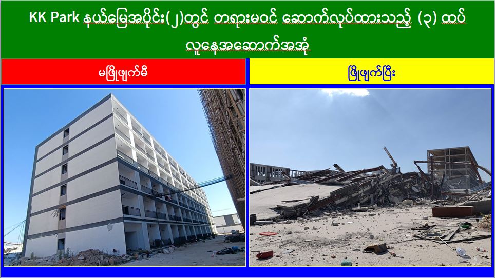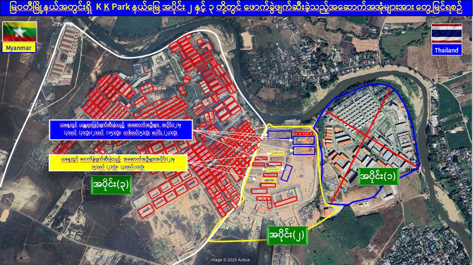 ယနေ့တွင် မြဝတီ-မဲထော်သလေး(KK Park) အပိုင်း (၂) နယ်မြေအတွင်းရှိ အွန်လိုင်းလိမ်လည်လောင်းကစားမှုများ ကျူးလွန်ရာတွင် အသုံးပြုခဲ့သည့် တရားမဝင် ၁ ထပ်အဆောက်အအုံ ၅ လုံး၊ ၂ ထပ် အဆောက်အအုံ ၁၅ လုံး၊ ၃ ထပ်အဆောက်အအုံ ၄ လုံး၊ ၅ ထပ်အဆောက်အအုံ ၂ လုံး၊ စုစုပေါင်း တရားမဝင် အဆောက်အအုံ ၂၆ လုံးတို့ကို ထပ်မံဖြိုချဖျက်ဆီးခဲ့သဖြင့် KK Park နယ်မြေအတွင်းရှိ တရားမဝင် အဆောက်အအုံ စုစုပေါင်း ၆၃၅ လုံး အနက် ၆၁၀ လုံးကို စနစ်တကျ ဖြိုချဖျက်ဆီးပြီး ဖြစ်ကြောင်း သိရှိရသည်။