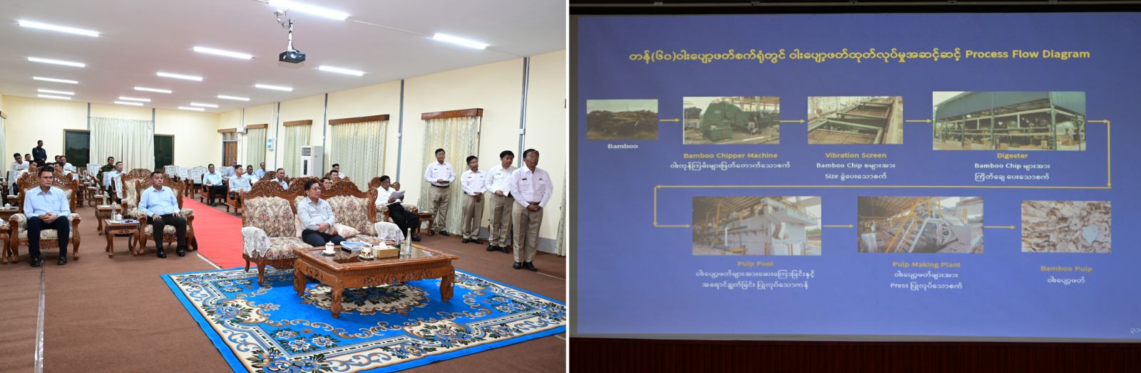 ဦးစွာ နိုင်ငံတော်လုံခြုံရေးနှင့် အေးချမ်းသာယာရေးကော်မရှင်ဥက္ကဋ္ဌ တပ်မတော် ကာကွယ်ရေးဦးစီးချုပ်အား တာဝန်ရှိသူများက စက်ရုံရှင်းလင်းဆောင်ခန်းမတွင် စက်ရုံ သမိုင်းအကျဉ်း၊ နိုင်ငံတော်ယာယီသမ္မတ နိုင်ငံတော်လုံခြုံရေးနှင့် အေးချမ်းသာယာ ရေး ကော်မရှင်ဥက္ကဋ္ဌ၏ လမ်းညွှန်မှာကြားချက်များအား လိုက်နာဆောင်ရွက်ပြီးစီးမှု၊ စက်ရုံဆိုင်ရာအချက်အလက်များနှင့် ဝန်ထမ်းများ ခန့်အပ်ထားရှိမှု၊ ဘဏ္ဍာရေးနှစ် အလိုက် ဝင်ငွေ၊ အသုံးစရိတ်နှင့် အမြတ်/အရှုံး နှိုင်းယှဉ်မှု၊ သတင်းစာစက္ကူများ ထုတ် လုပ်ခဲ့မှုနှင့် ဖြန့်ဖြူးရောင်းချမှု၊ တန်(၆၀)သတင်းစာစက္ကူစက်ရုံတွင် သတင်းစာထုတ် လုပ်မှုလုပ်ငန်းစဉ်များနှင့် ထုတ်လုပ်ဖြန့်ဖြူးလျက်ရှိမှု၊ တန်(၅၀)အဆင့်မြင့်စက္ကူစက်ရုံ တွင် အဆင့်မြင့်စက္ကူထုတ်လုပ်မှုလုပ်ငန်းစဉ်များနှင့် စမ်းသပ်ထုတ်လုပ်နေမှု၊ တန်(၆၀) ဝါး ပျော့ဖတ်စက်ရုံတွင် ဝါးပျော့ဖတ်များ စမ်းသပ်ထုတ်လုပ်လျက်ရှိမှု၊ တန်(၄၀) လောင်စာတောင့် စက်ရုံတွင် လောင်စာတောင့်များထုတ်လုပ်မှု လုပ်ငန်းစဉ်များနှင့် ထုတ်လုပ်နေမှု၊ ရည်မှန်းချက်တာဝန်များကို ဆက်လက်အကောင်အထည်ဖော်ဆောင် ရွက်သွားမည့်အခြေအနေများနှင့်ပတ်သက်၍ ရှင်းလင်းတင်ပြကြသည်။