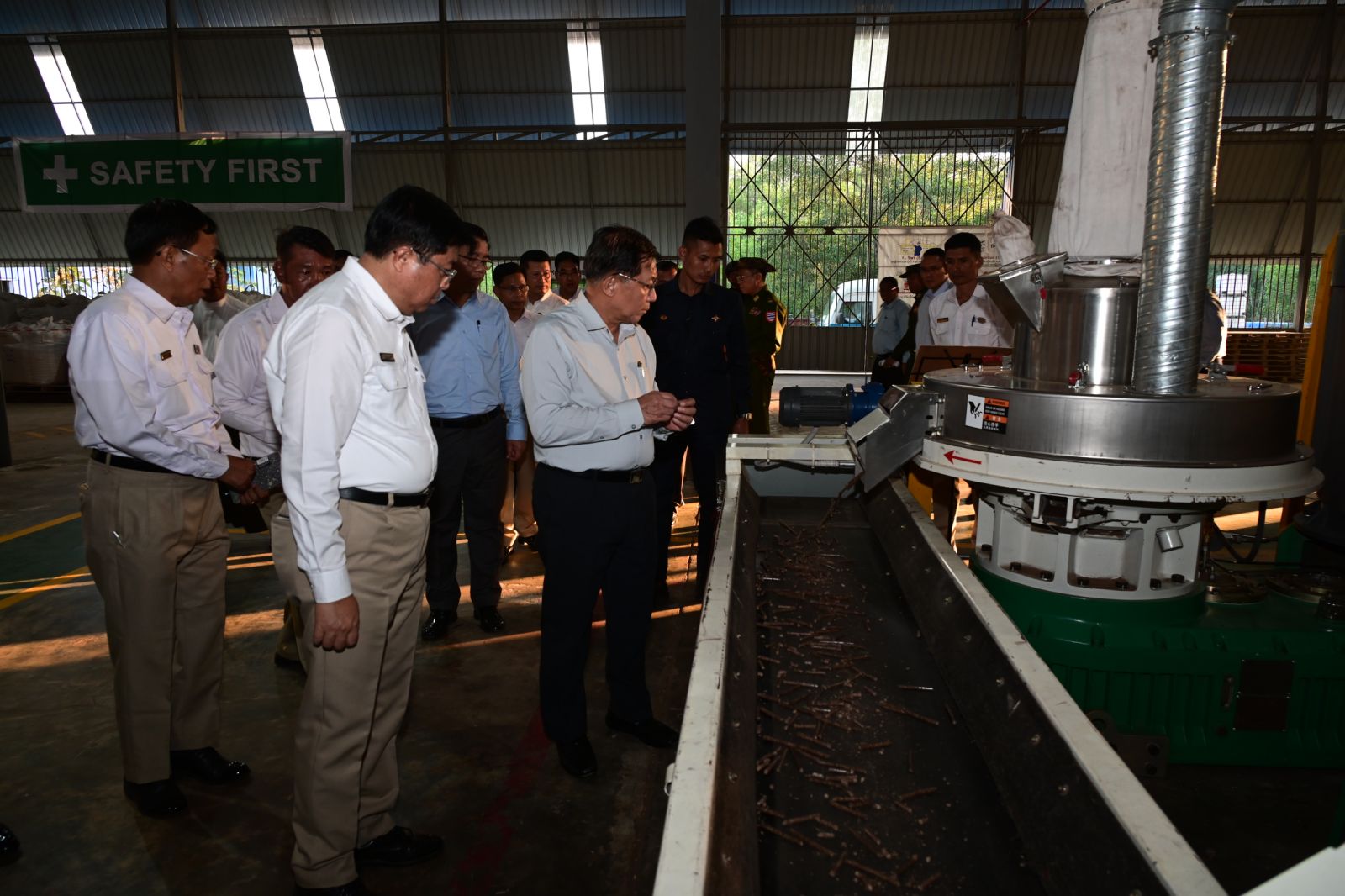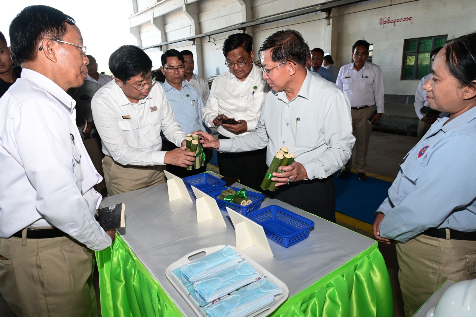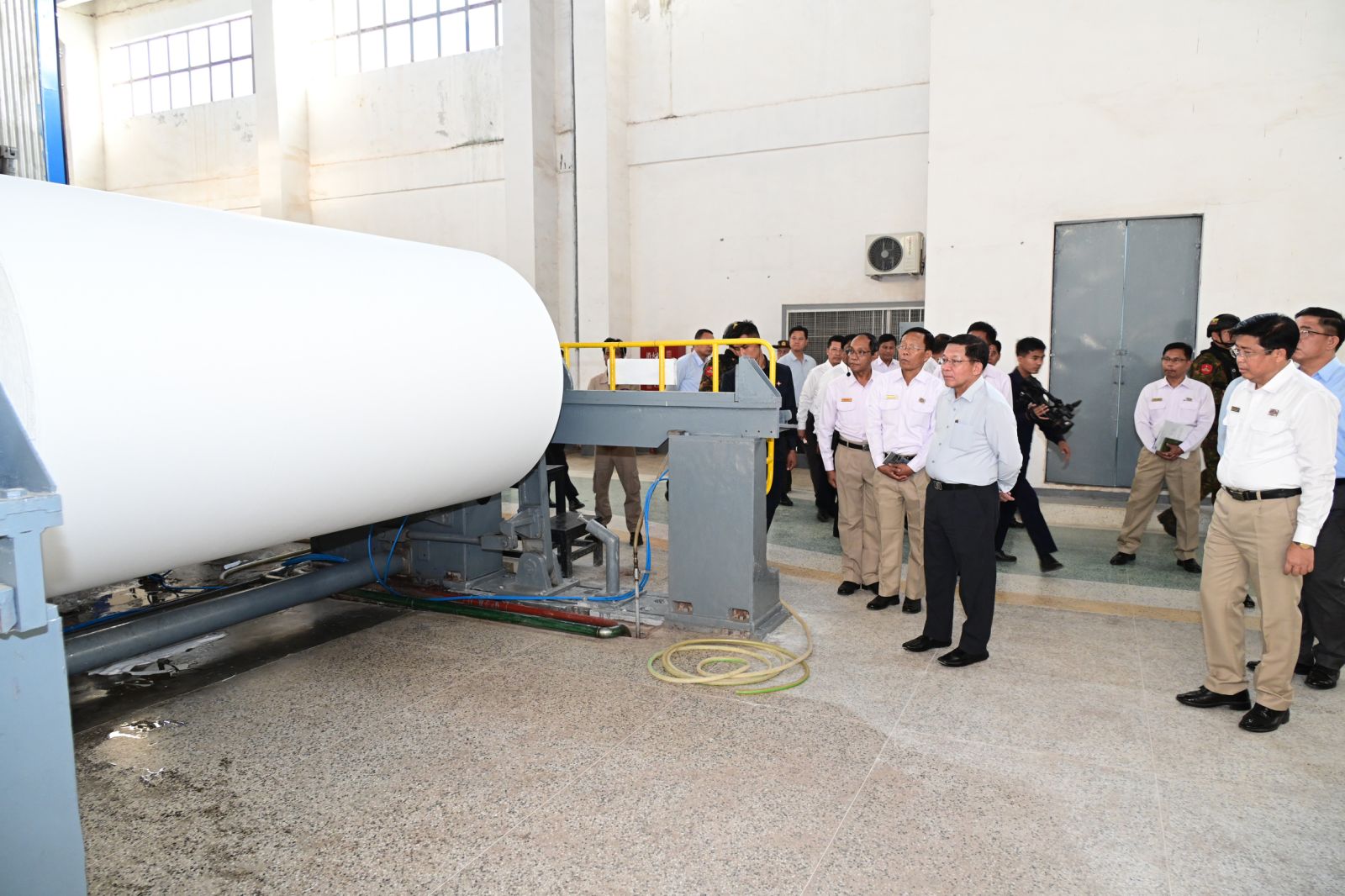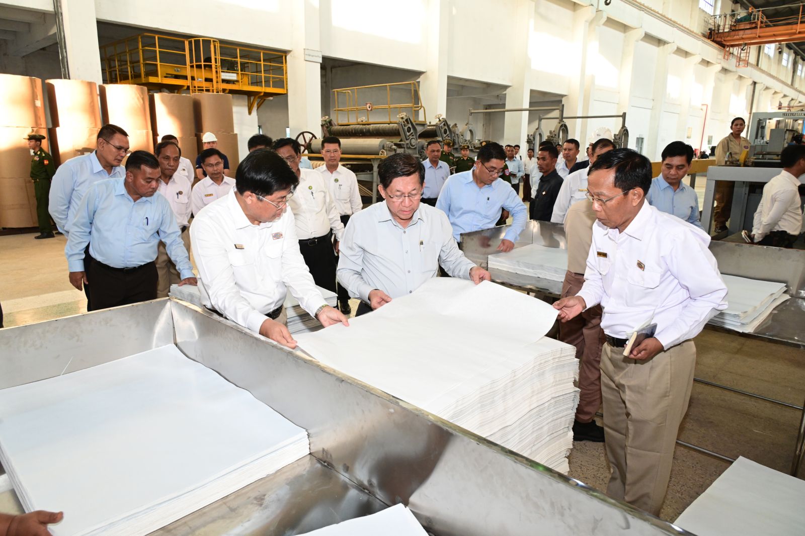 ထို့နောက် နိုင်ငံတော်လုံခြုံရေးနှင့် အေးချမ်းသာယာရေး ကော်မရှင်ဥက္ကဋ္ဌ တပ်မတော်ကာကွယ်ရေးဦးစီးချုပ်နှင့် အဖွဲ့ဝင်များသည် ဝါးပျော့ဖတ်ထုတ်လုပ်ရေး စက်ရုံ၌ ဝါးကုန် ကြမ်းများအား အဆင့်ဆင့်ကြိတ်ခွဲခြင်း၊ ရေနွေးငွေ့ဖြင့် ပေါင်းခံခြင်း၊ အရောင်ချွတ်ခြင်း လုပ်ငန်းများနှင့် ပျော့ဖတ်ရရှိလာမှု လုပ်ငန်းစဉ်အဆင့်ဆင့် ဆောင် ရွက်နေမှုအခြေအနေတို့ကိုလည်းကောင်း၊ တန်(၅၀)အဆင့်မြင့်စက္ကူစက်ရုံတွင် အဆင့် မြင့် စက္ကူထုတ်လုပ်မှု လုပ်ငန်းစဉ်အဆင့်ဆင့်နှင့် ထုတ်လုပ်ထားသည့် အဆင့်မြင့်စက္ကူ များ ကိုလည်းကောင်း၊ တန်(၆၀)သတင်းစာစက္ကူစက်ရုံတွင် သတင်းစာစက္ကူထုတ်လုပ် နေမှု လုပ်ငန်းစဉ်အဆင့်ဆင့်ကိုလည်းကောင်း၊ စွမ်းအင်လောင်စာတောင့်စက်ရုံတွင် လောင်စာတောင့် ထုတ်လုပ်နေမှုအဆင့်ဆင့်ကိုလည်းကောင်း စက်ရုံတစ်ခုချင်းစီ အလိုက် အသီးသီးလိုက်လံကြည့်ရှုစစ်ဆေးခဲ့ပြီး တာဝန်ရှိသူများ၏တင်ပြချက်များ အပေါ် လိုအပ်သည်များ လမ်းညွှန်မှာကြားခဲ့ကြောင်း သတင်းရရှိသည်။